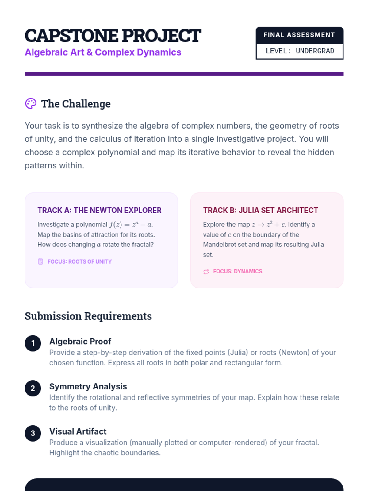 An undergraduate-level exploration of the roots of unity, connecting algebraic solutions of polynomial equations to geometric symmetry in the complex plane and the fractal nature of complex iteration.