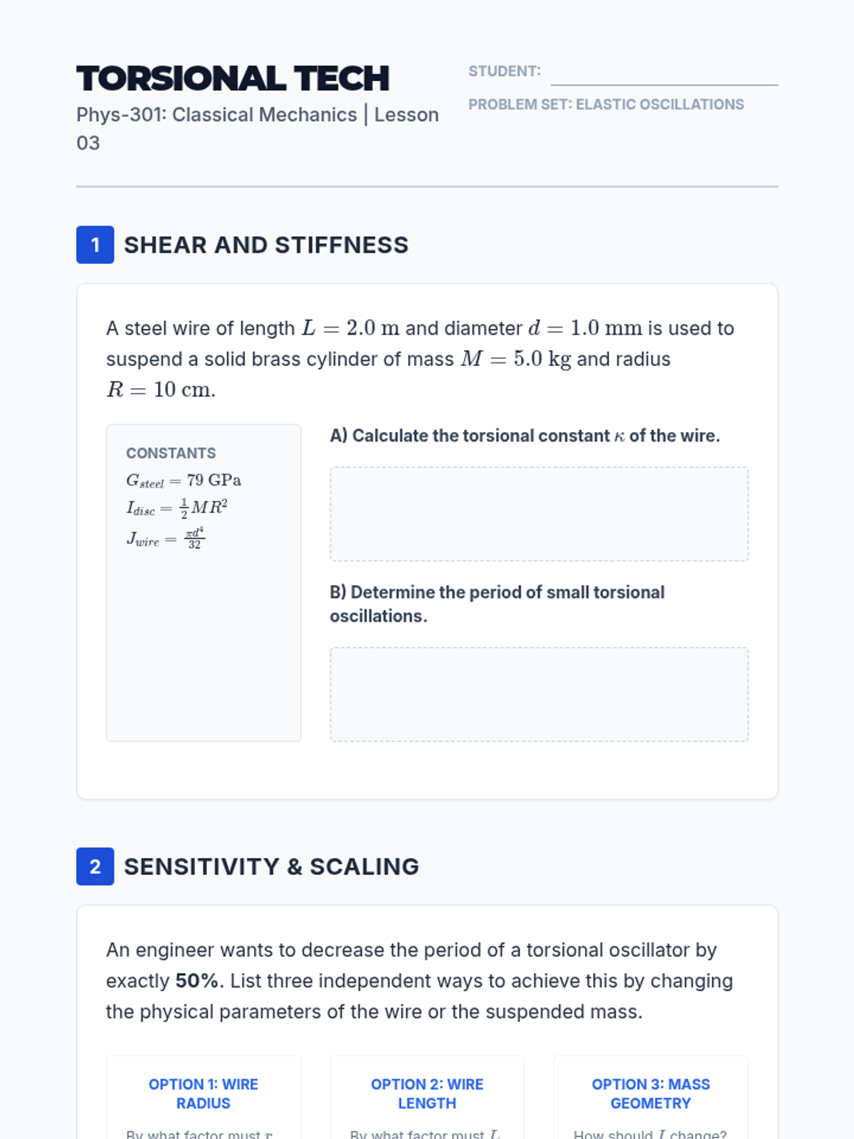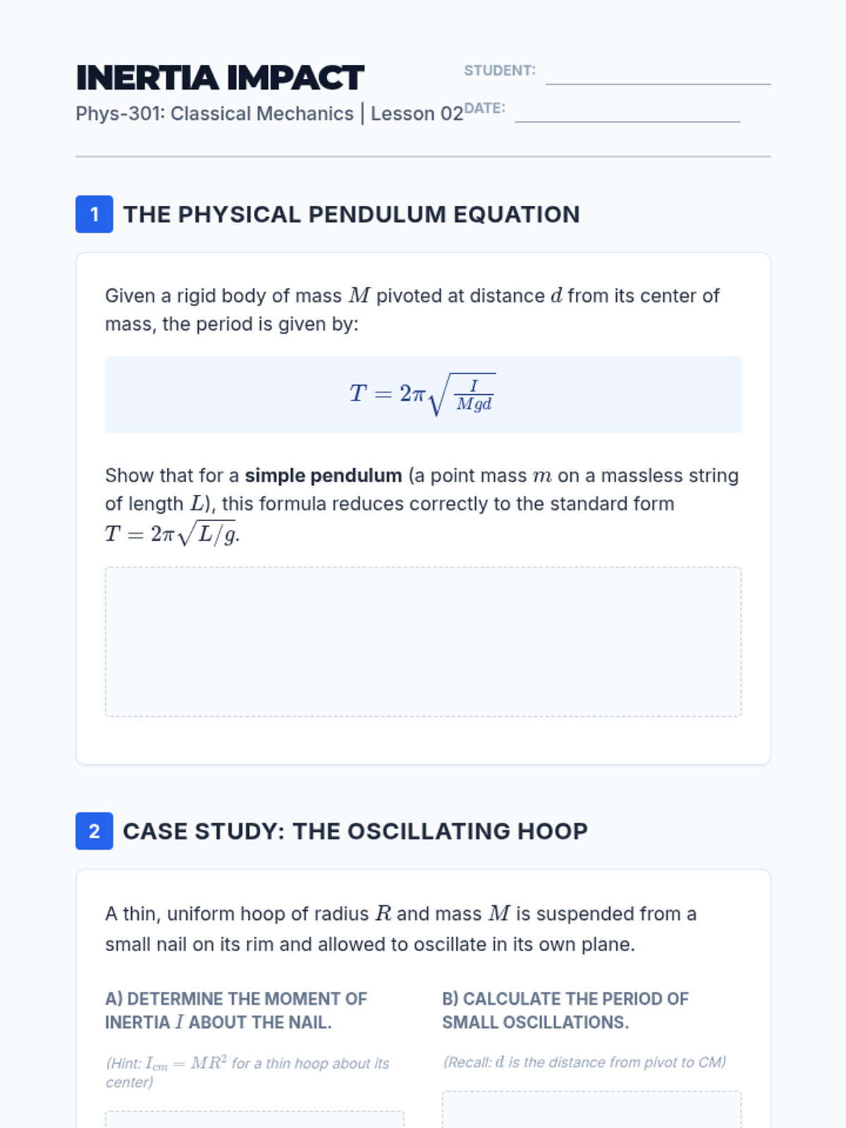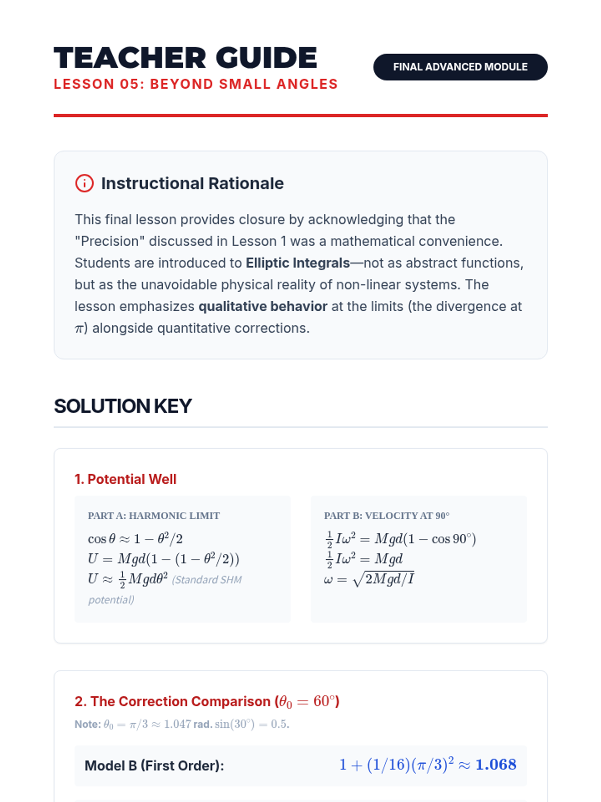 This sequence explores angular simple harmonic motion through the study of simple, physical, and torsional pendulums. It emphasizes the small-angle approximation, Taylor series expansions, and rigid body dynamics, concluding with non-linear effects at large amplitudes.