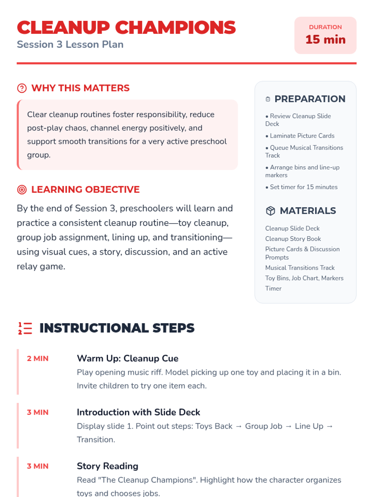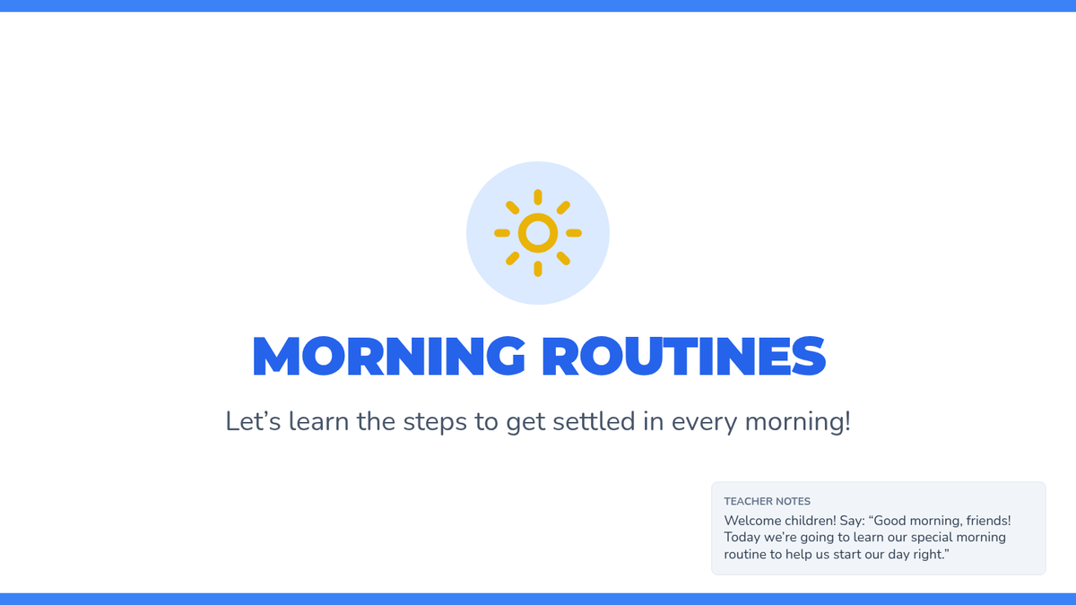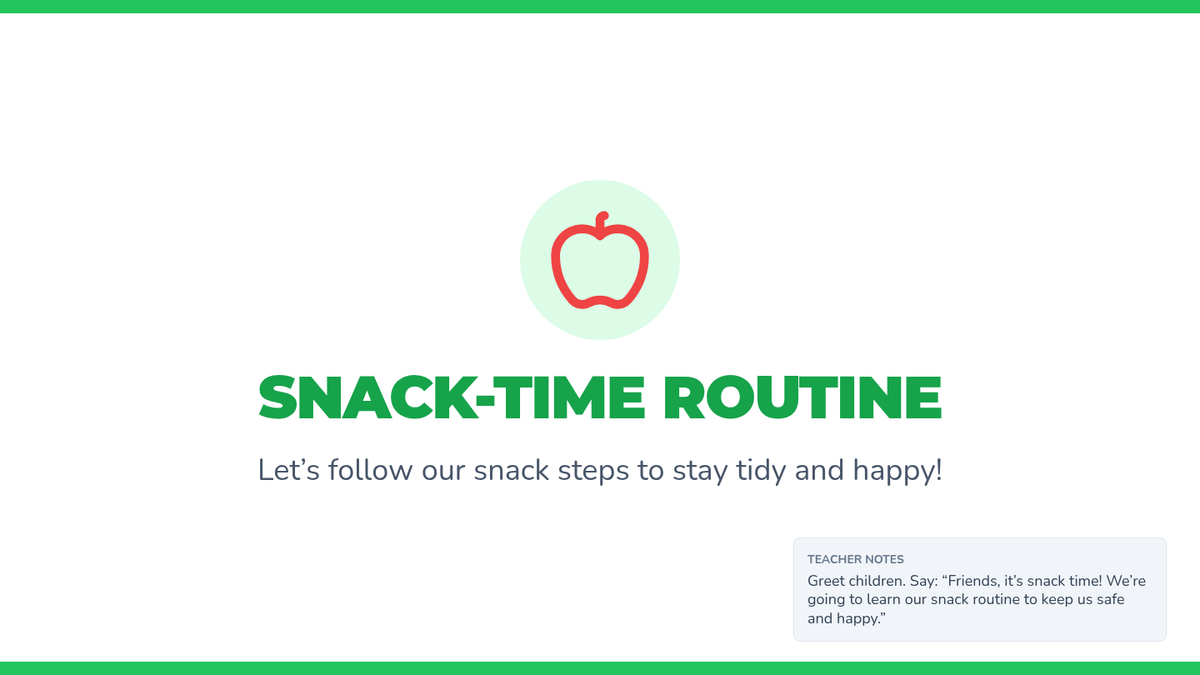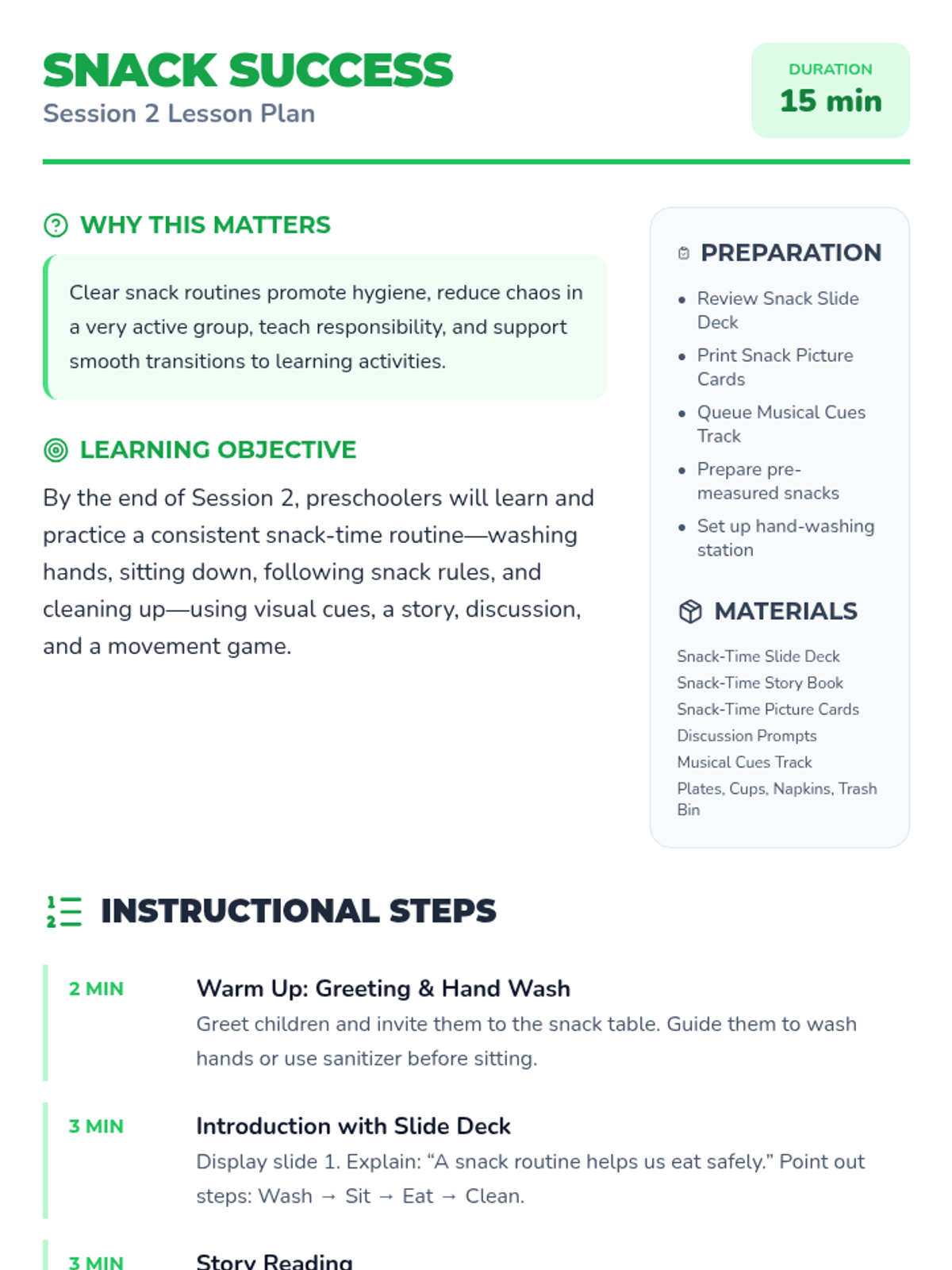A comprehensive sequence designed to teach preschoolers essential classroom routines (Morning, Snack, and Cleanup) through stories, games, and visual aids.