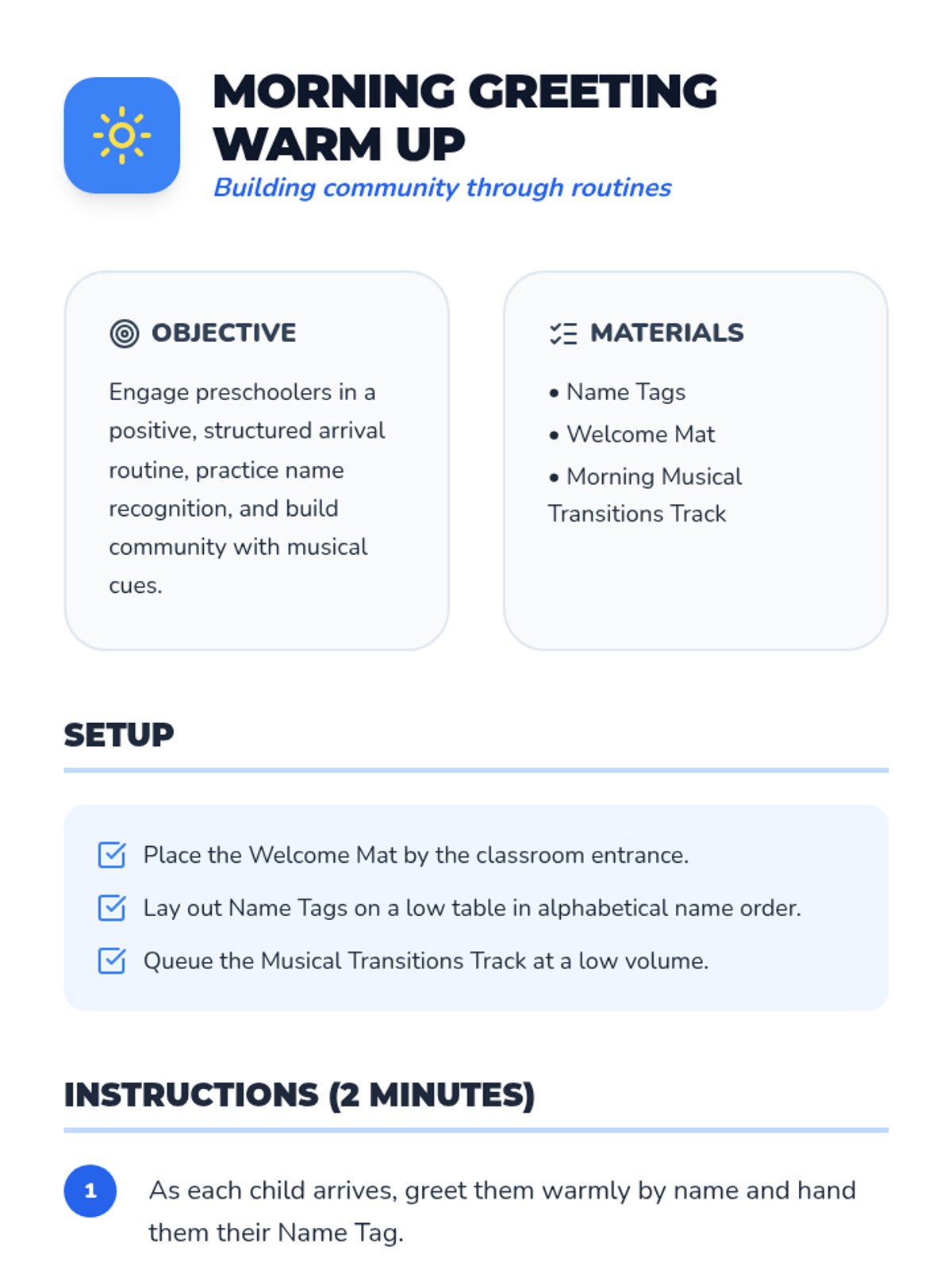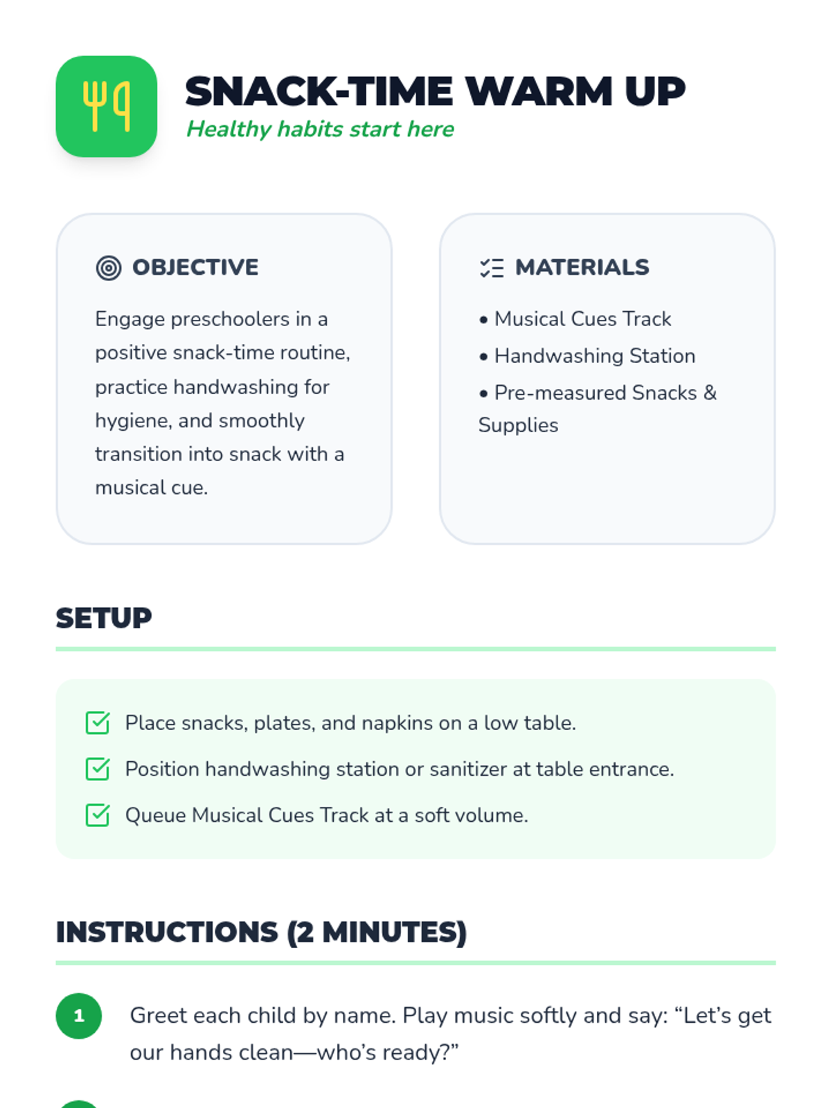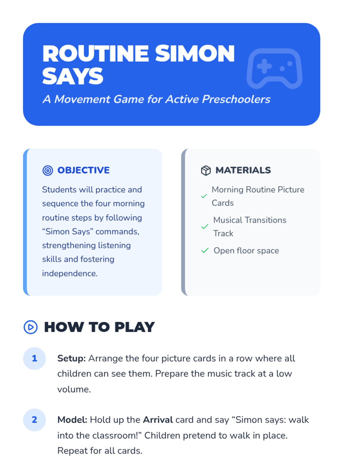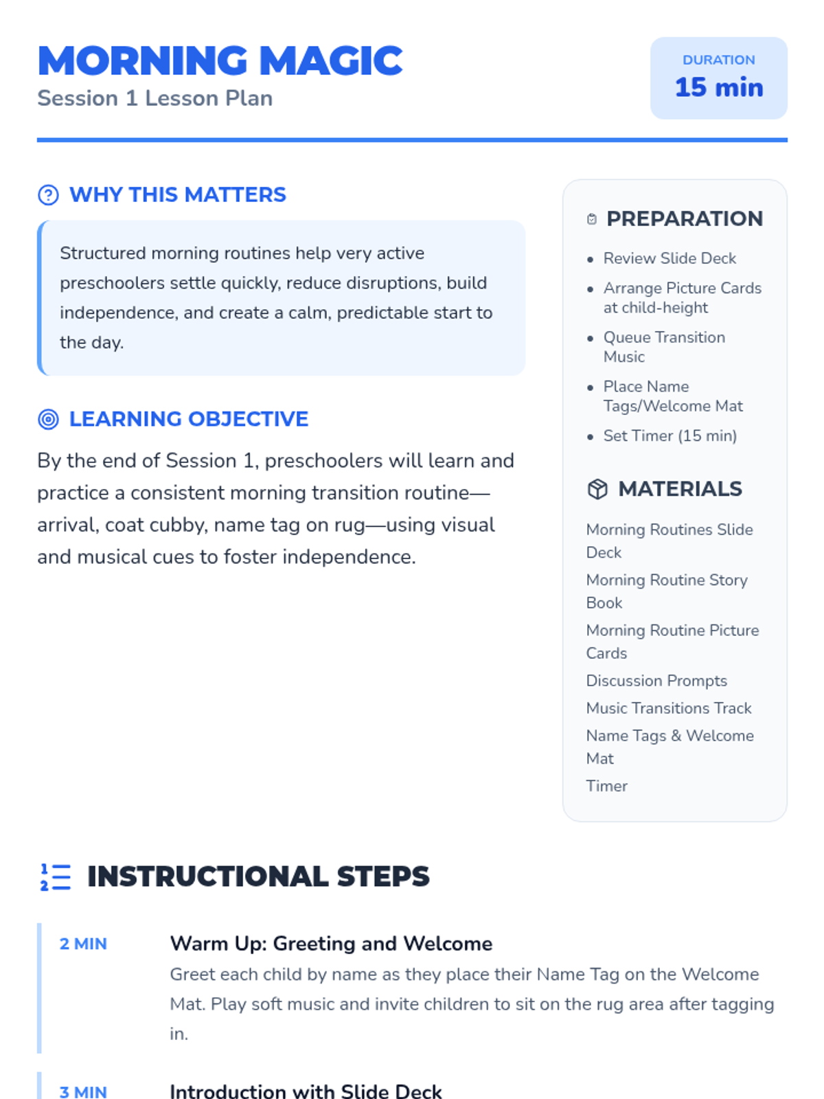 A comprehensive sequence designed to teach preschoolers essential classroom routines (Morning, Snack, and Cleanup) through stories, games, and visual aids.