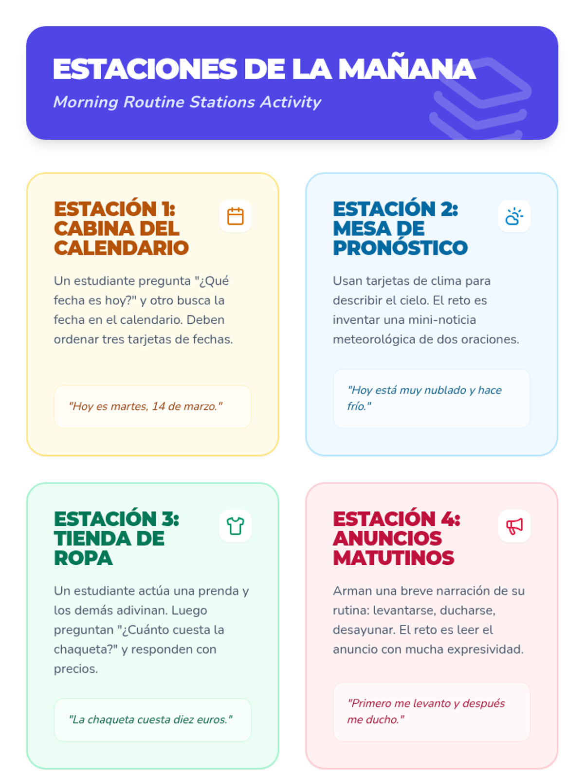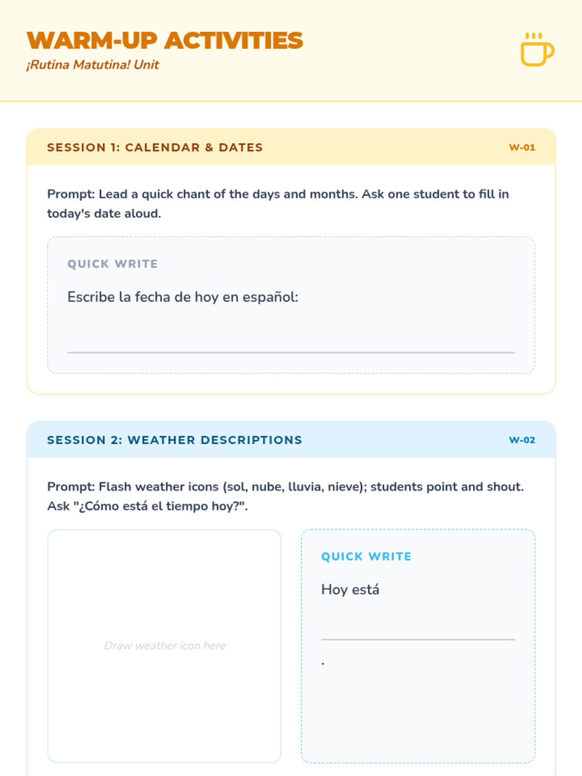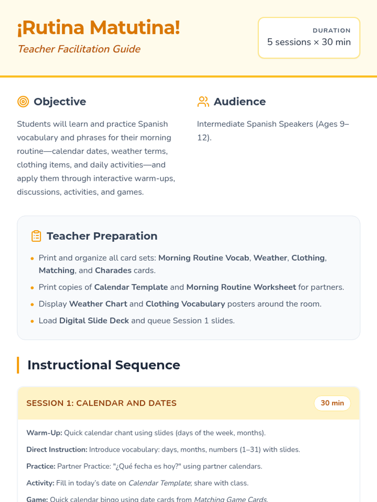 A 5-session Spanish language unit for intermediate students aged 9-12, focusing on morning routines, calendar dates, weather, clothing, and daily verbs through communicative activities and games.