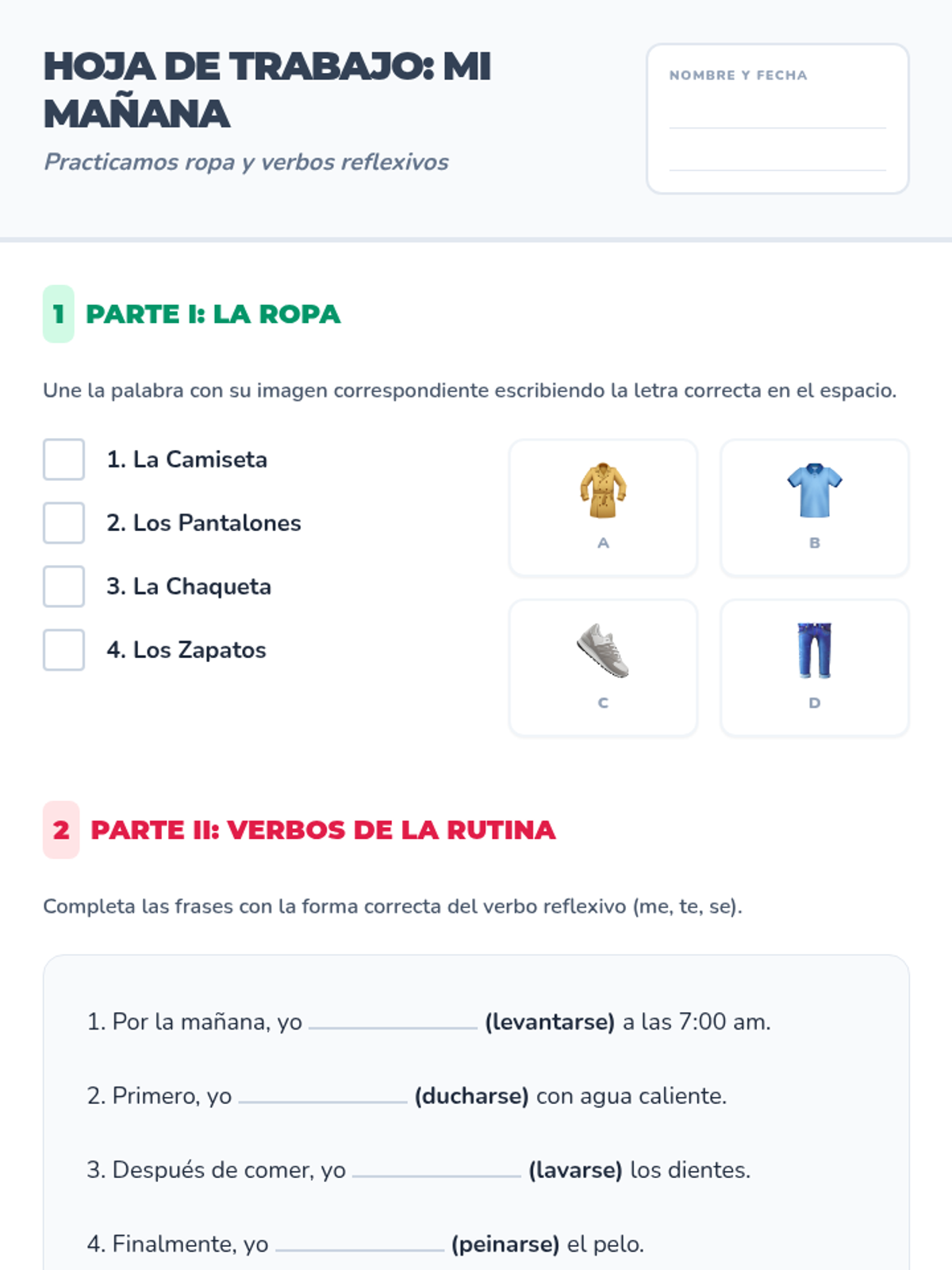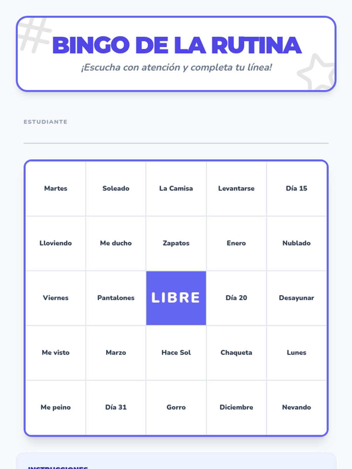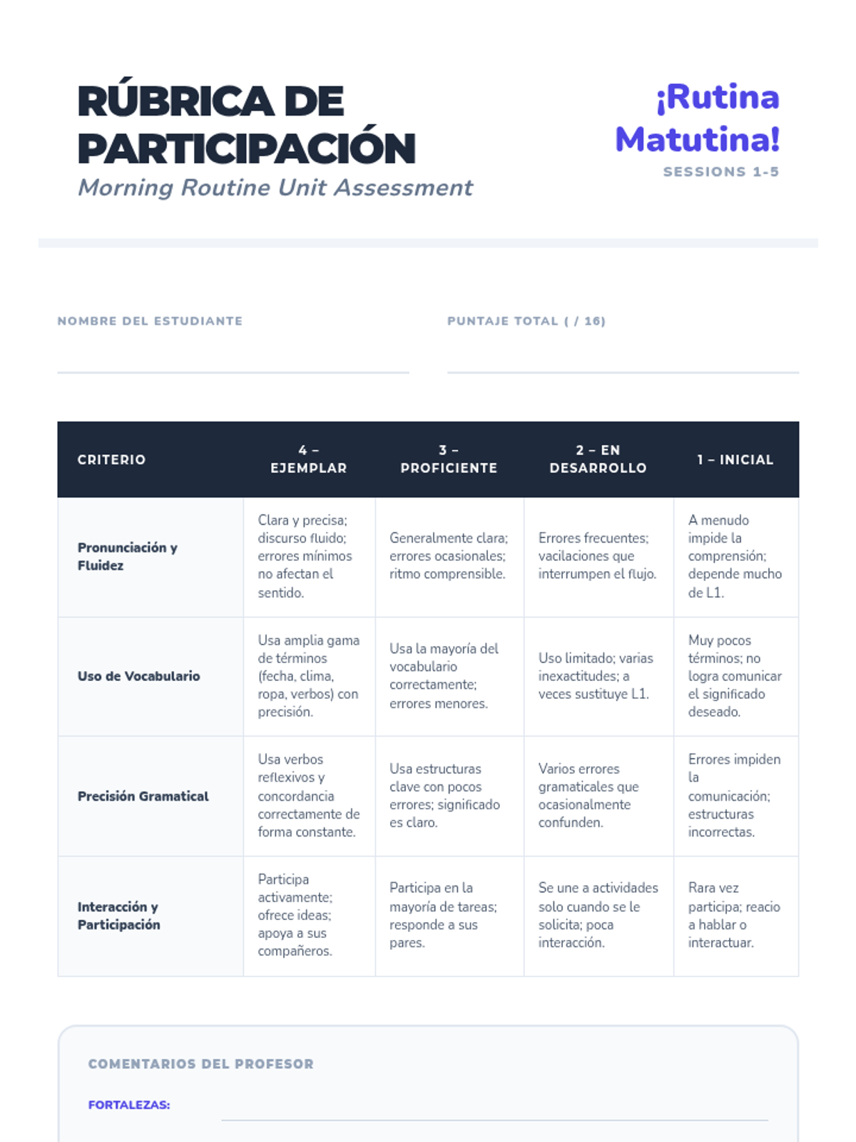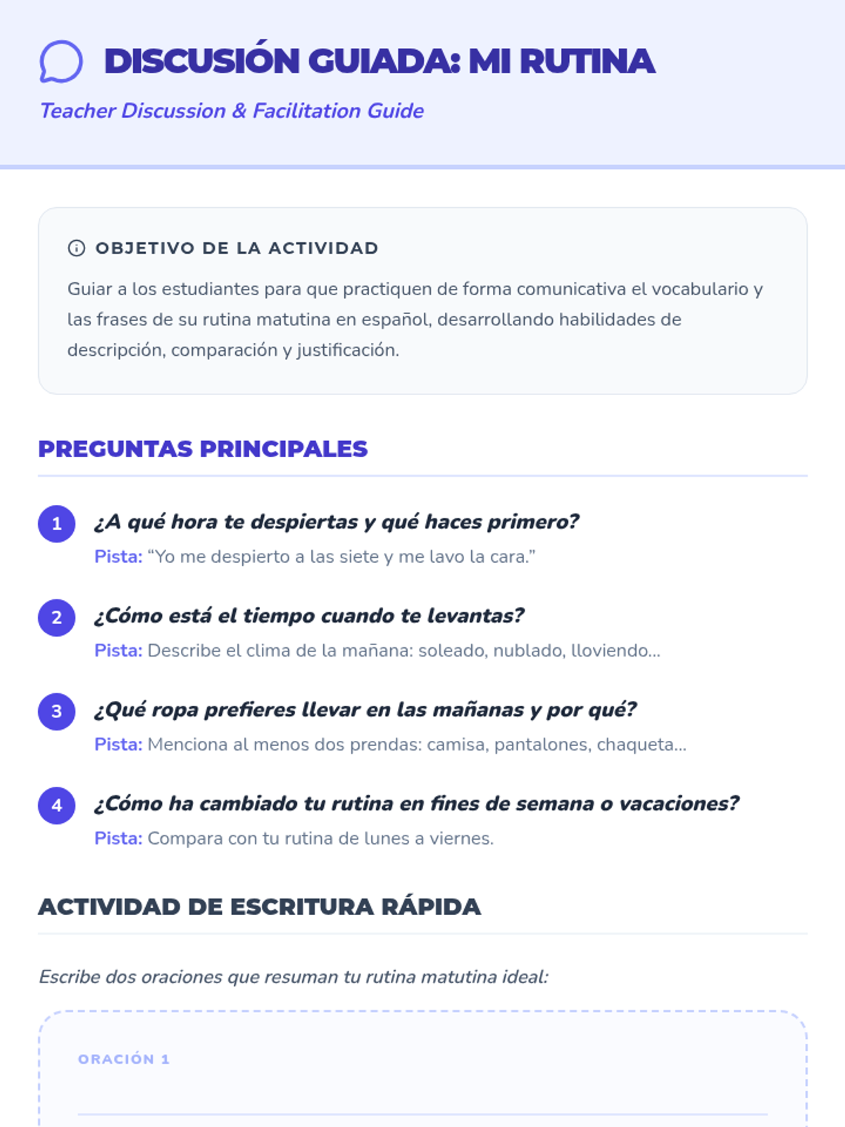 A 5-session Spanish language unit for intermediate students aged 9-12, focusing on morning routines, calendar dates, weather, clothing, and daily verbs through communicative activities and games.