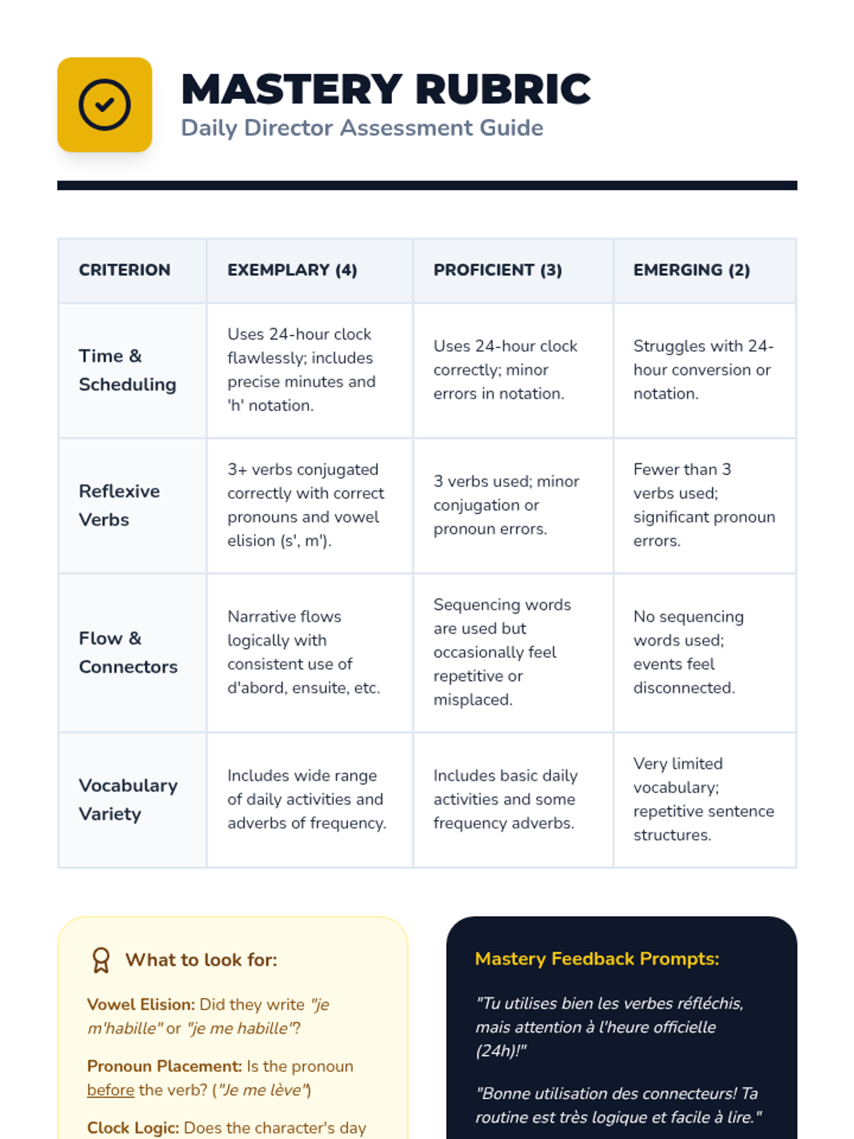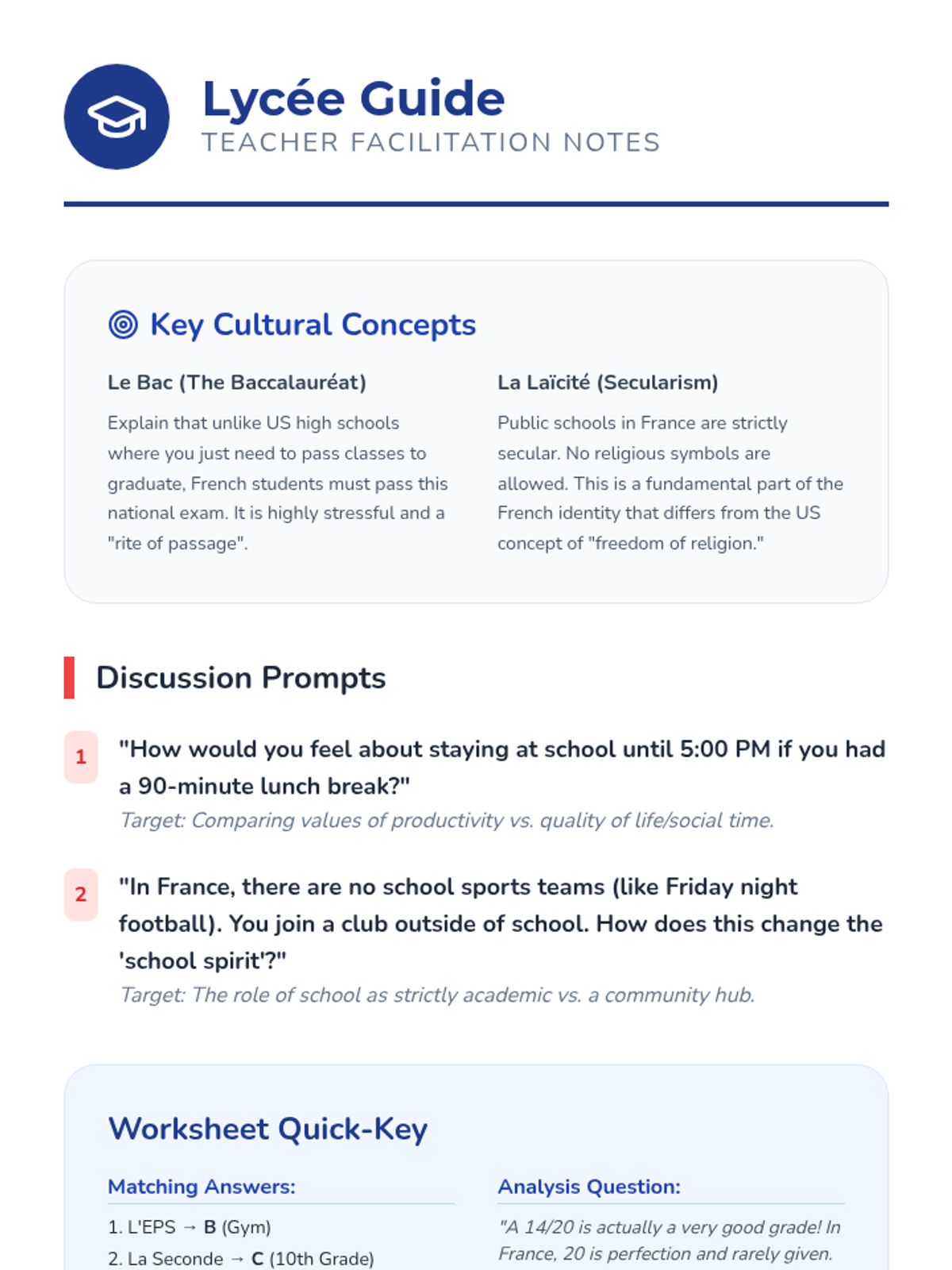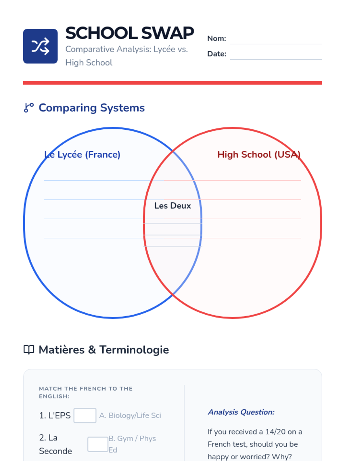 This sequence immerses 10th-grade French students in the daily rhythm of Francophone life, covering time-telling, school systems, and daily routines. Students compare French and American lifestyles while mastering the 24-hour clock and reflexive verbs.