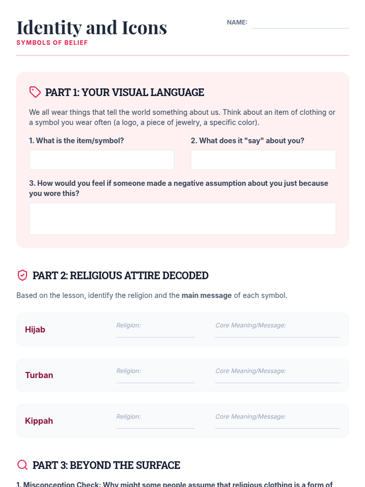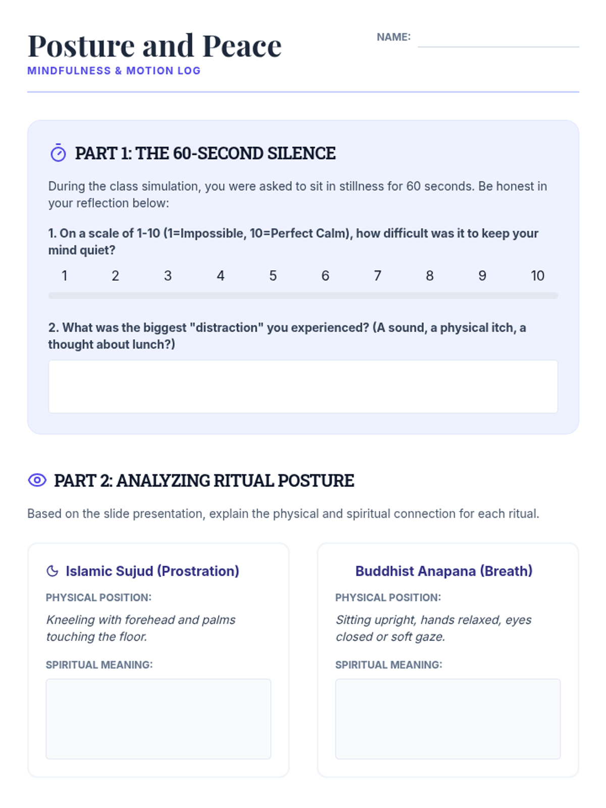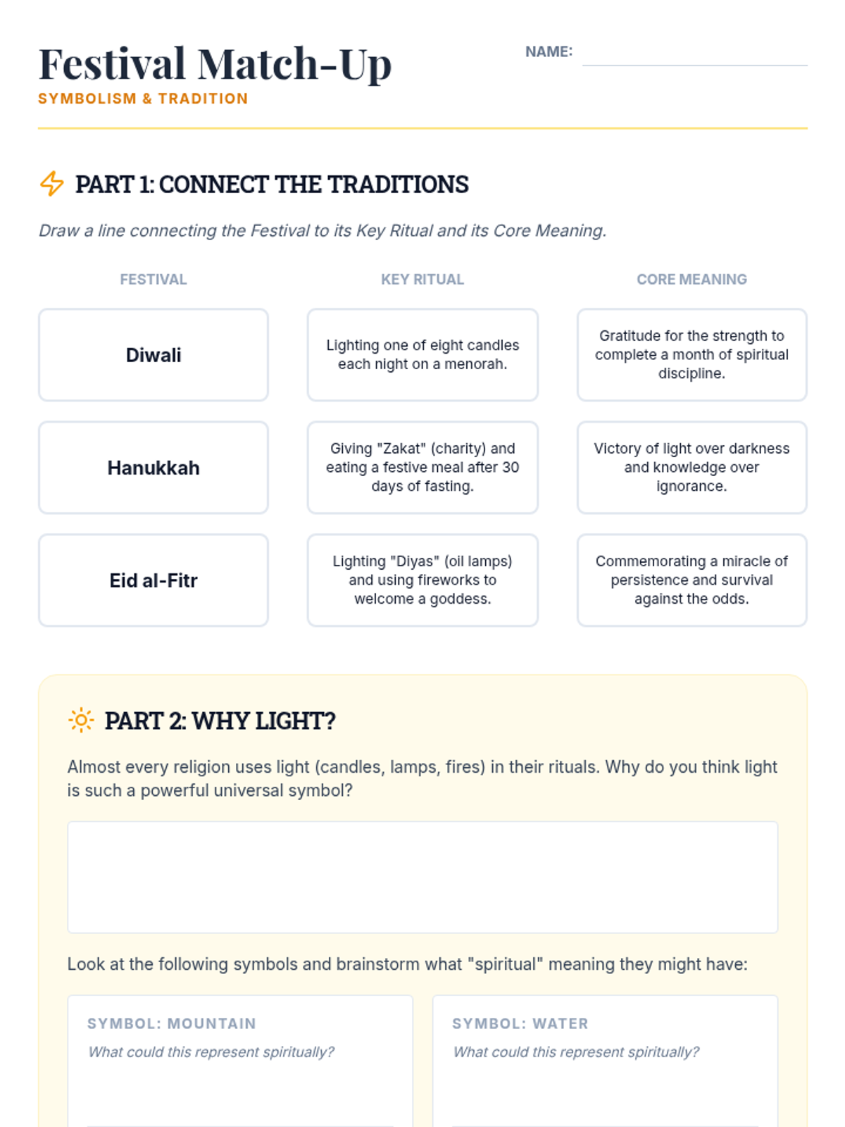 This sequence explores the lived experience of world religions through the lens of rituals, traditions, and daily practices. Students compare rites of passage, dietary laws, festivals, prayer methods, and religious attire to understand how abstract beliefs are expressed through tangible actions.