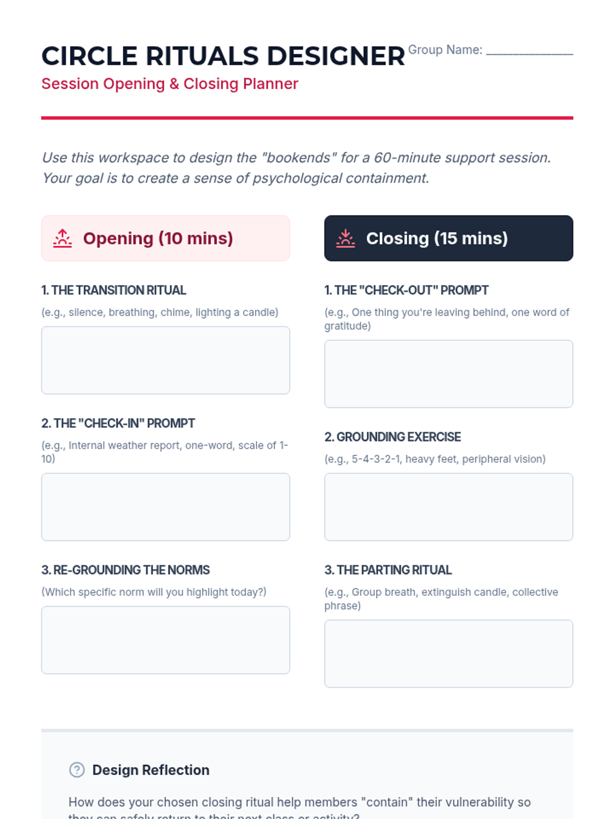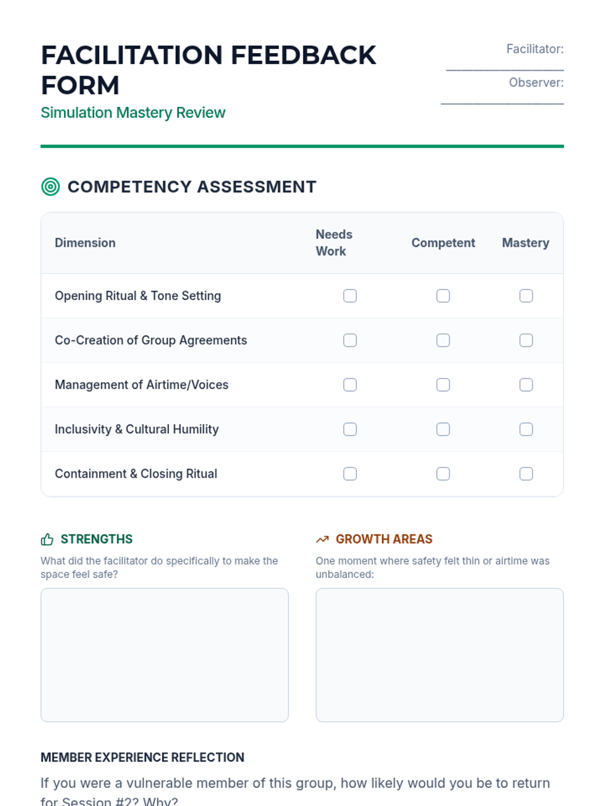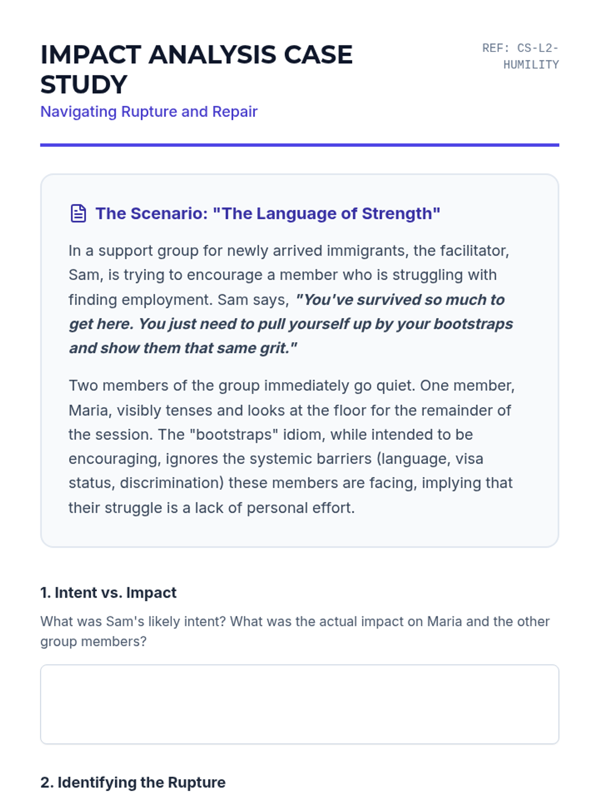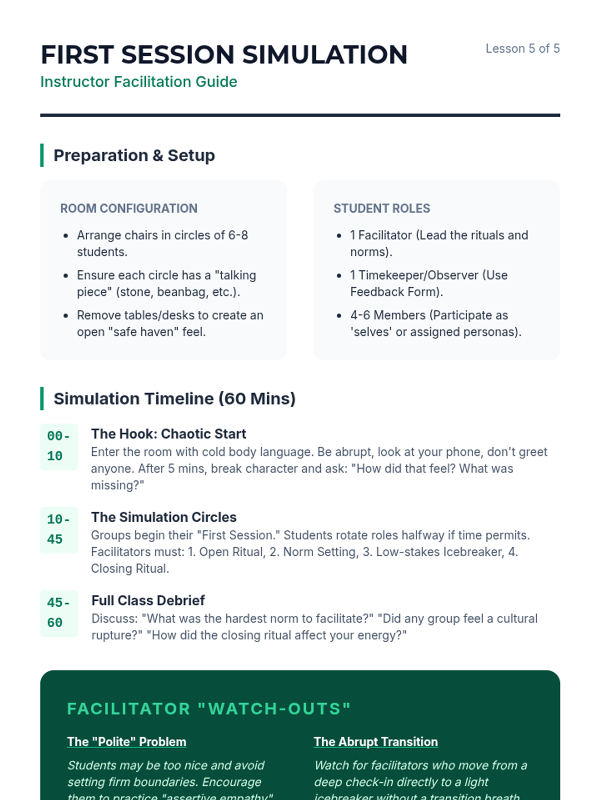 A comprehensive sequence for undergraduate counseling students focused on building psychological safety, co-creating group norms, and mastering the structural elements of group facilitation. Students progress from theoretical understanding to simulated practice of establishing and maintaining safe group containers.
