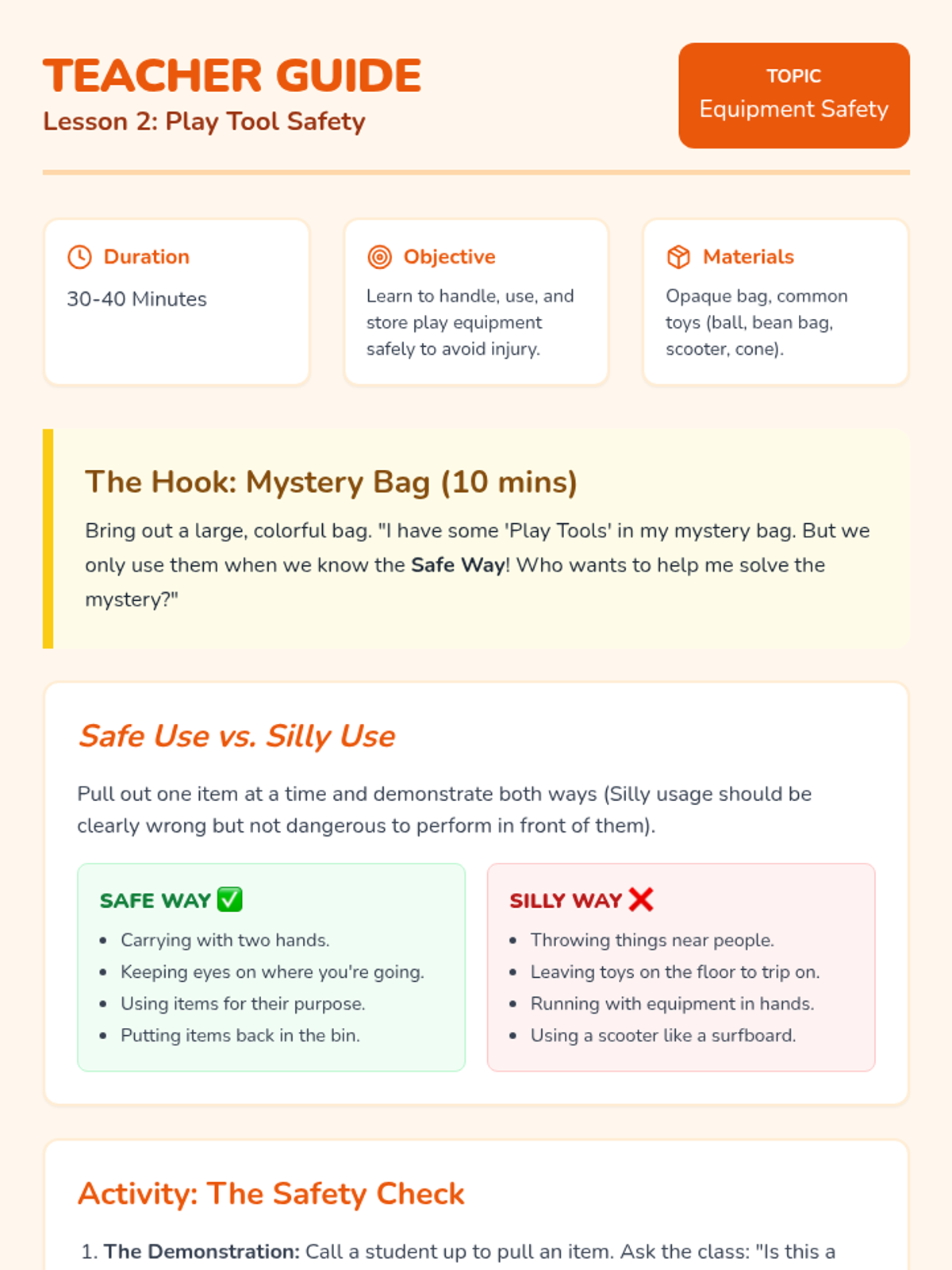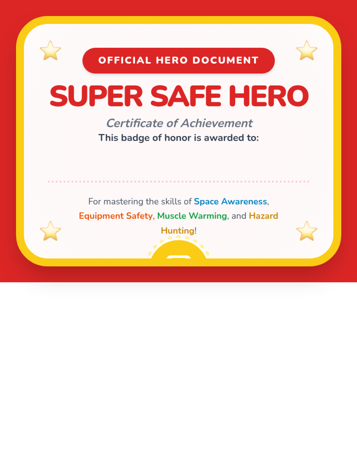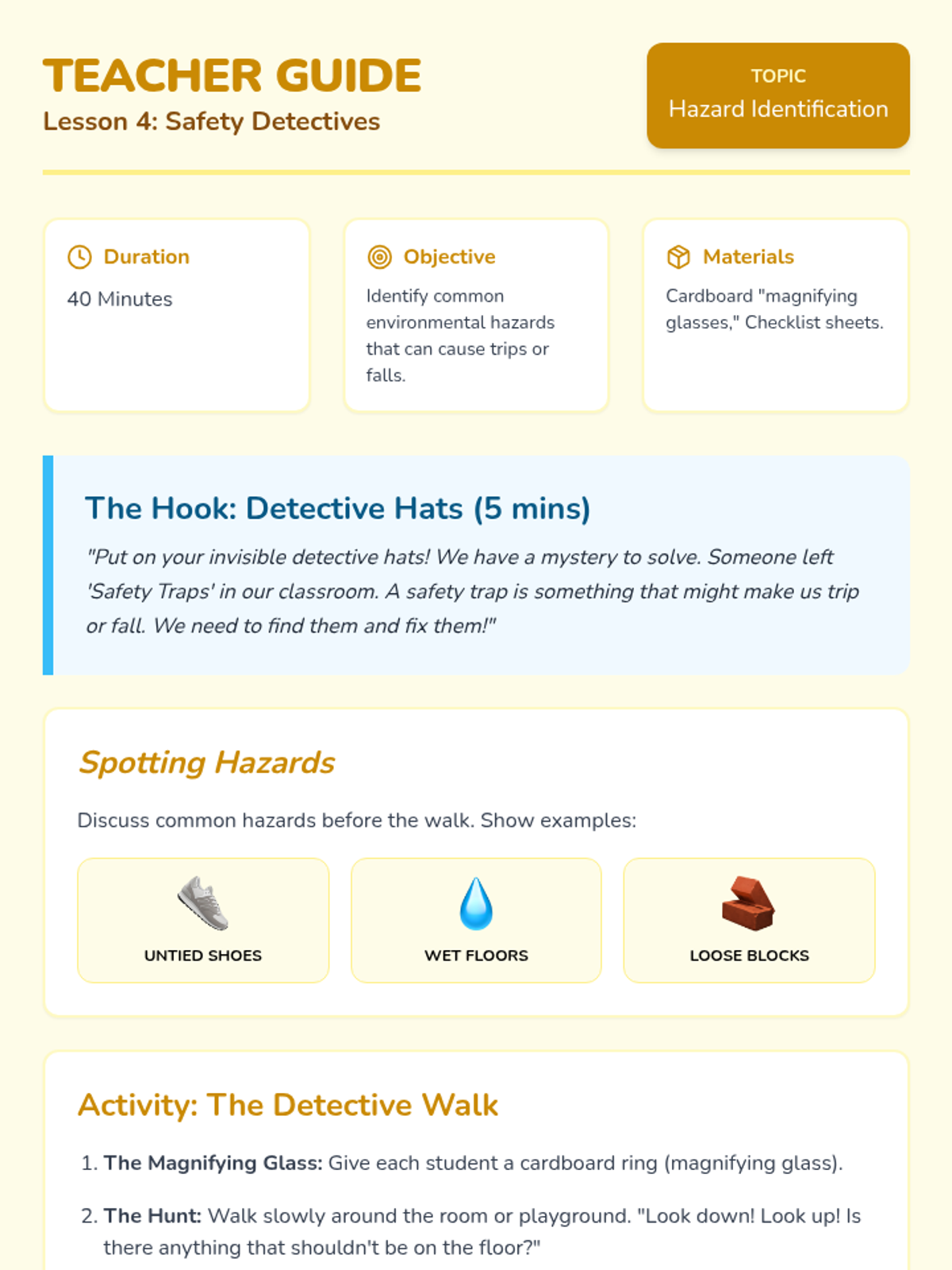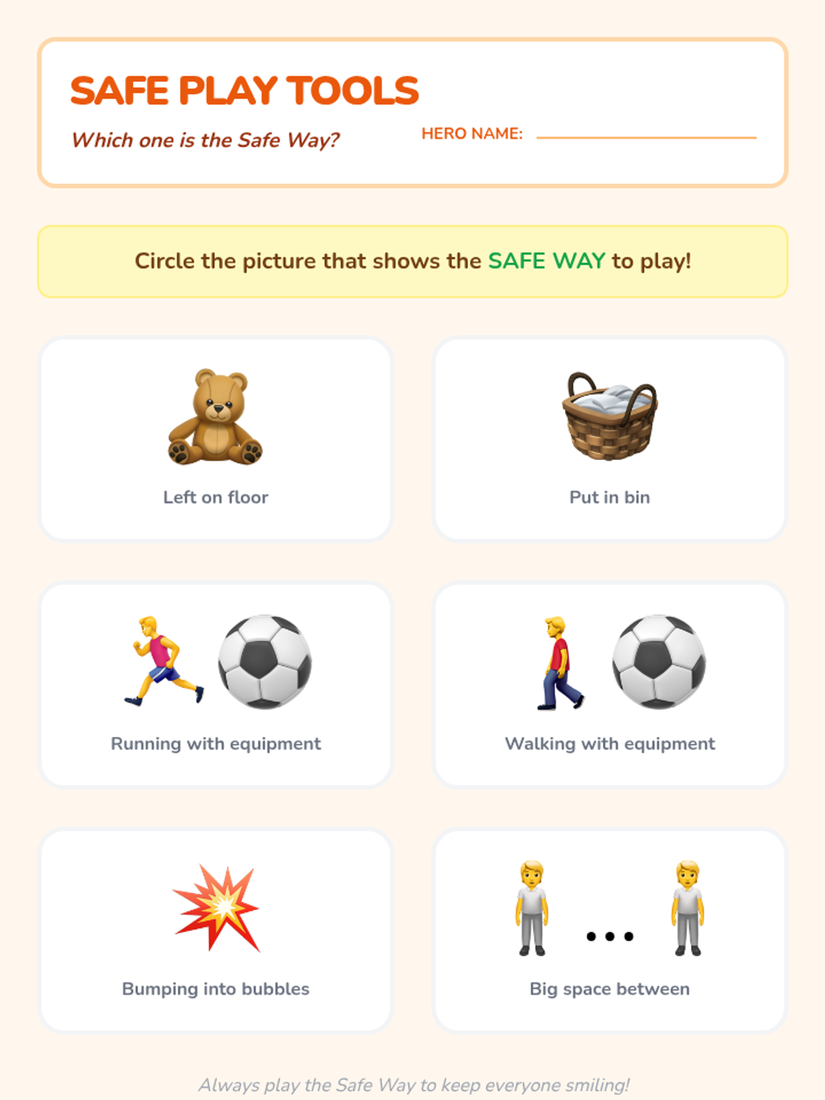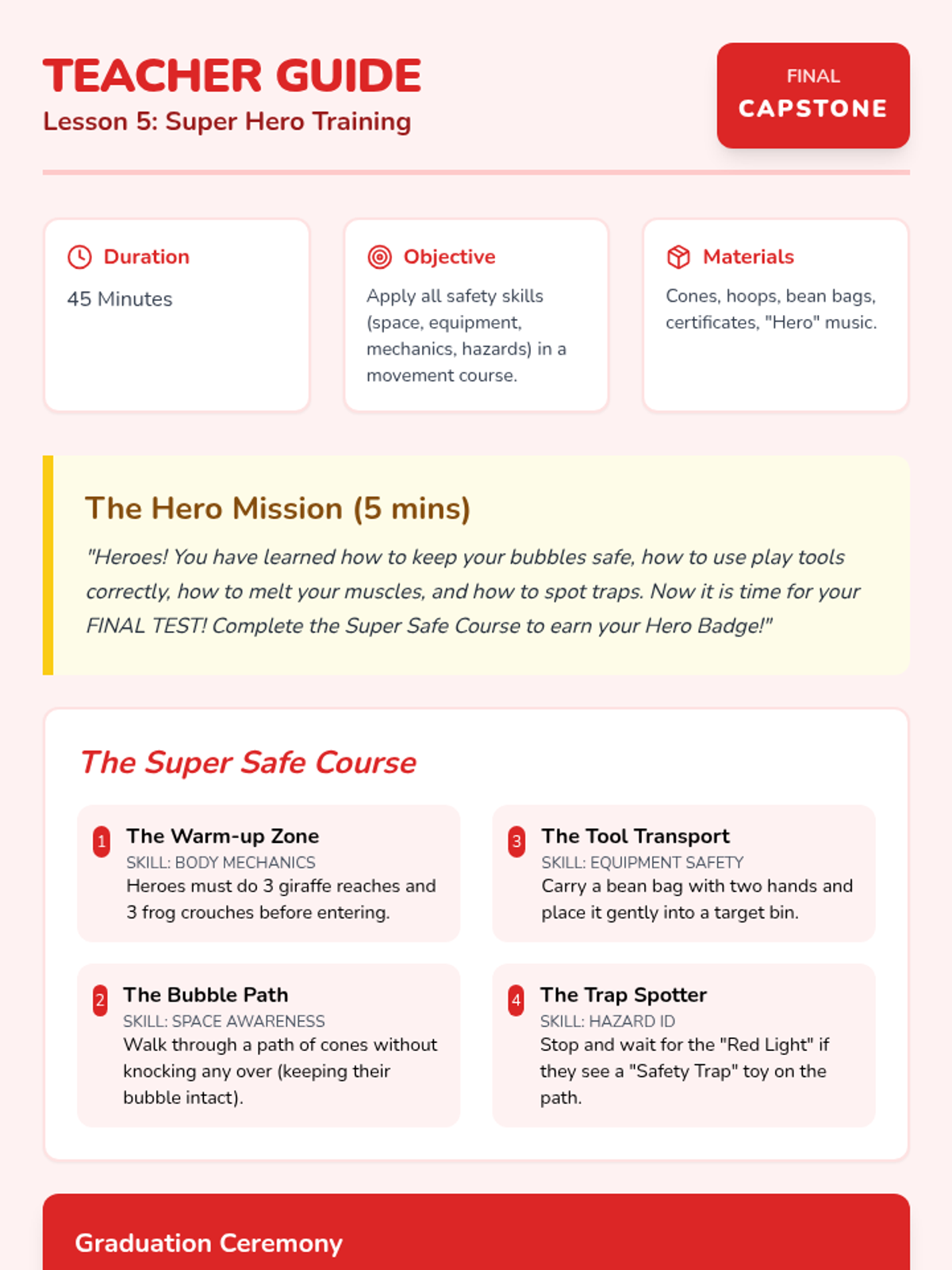 A Pre-K sequence introducing injury prevention through spatial awareness, equipment safety, body mechanics, and hazard identification using a 'Safety Hero' theme.