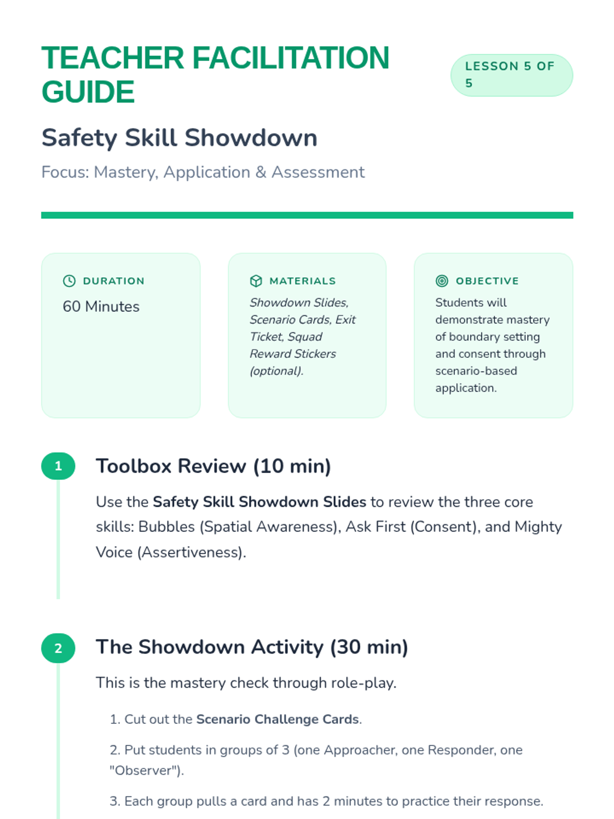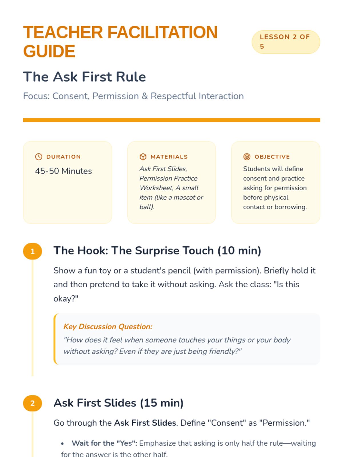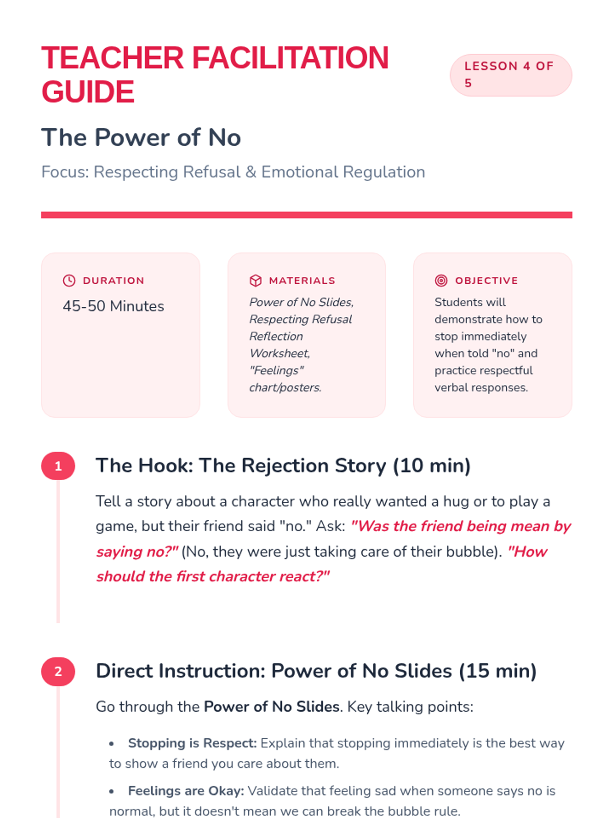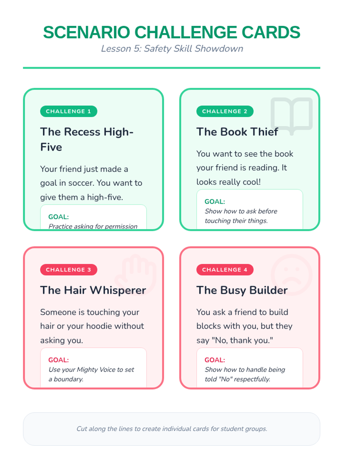 This sequence introduces students to the fundamental concepts of personal space and physical boundaries through interactive movement and role-playing activities. Students learn to define their personal space, practice asking for consent, and develop assertive communication skills to maintain their safety and respect the boundaries of others.