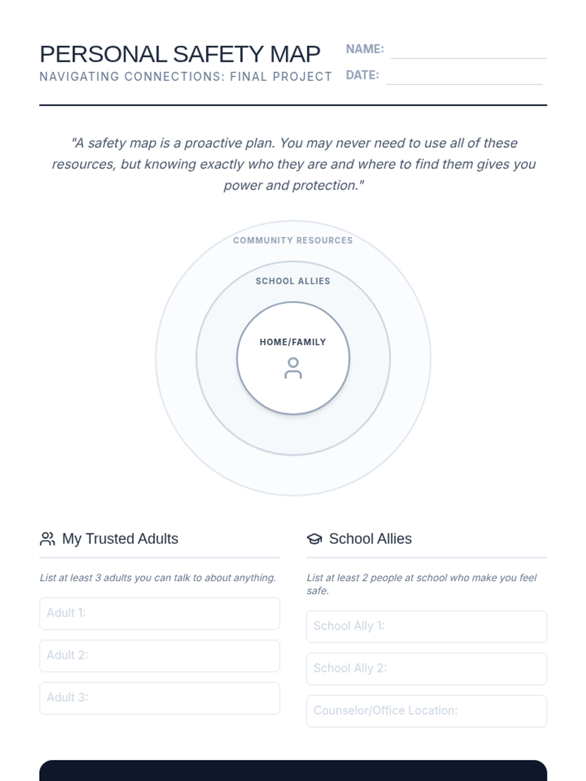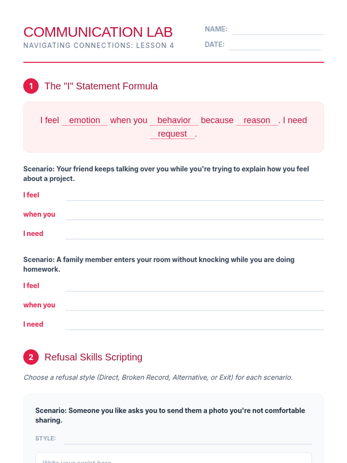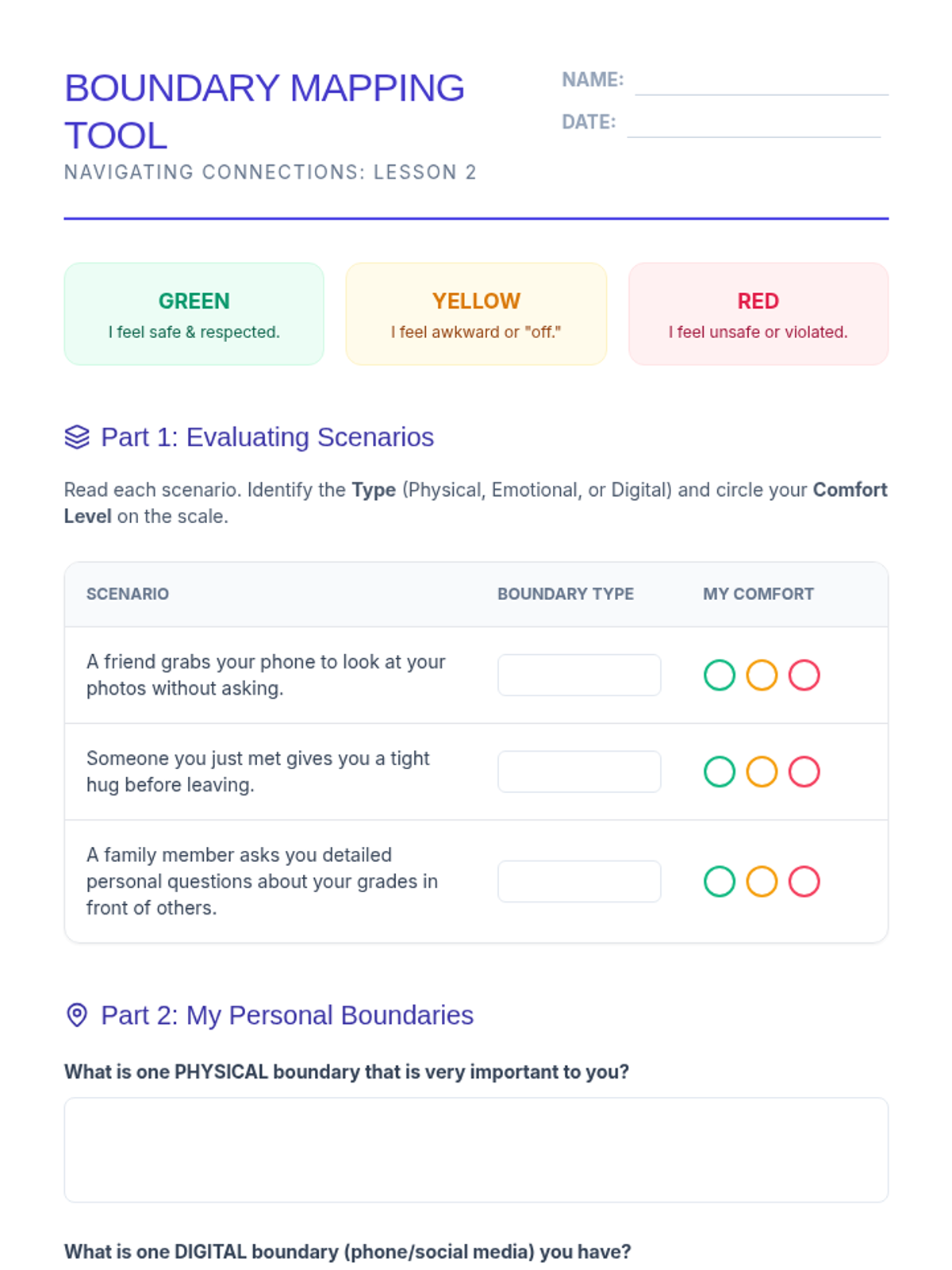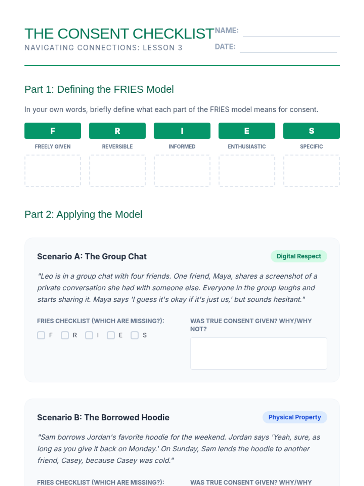 This sequence guides 7th-grade students through identifying healthy vs. unhealthy relationship dynamics, setting personal boundaries, understanding consent (FRIES model), practicing assertive communication, and identifying support systems for personal safety.