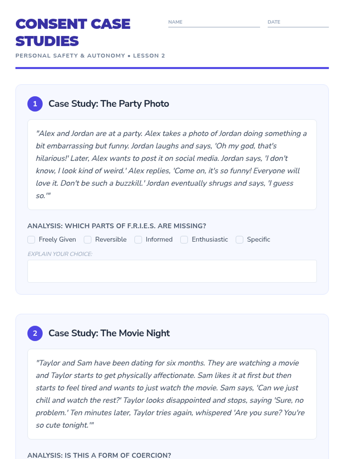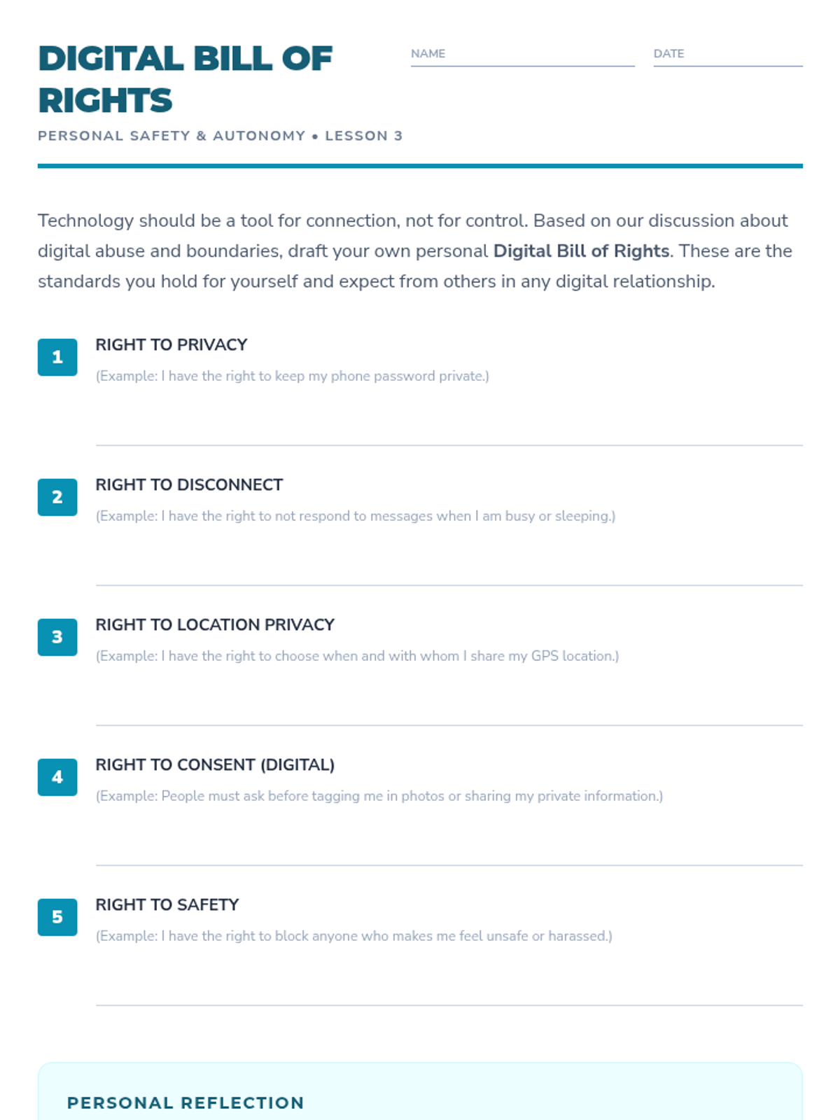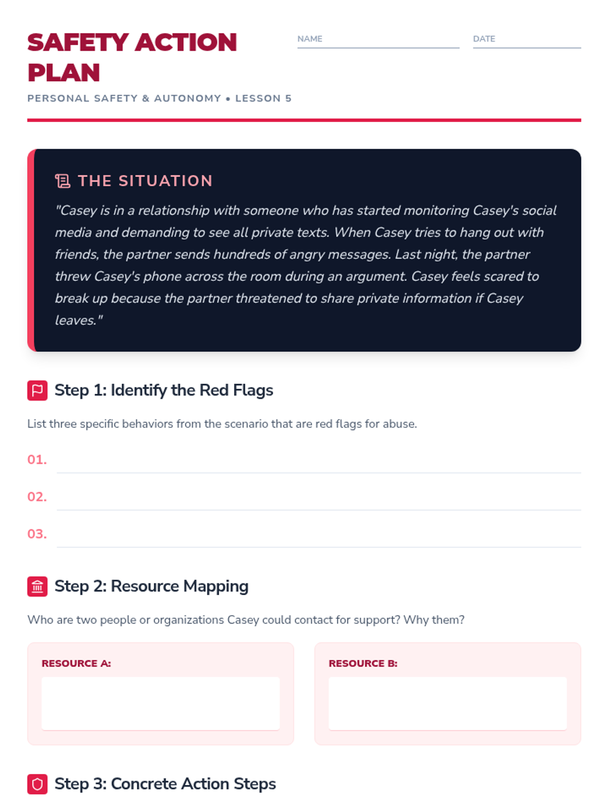 A comprehensive 9th-grade sequence exploring relationship health, consent, digital boundaries, assertive communication, and safety resources. Students move from identifying behaviors to practicing real-world skills for maintaining personal safety and autonomy.
