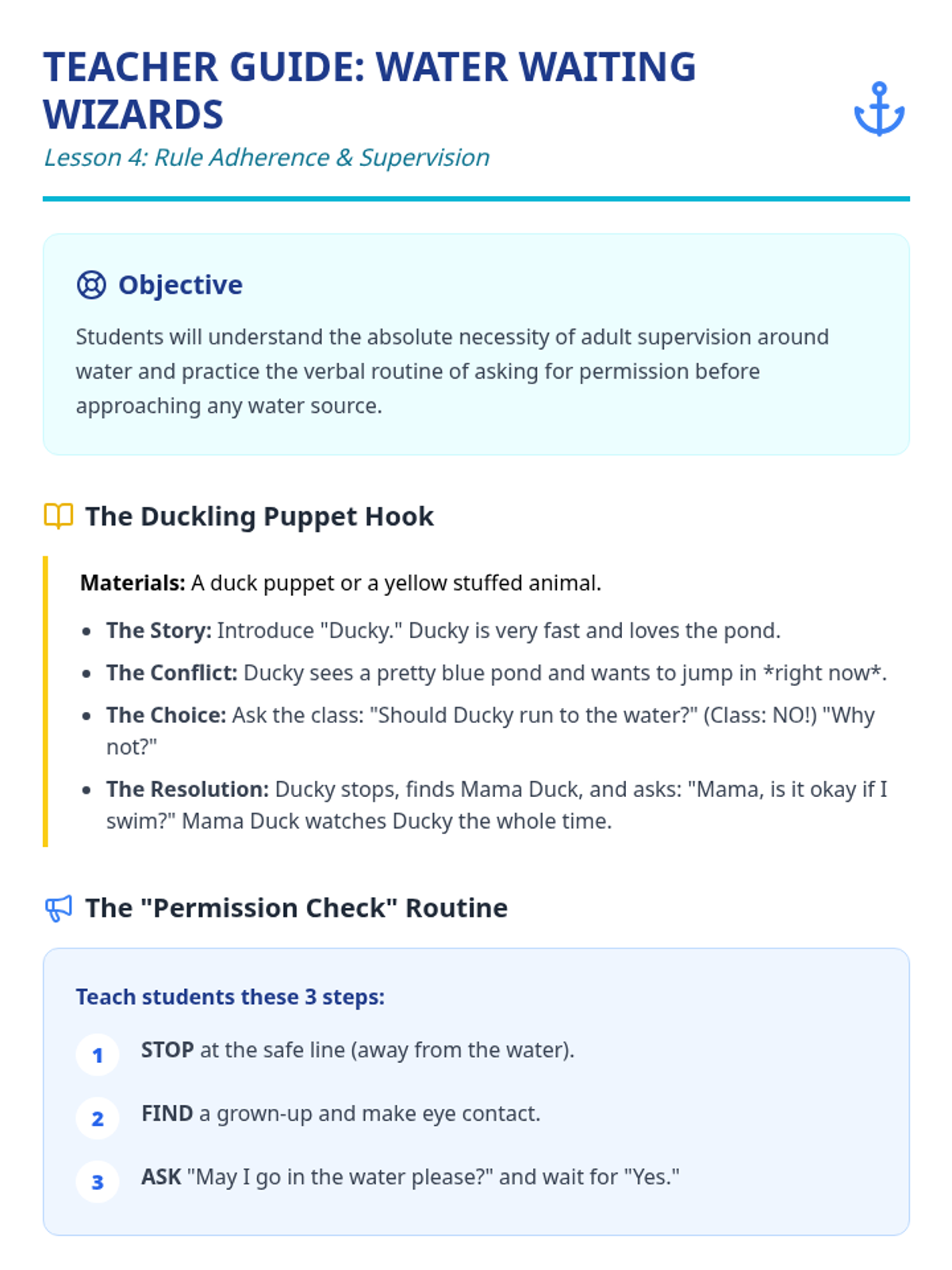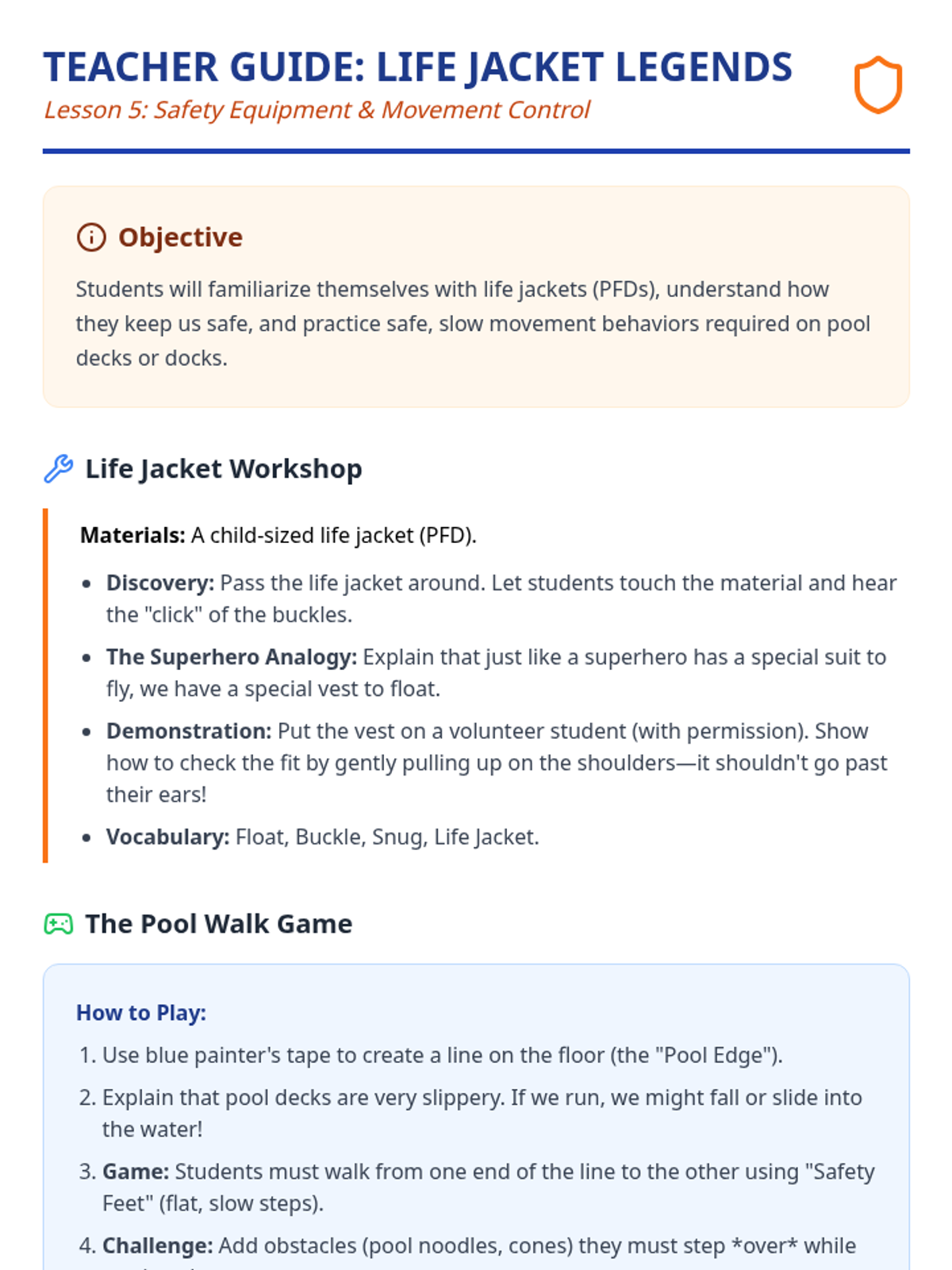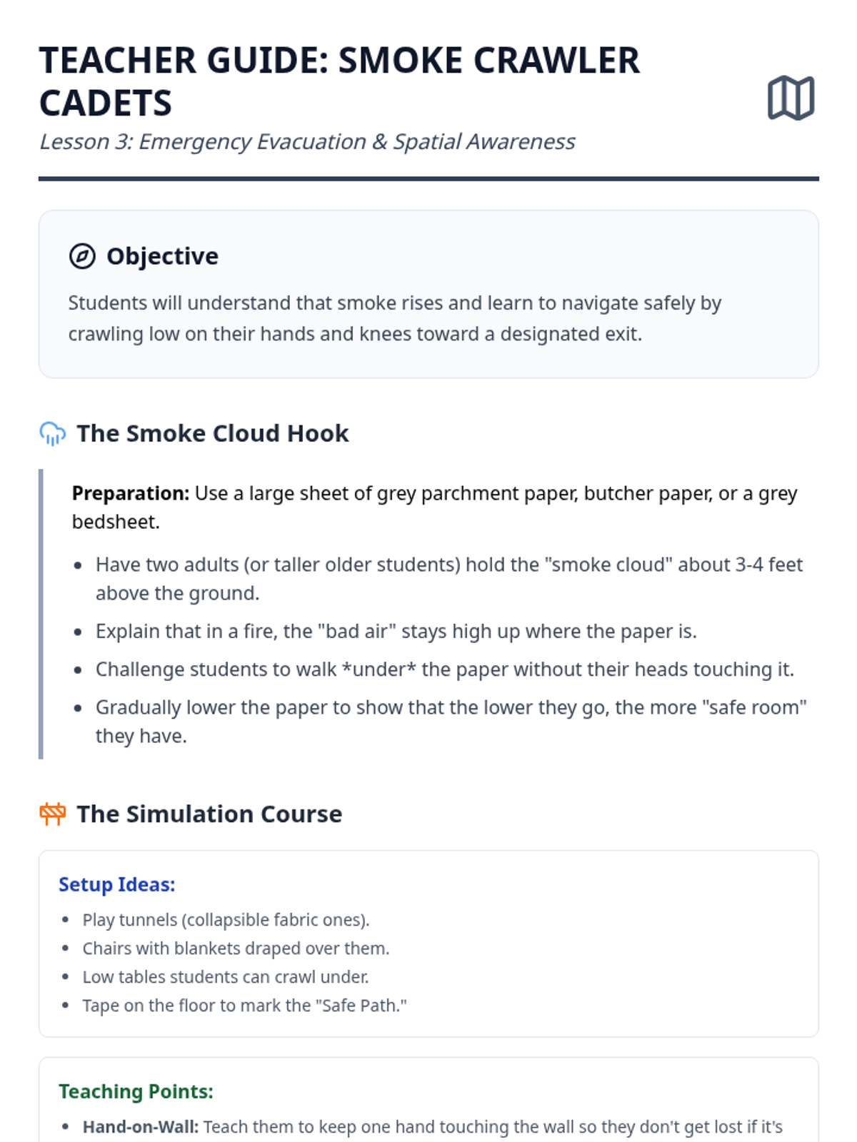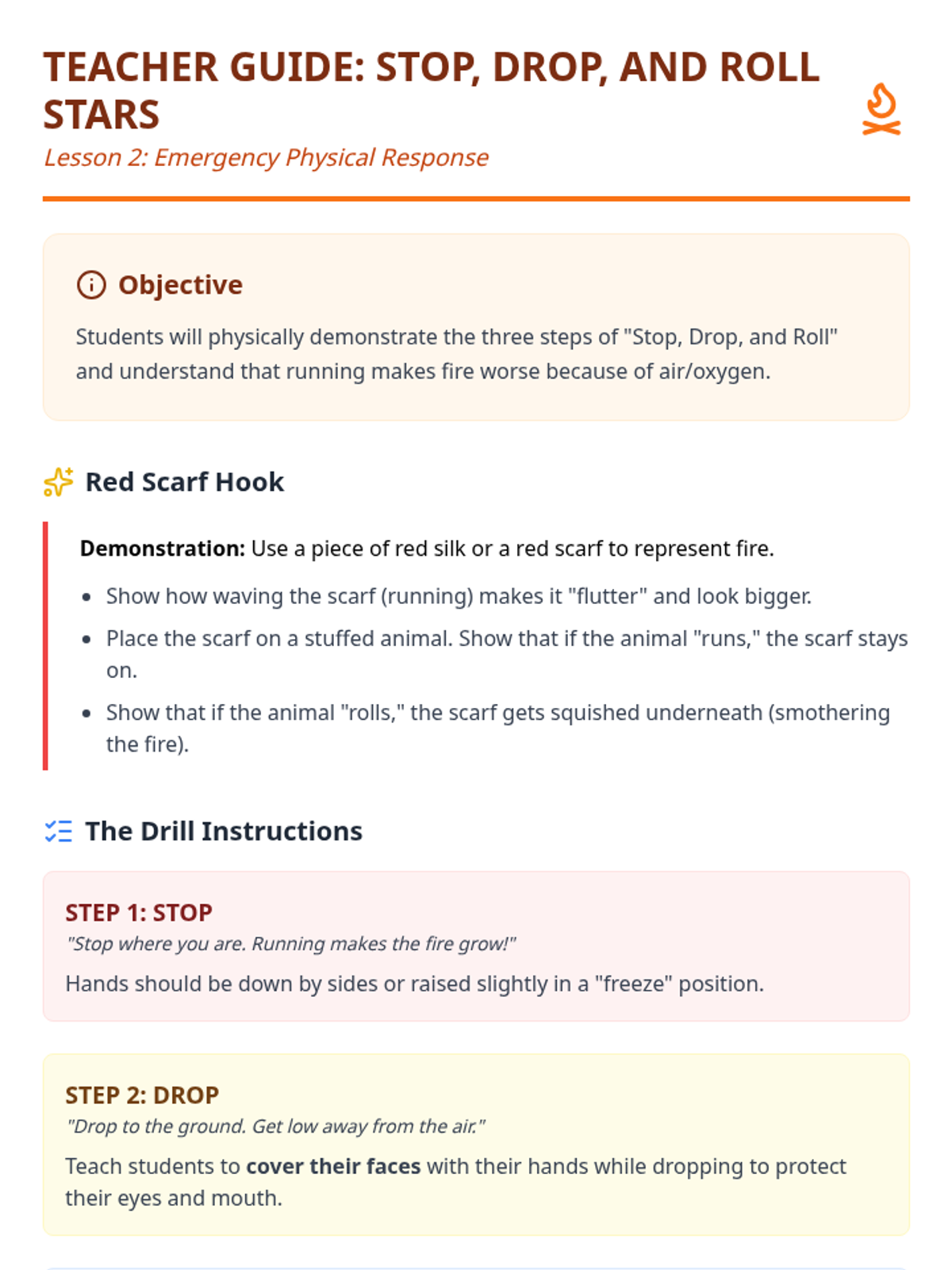 A comprehensive safety sequence for Pre-K learners focusing on fire prevention, emergency response, and water safety rules through interactive play and movement.