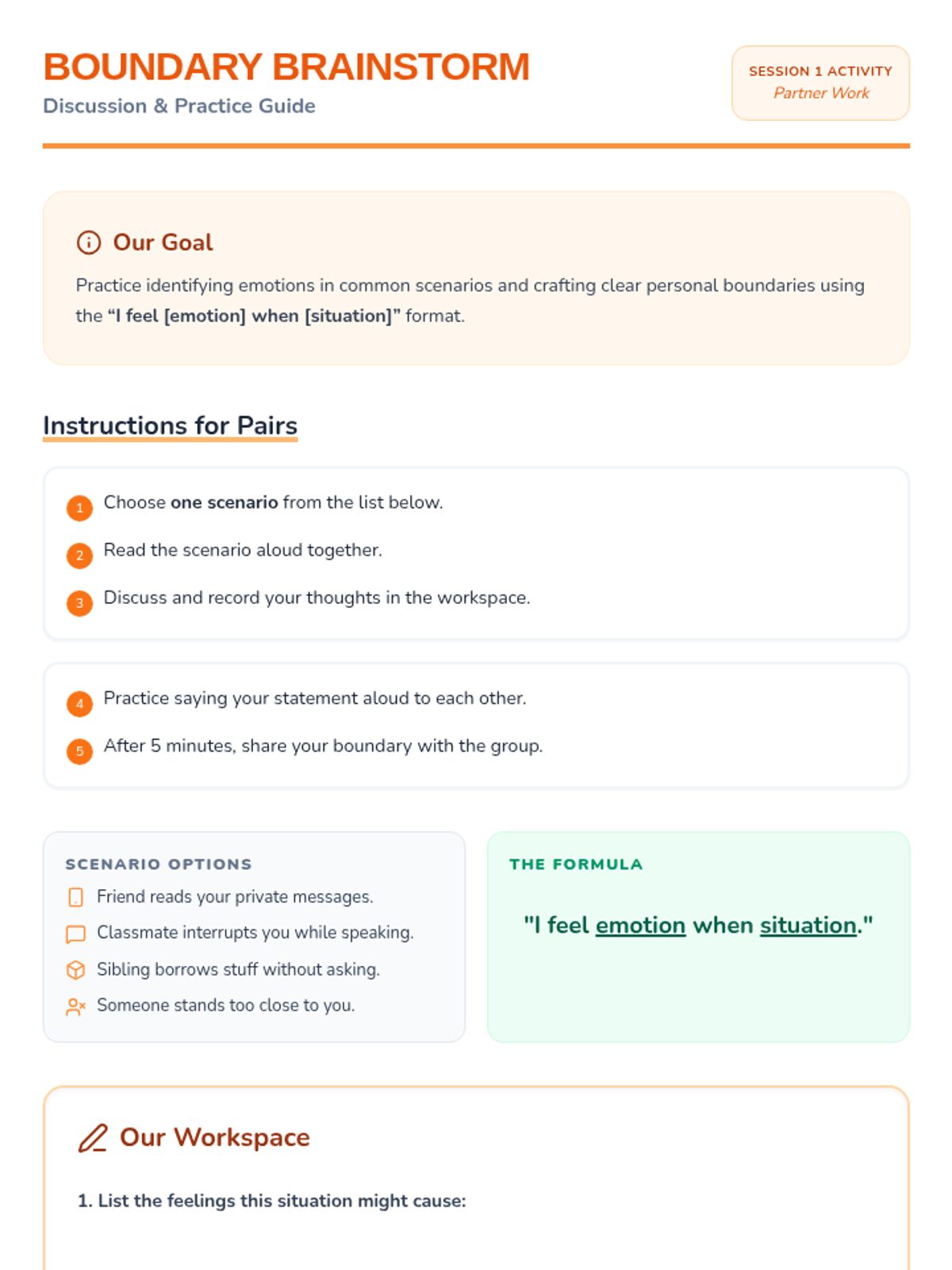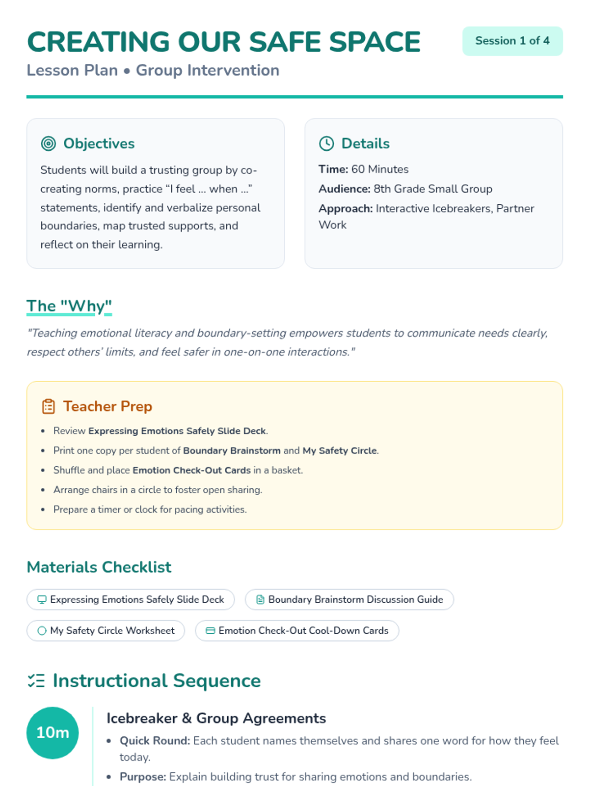 A multi-session Tier 2 group intervention for 8th graders focused on emotional articulation, boundary setting, and building a supportive peer network.