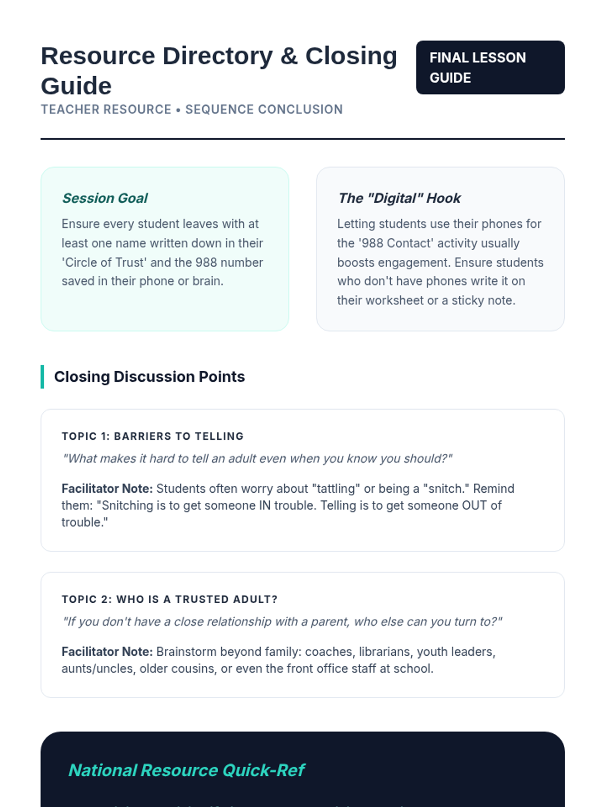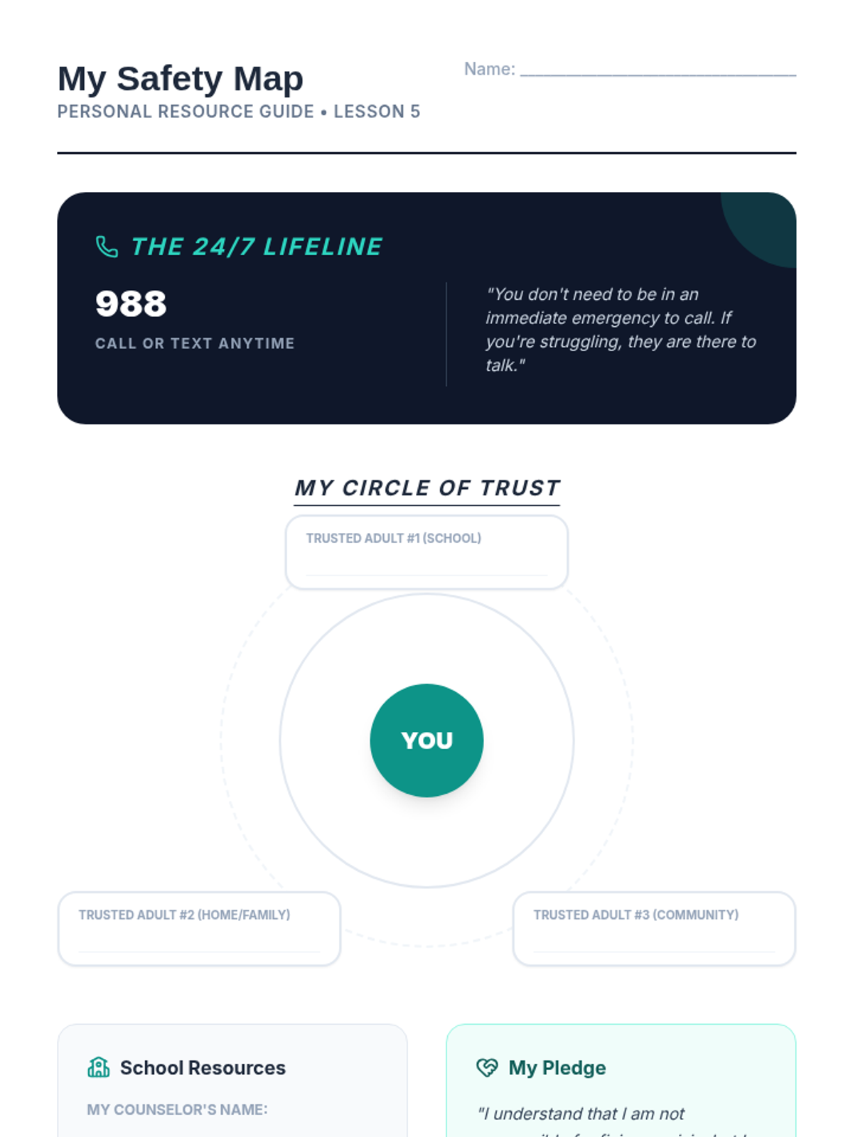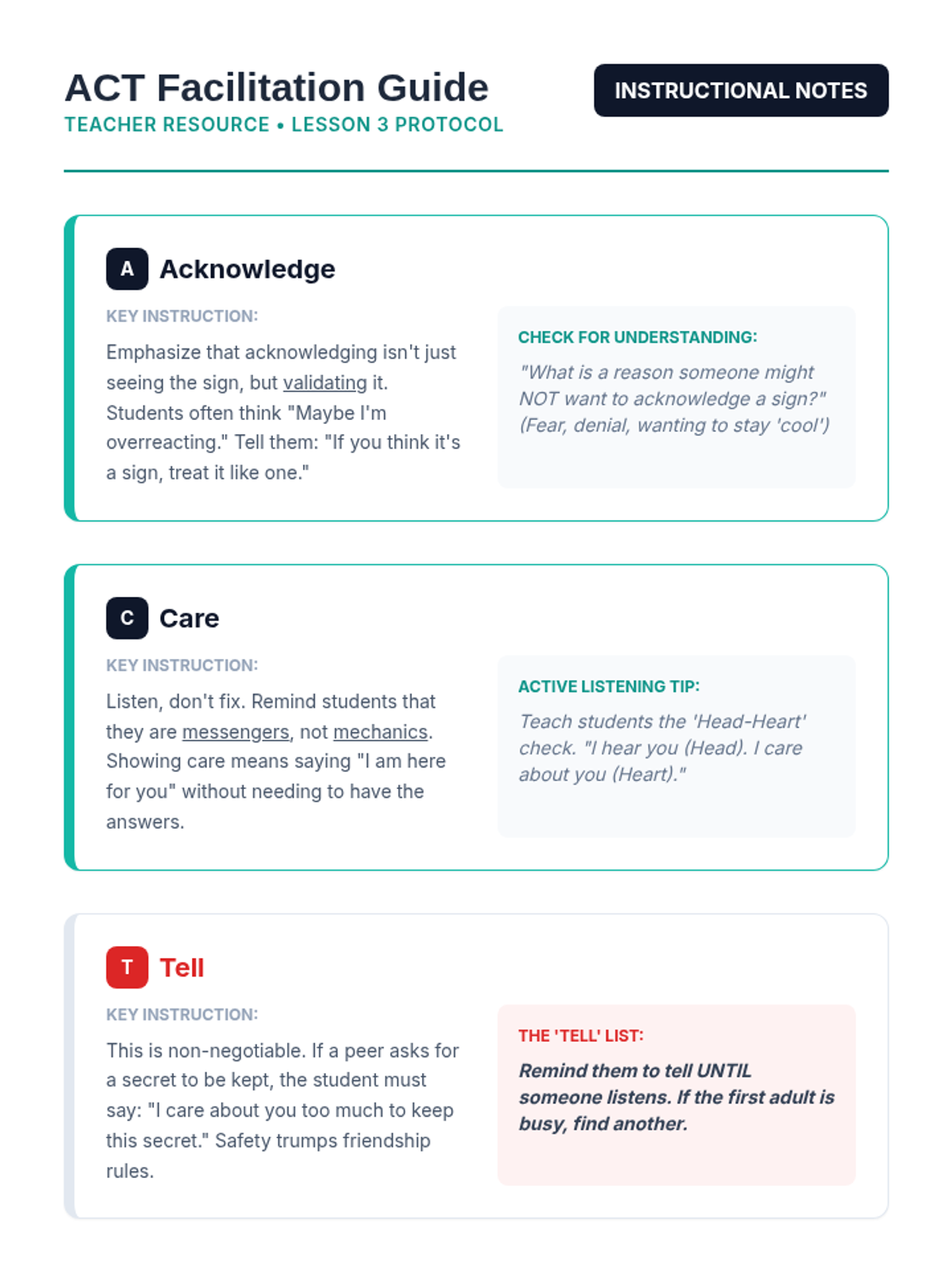A comprehensive 5-lesson sequence for 8th-grade students on identifying suicide warning signs and seeking help using the ACT (Acknowledge, Care, Tell) model. Students progress from distinguishing stress from crisis to mapping out their personal support systems.