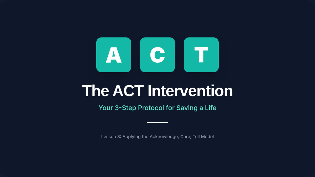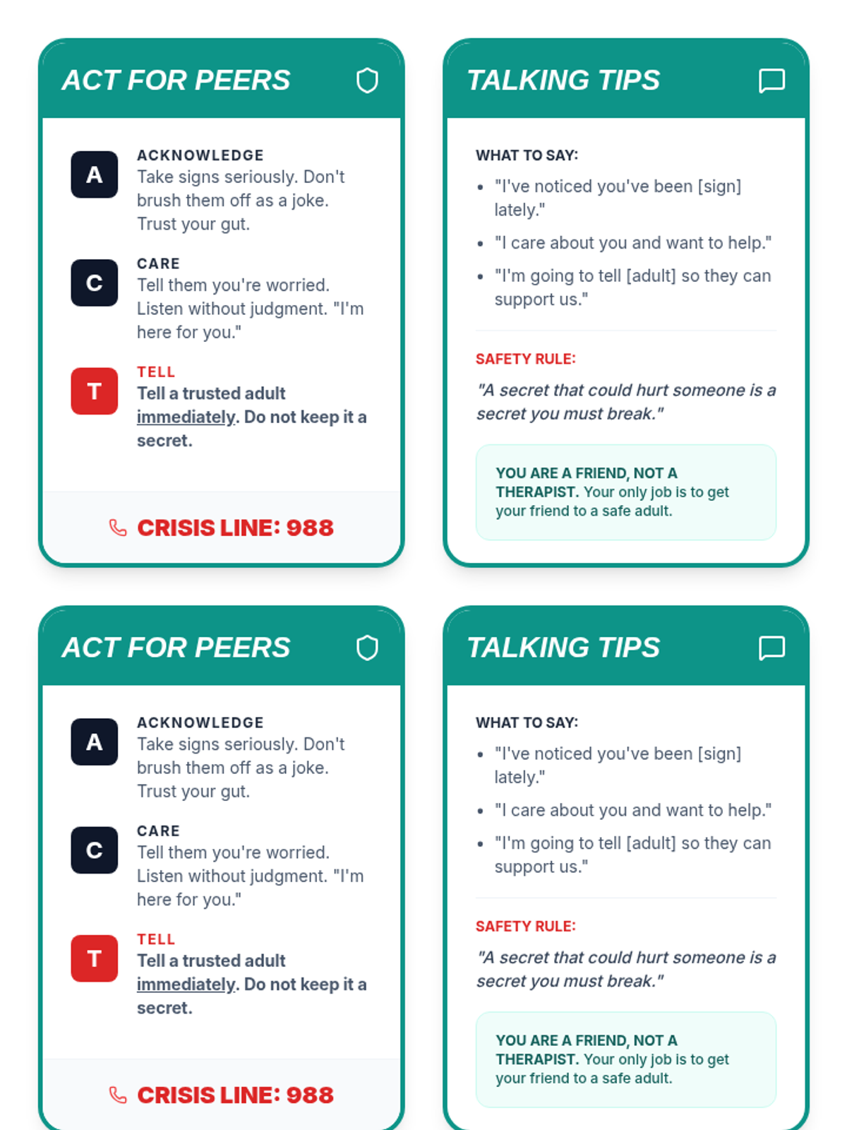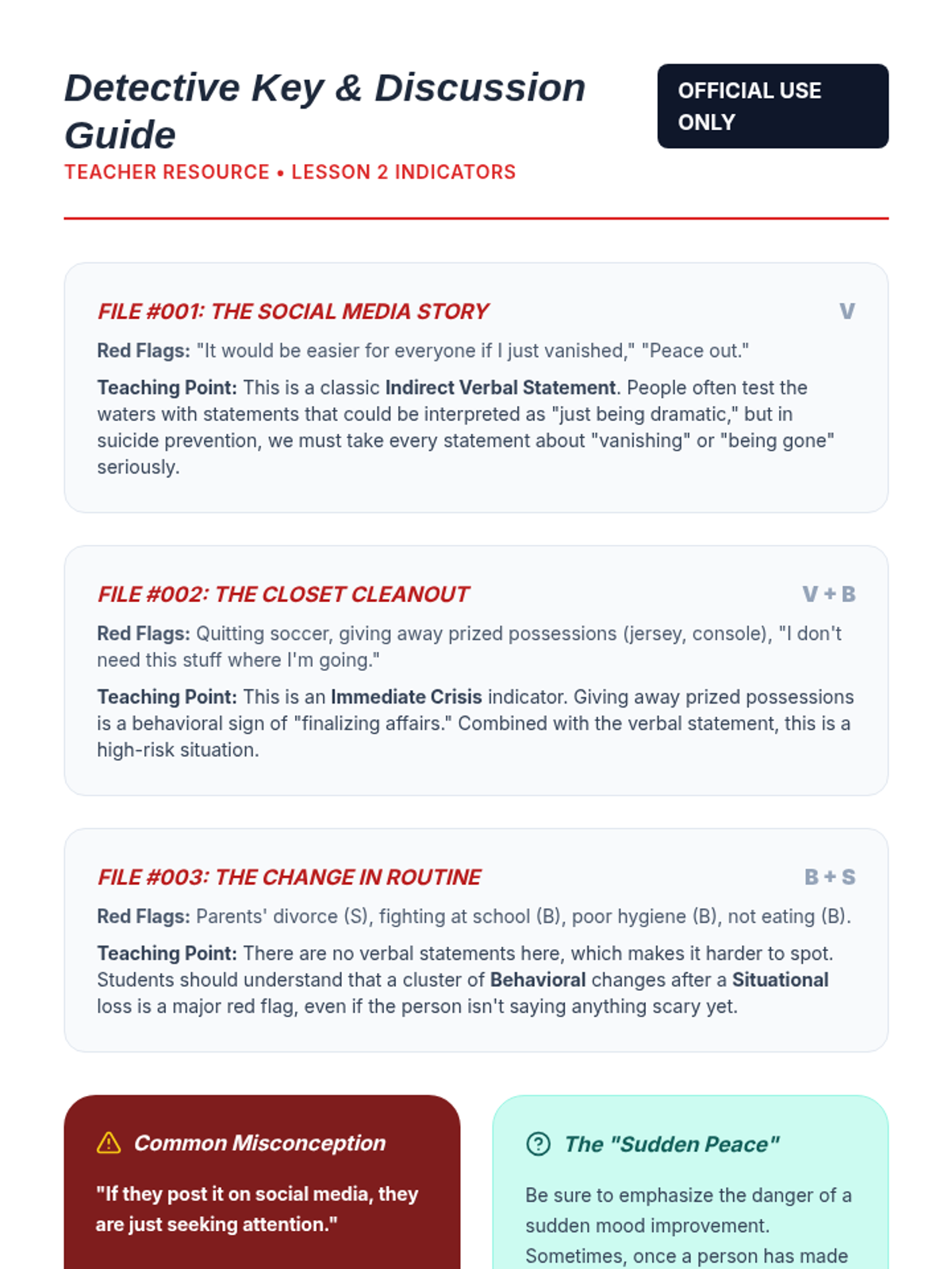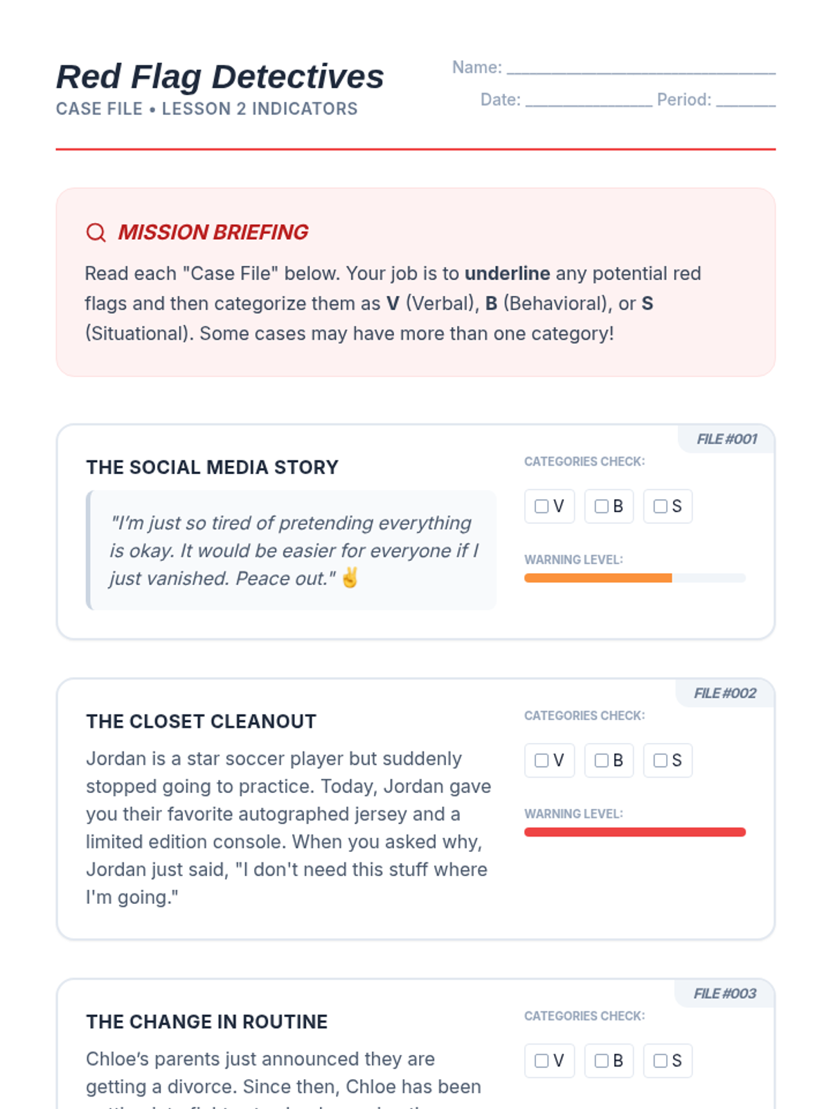 A comprehensive 5-lesson sequence for 8th-grade students on identifying suicide warning signs and seeking help using the ACT (Acknowledge, Care, Tell) model. Students progress from distinguishing stress from crisis to mapping out their personal support systems.