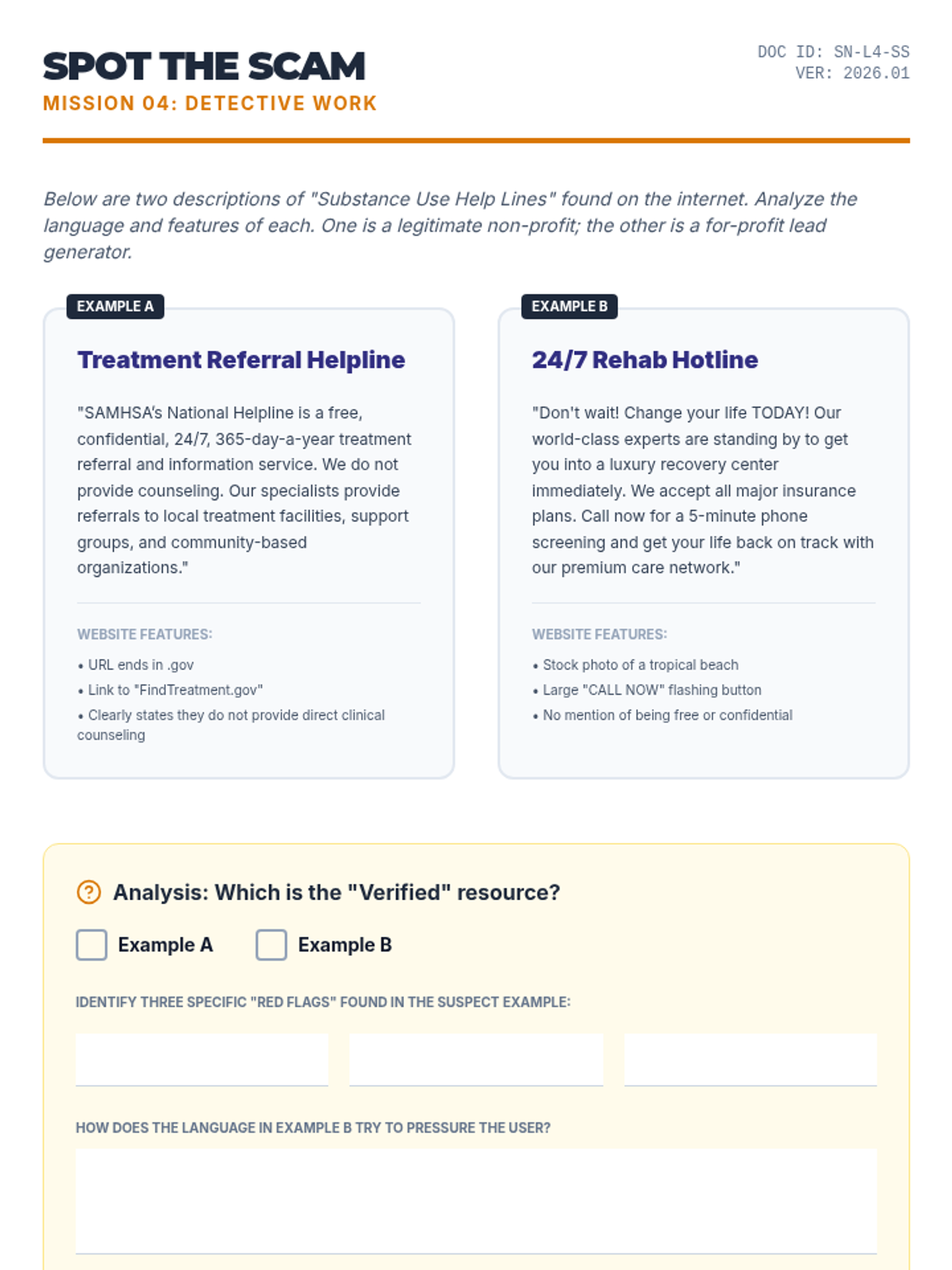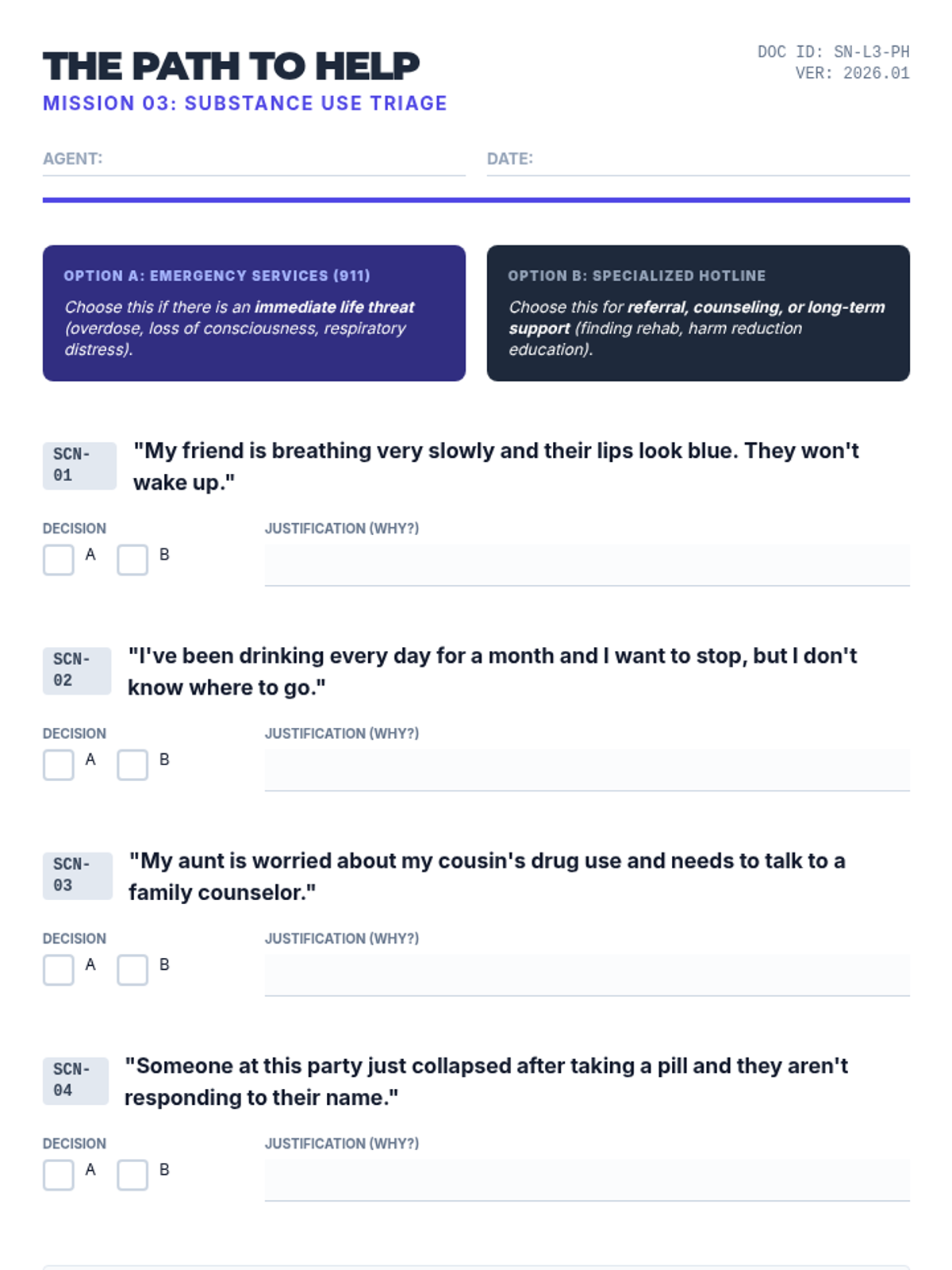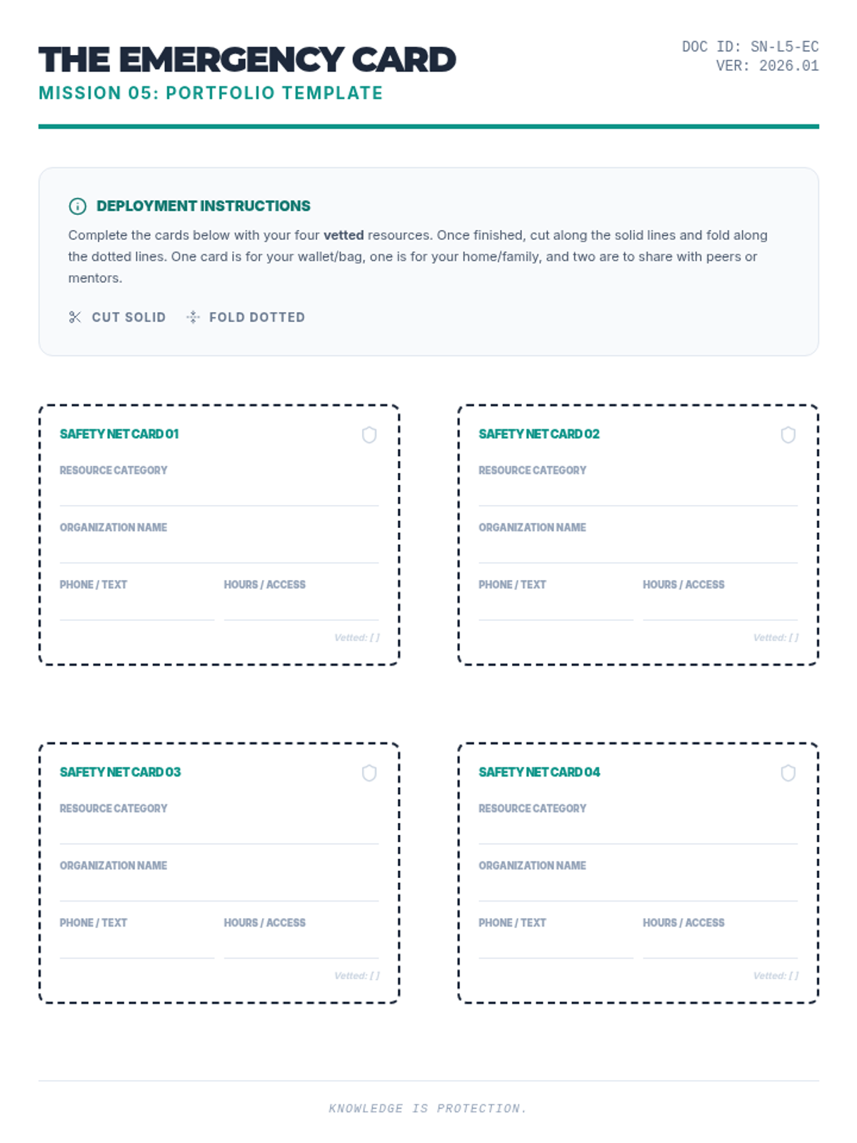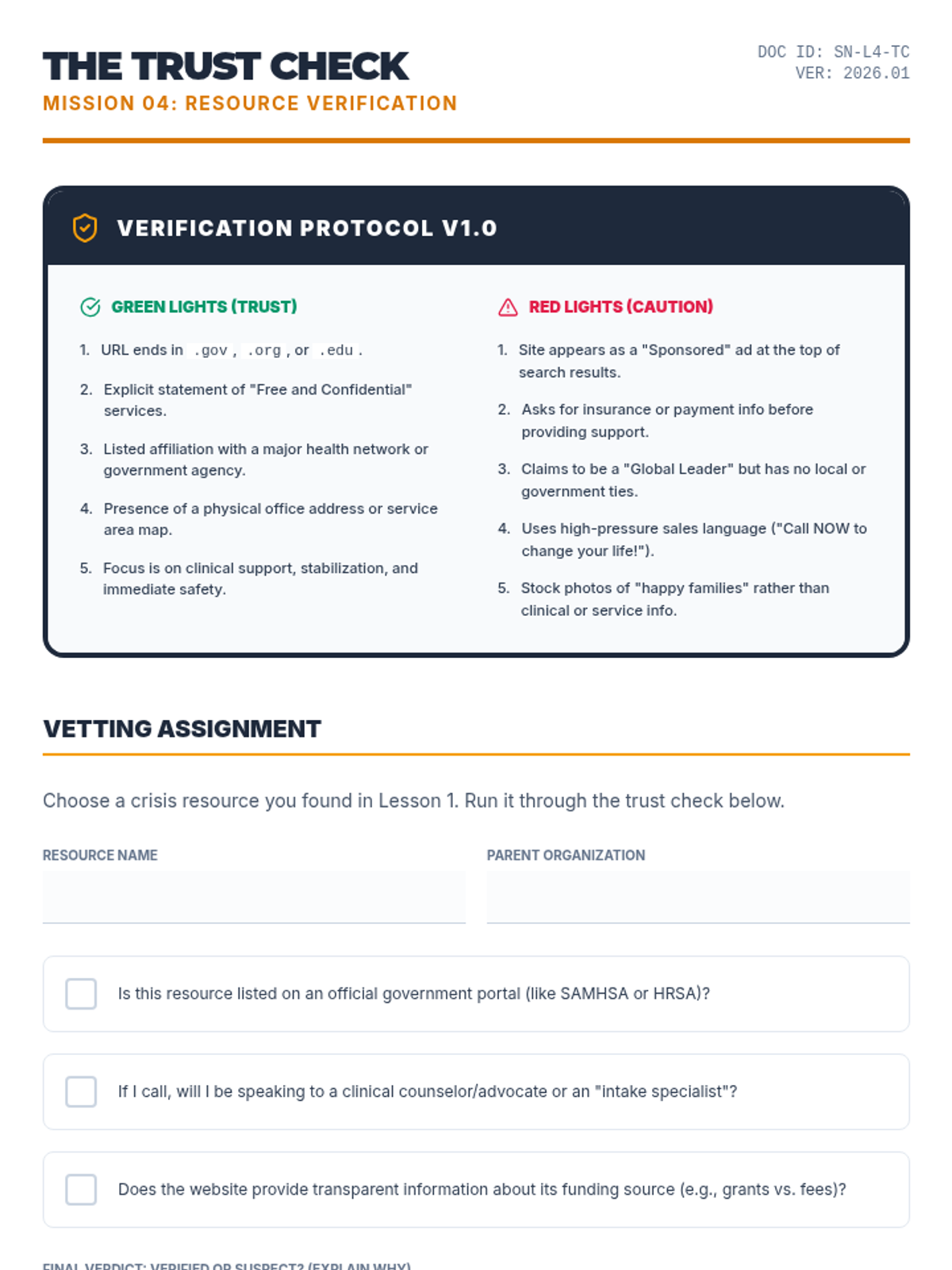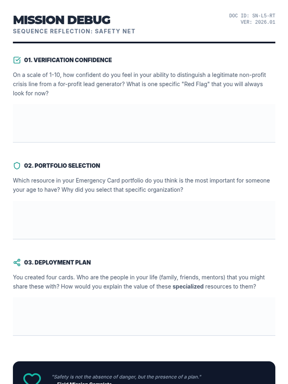 A research-focused sequence for 9th-grade students to map, evaluate, and access specialized crisis resources. Students learn to distinguish between general and specialized support, evaluate the credibility of services, and develop a personalized safety resource plan.