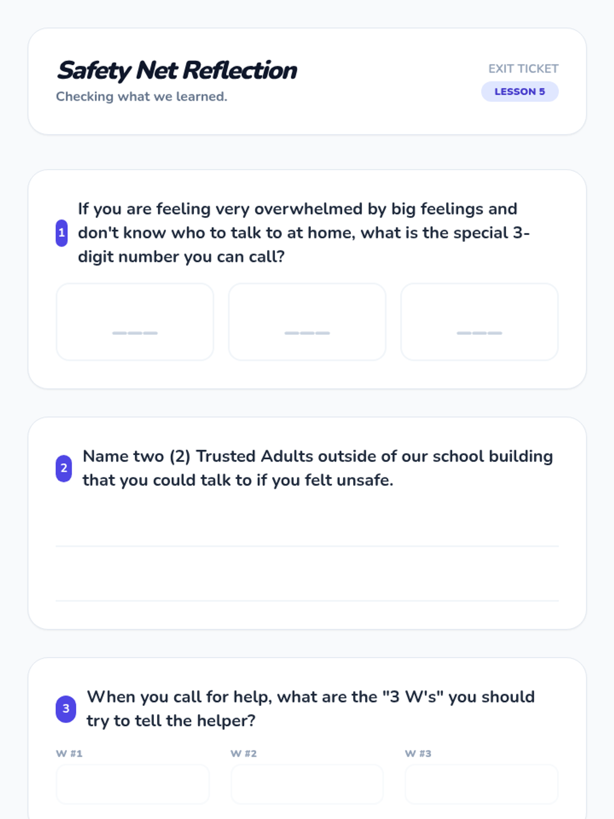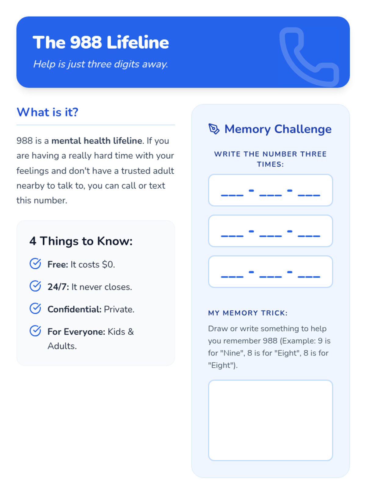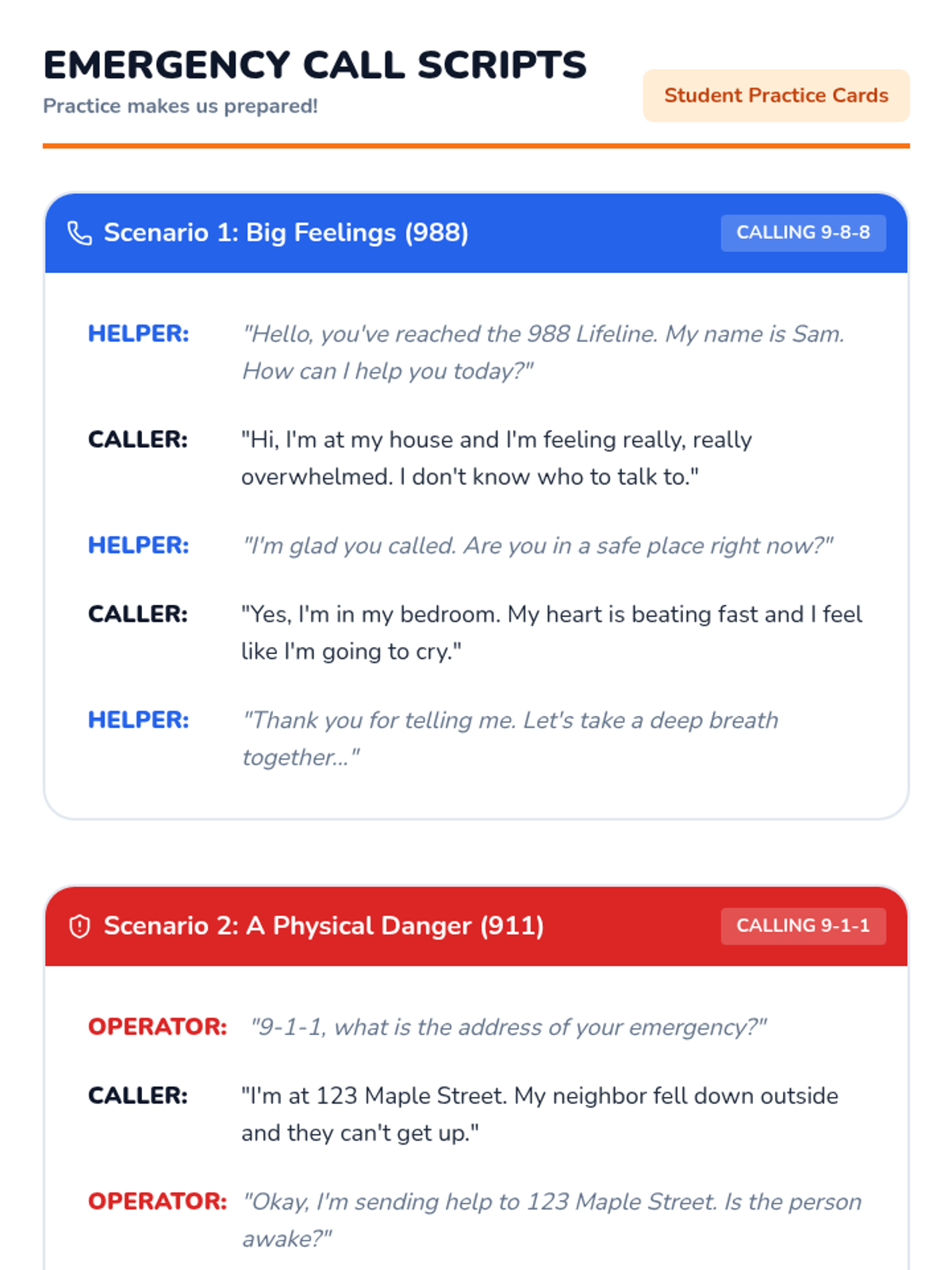 This sequence teaches 4th-grade students how to identify and access external mental health resources and emergency protocols. It covers trusted community adults, the 988 Suicide & Crisis Lifeline, emergency communication skills, and distinguishing between types of crises, culminating in a personal safety plan.