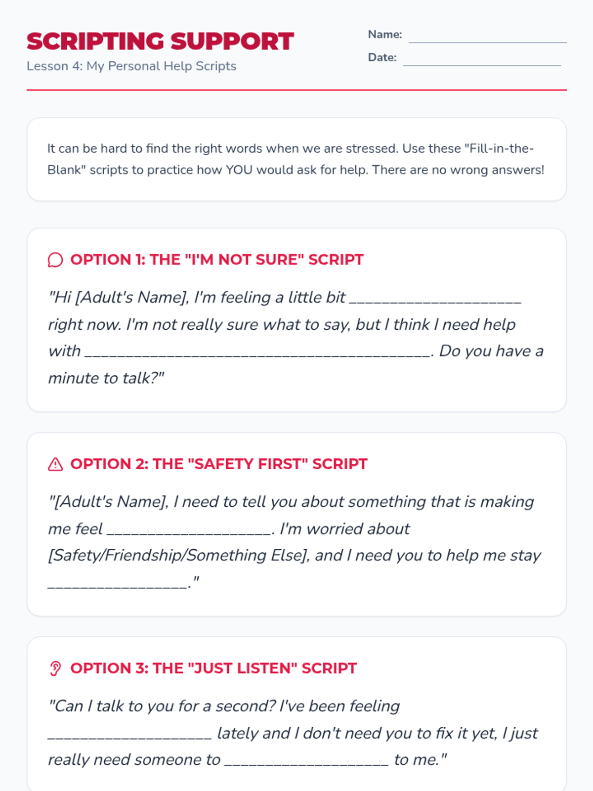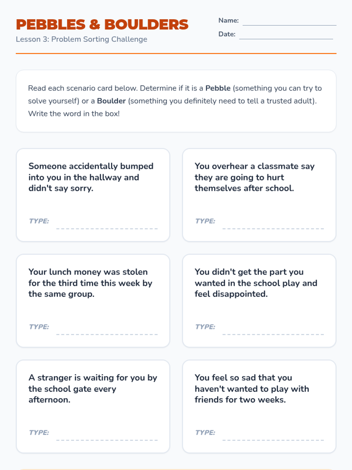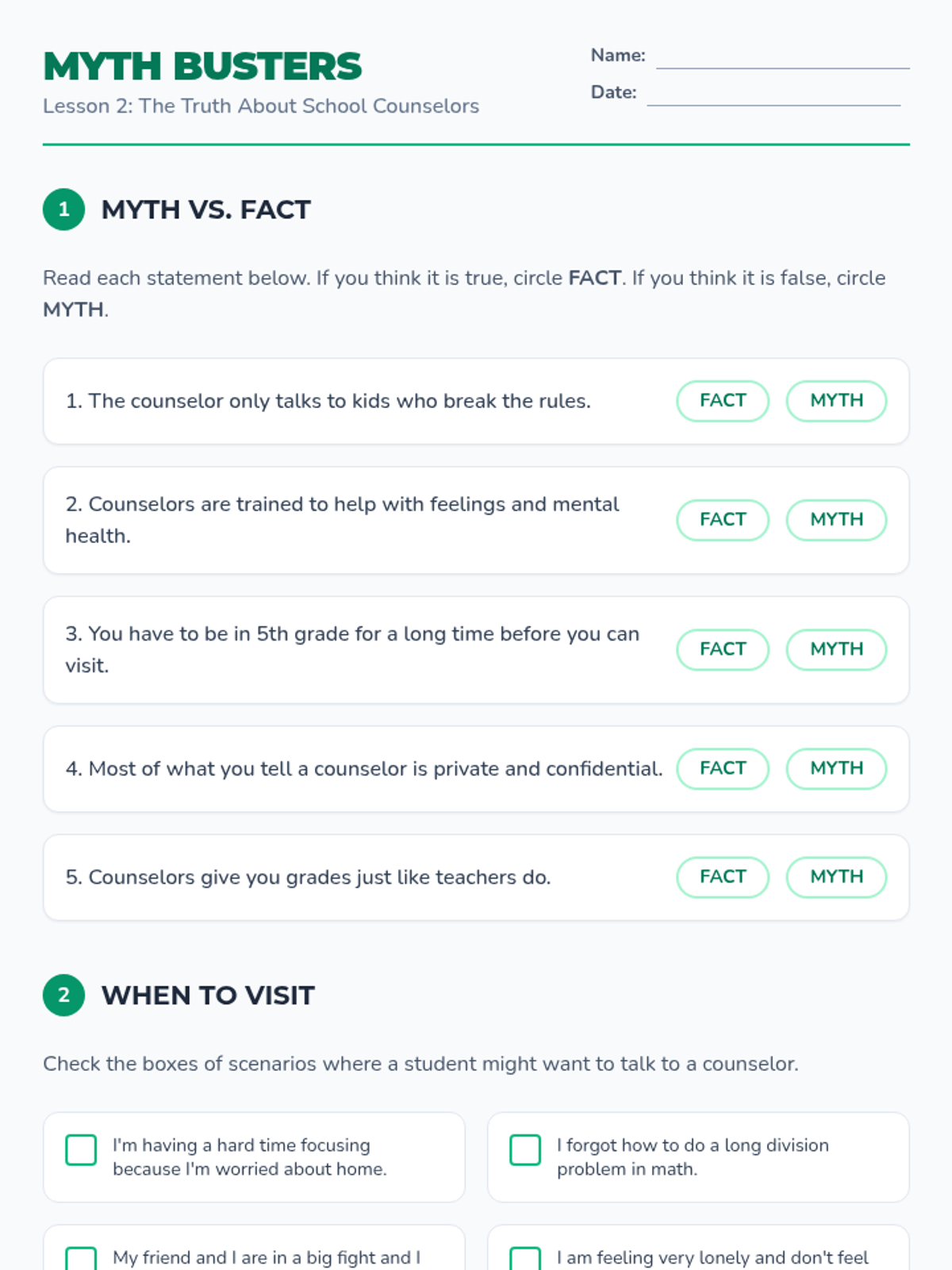 This sequence helps 5th-grade students build a personal support system by identifying trusted adults, understanding the school counselor's role, and learning how to articulate a need for help. Through interactive mapping and role-play, students gain the confidence and tools to access mental health resources.