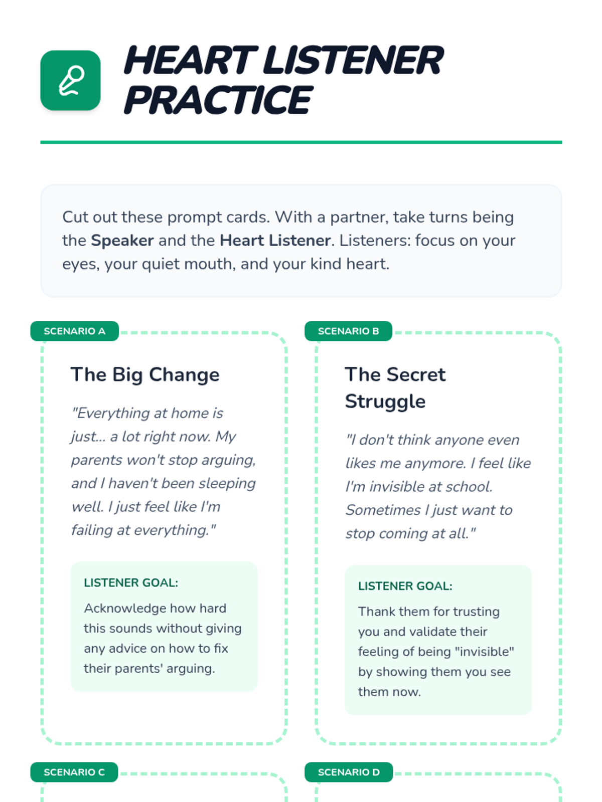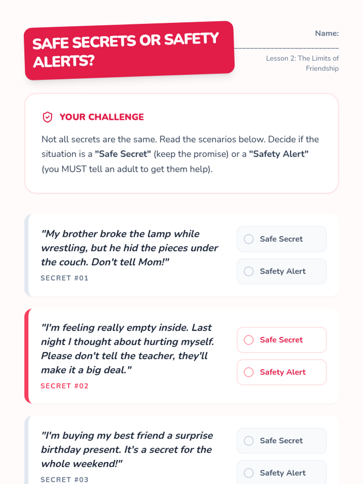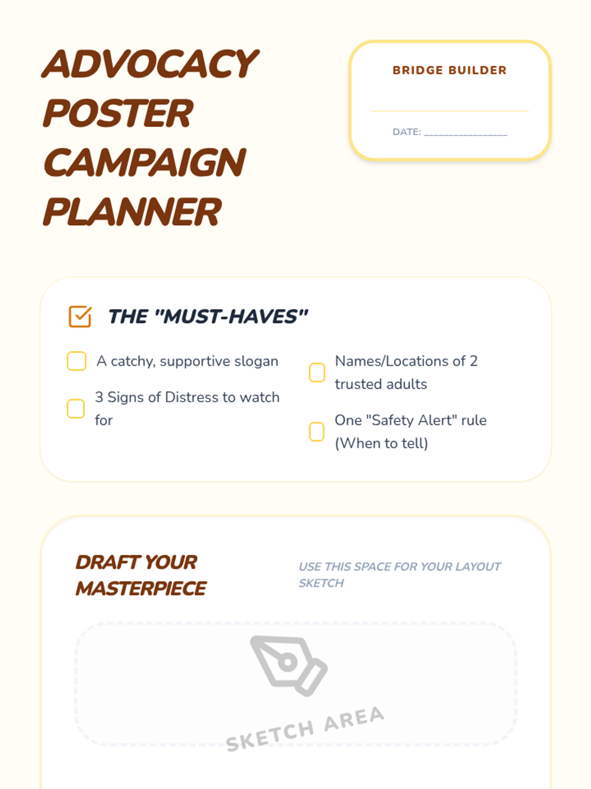 A 5-lesson sequence designed for 5th-grade students to learn how to recognize signs of distress in peers, understand the ethical boundaries of friendship secrets, practice active listening, and safely connect friends to trusted adults through 'warm handoffs.' Students conclude by creating a school-wide advocacy campaign to promote mental health resources.