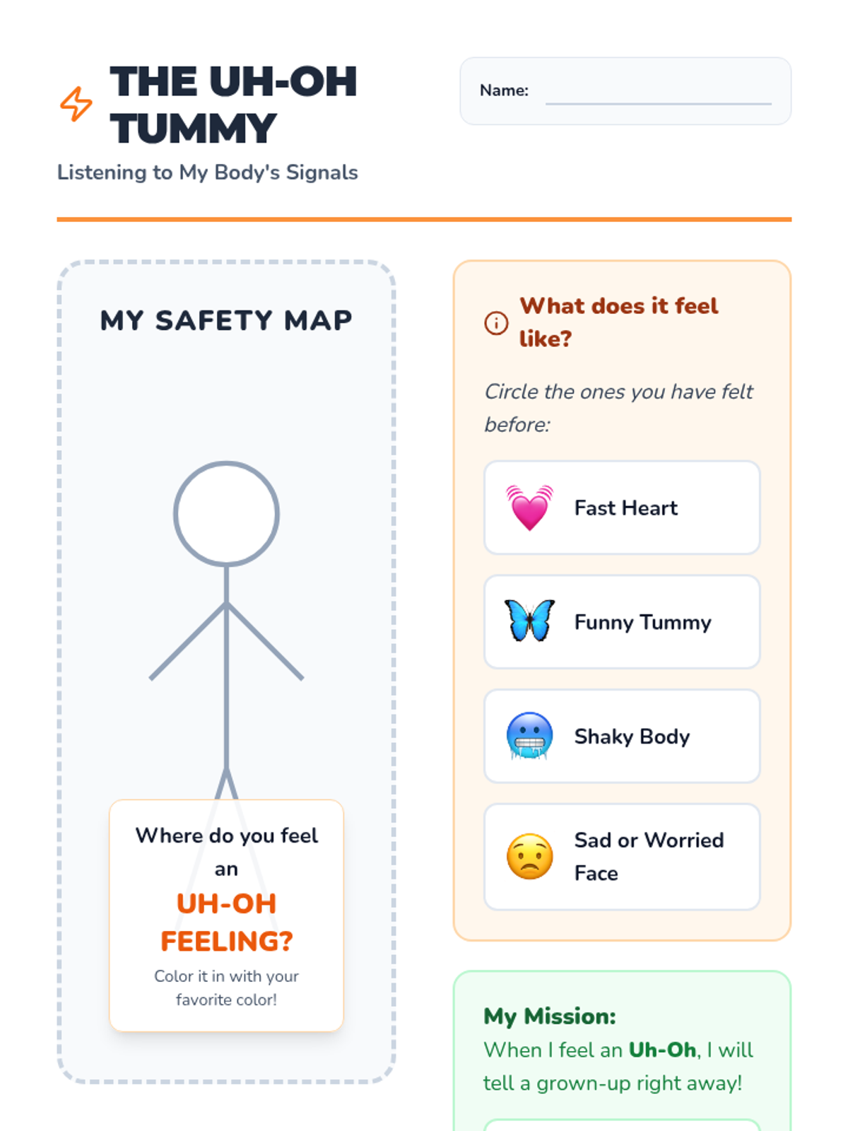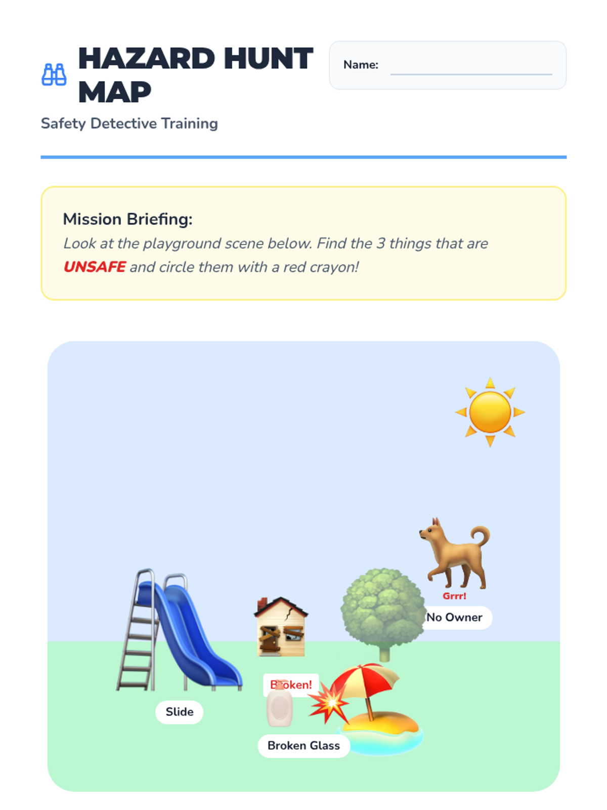 This Pre-K sequence empowers young learners to recognize environmental hazards and trust their physical intuition ('uh-oh' feelings). Students learn to categorize objects by safety, identify body signals, spot playground risks, set personal boundaries, and identify trusted helpers through interactive 'Safety Detective' activities.