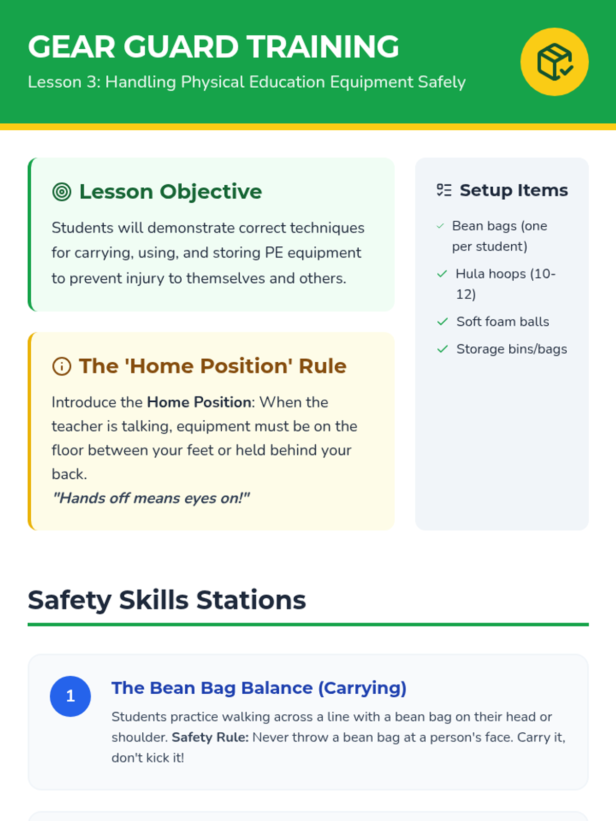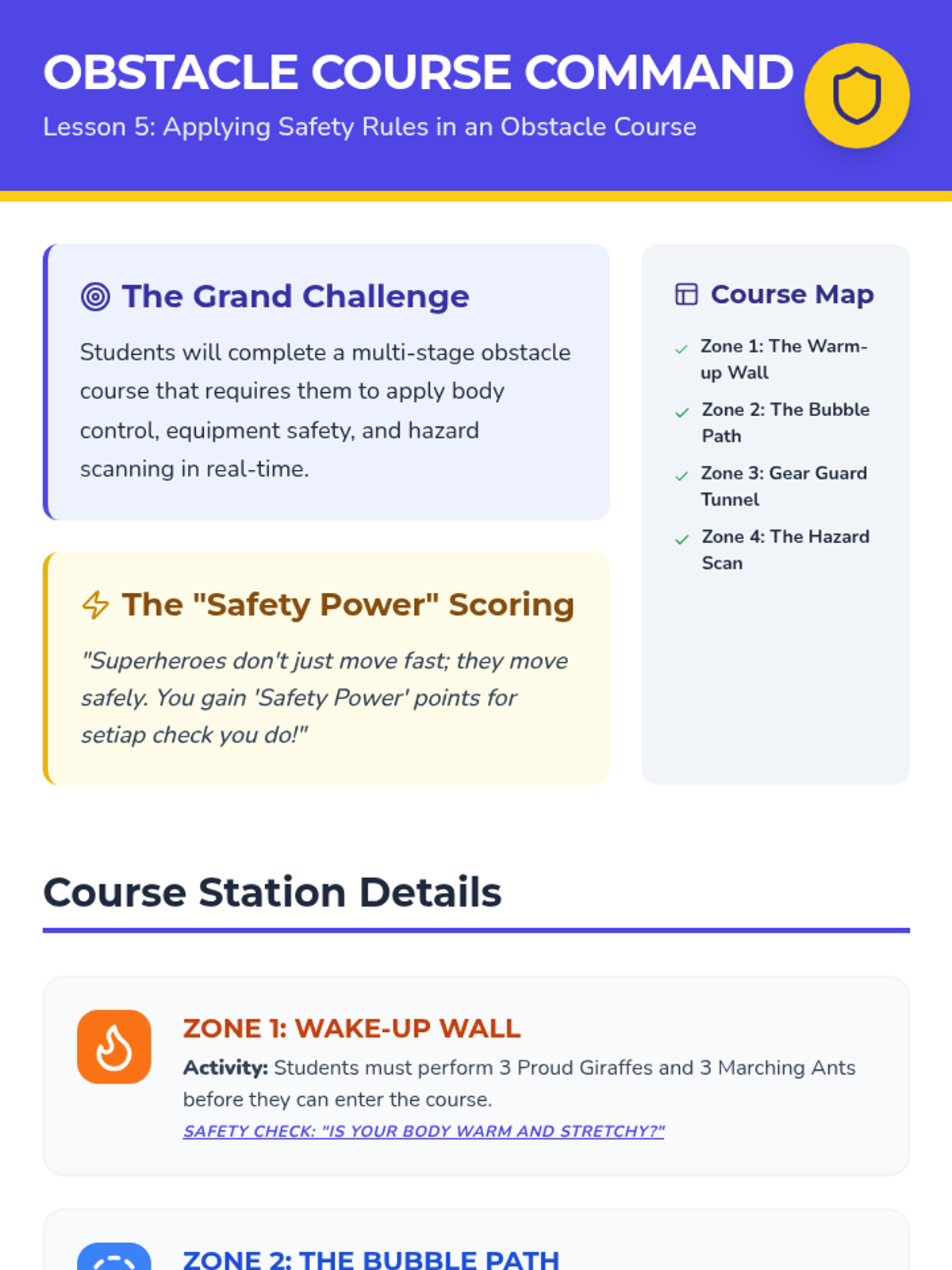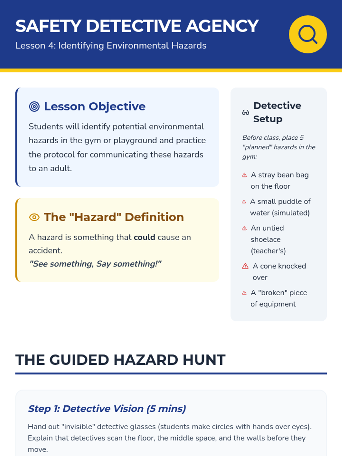 A comprehensive physical education sequence for first graders focused on injury prevention through body control, warm-ups, equipment safety, and environmental awareness. Students learn to navigate physical spaces safely while developing fundamental locomotor skills.