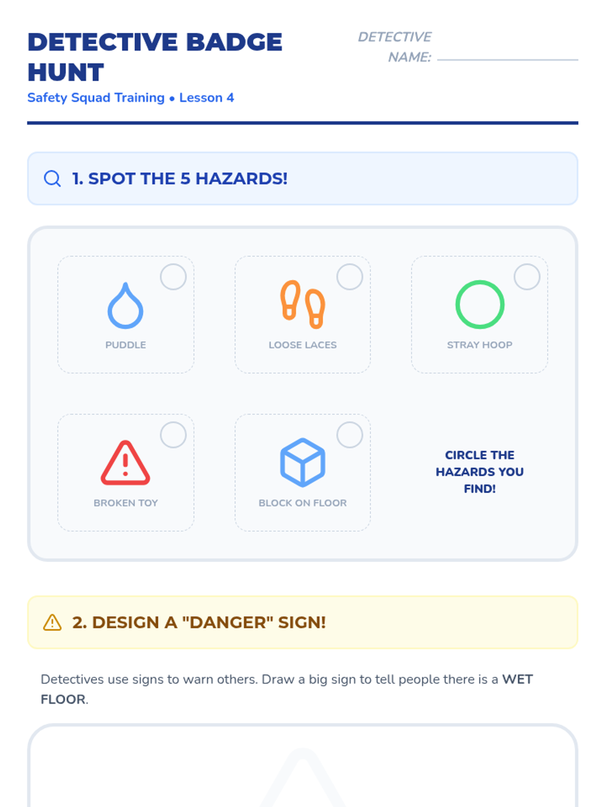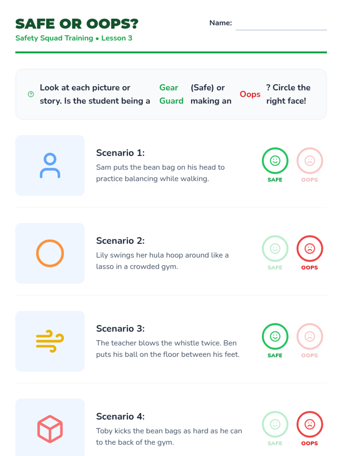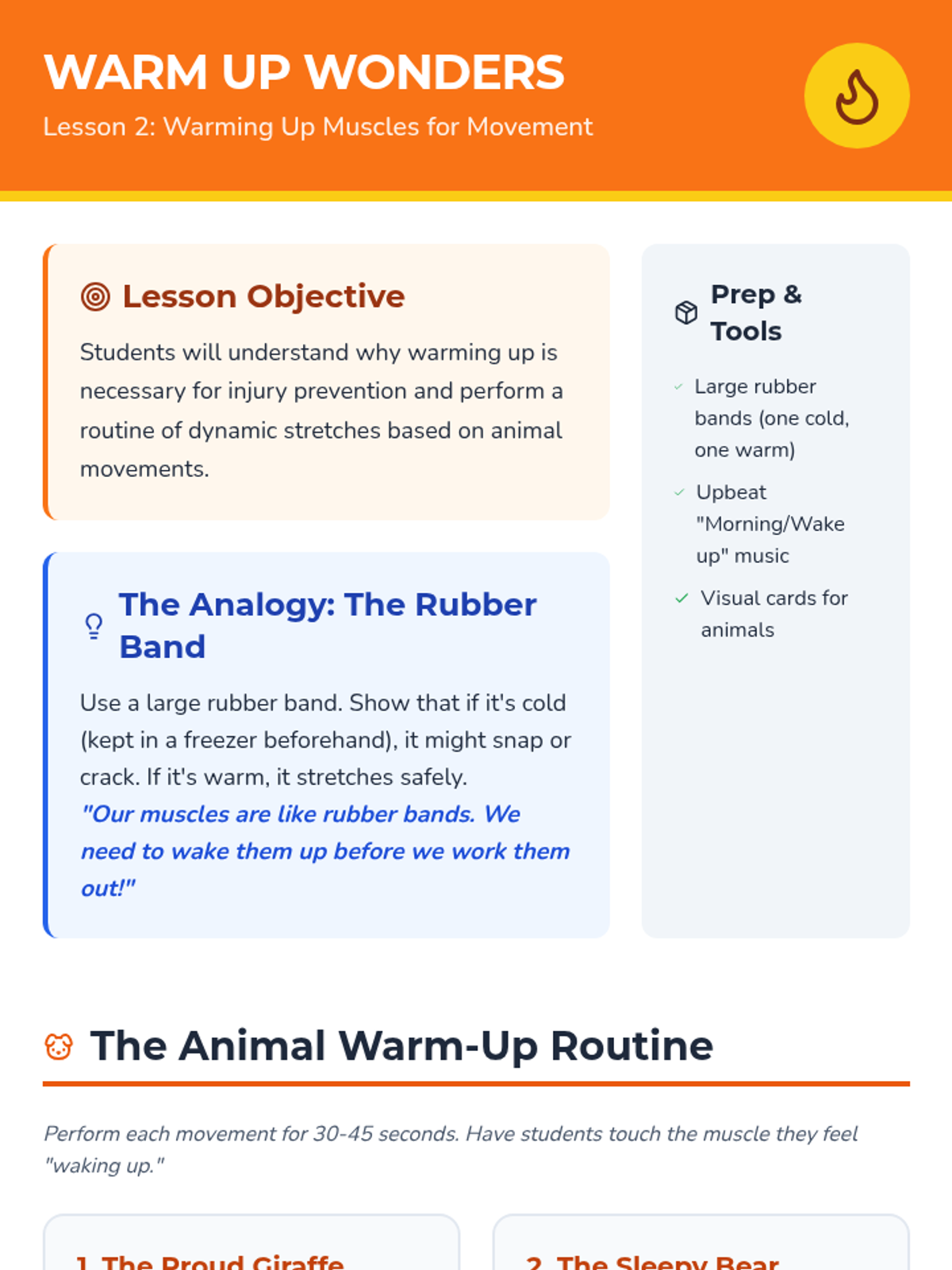 A comprehensive physical education sequence for first graders focused on injury prevention through body control, warm-ups, equipment safety, and environmental awareness. Students learn to navigate physical spaces safely while developing fundamental locomotor skills.