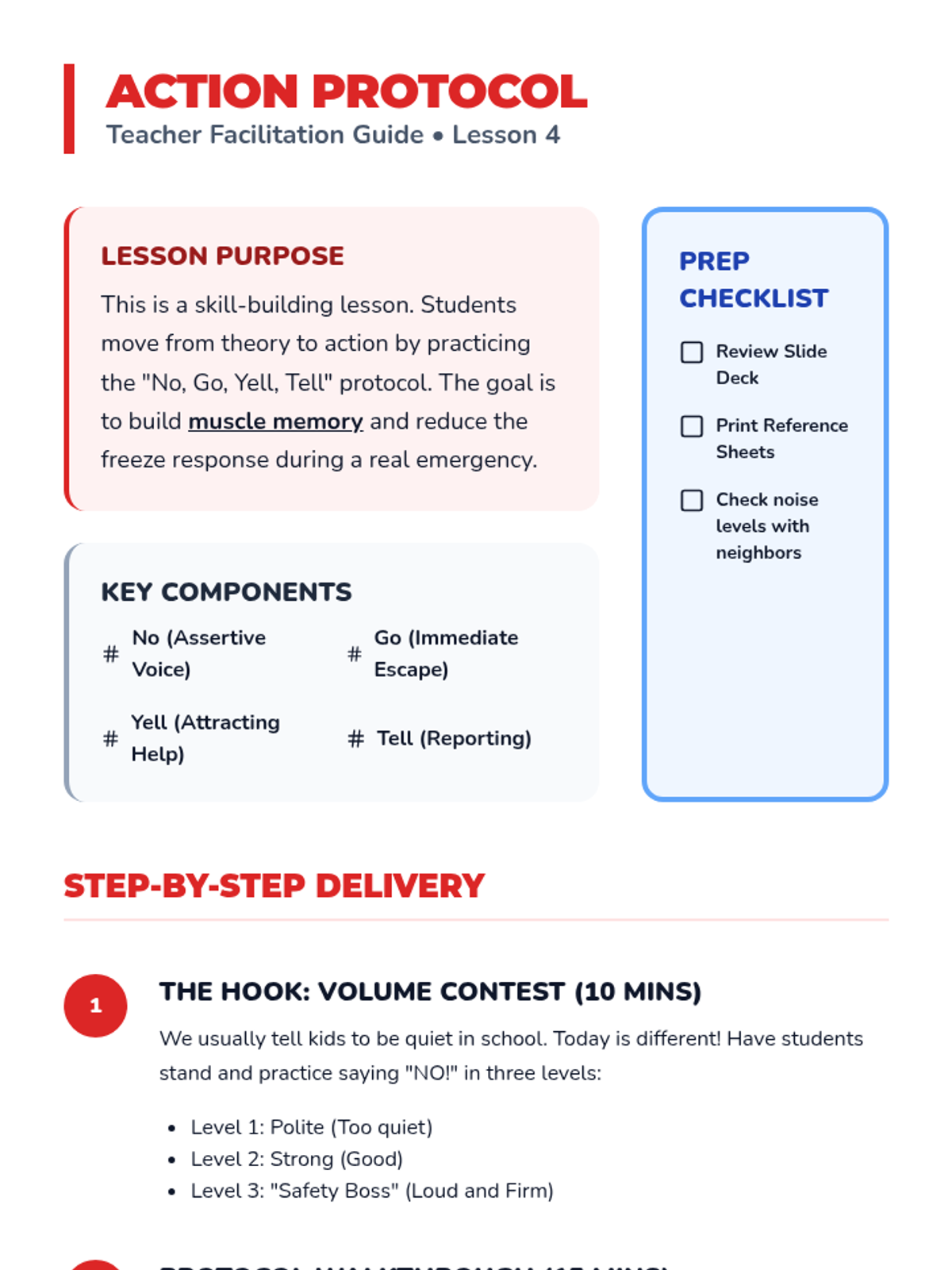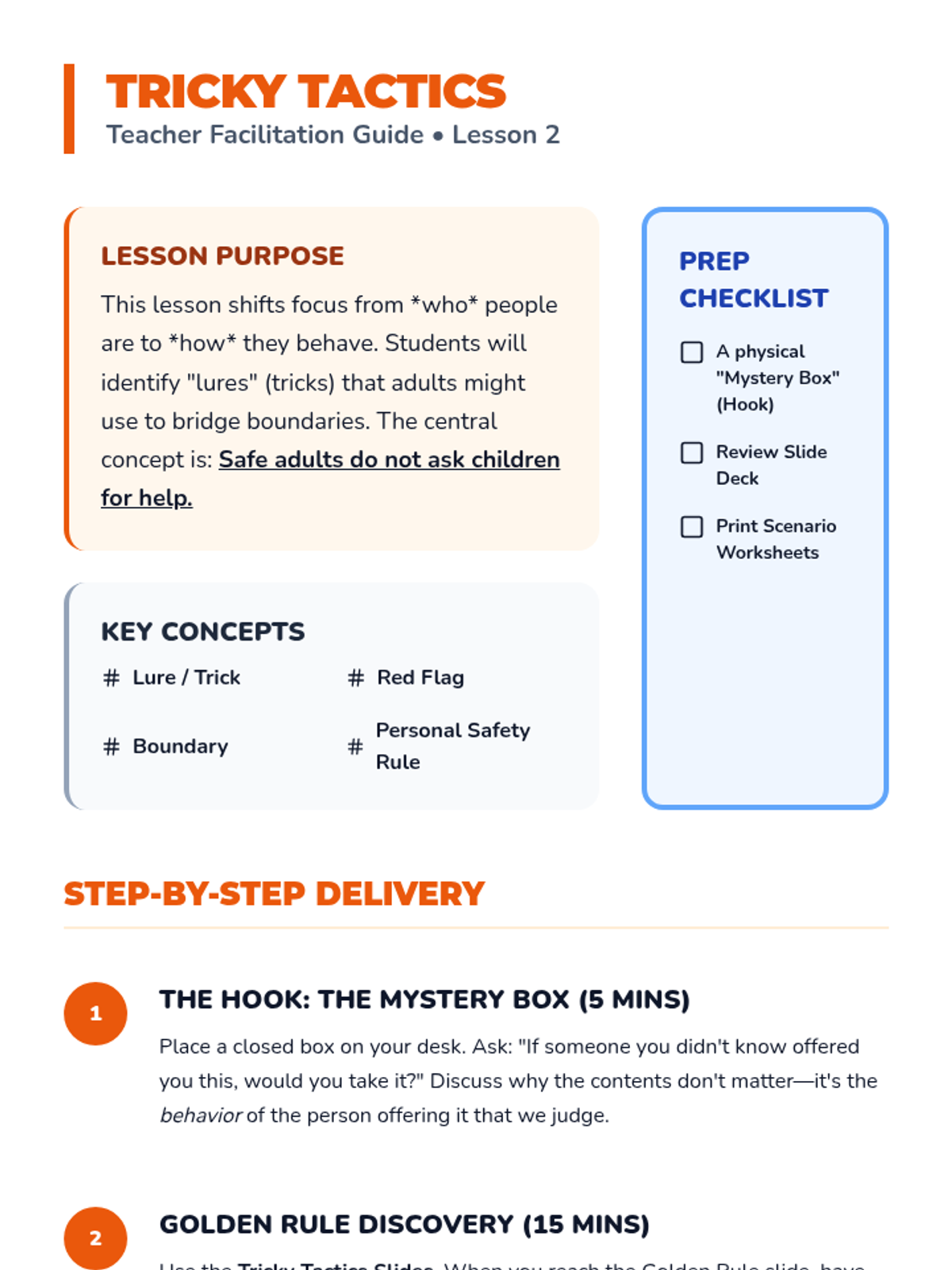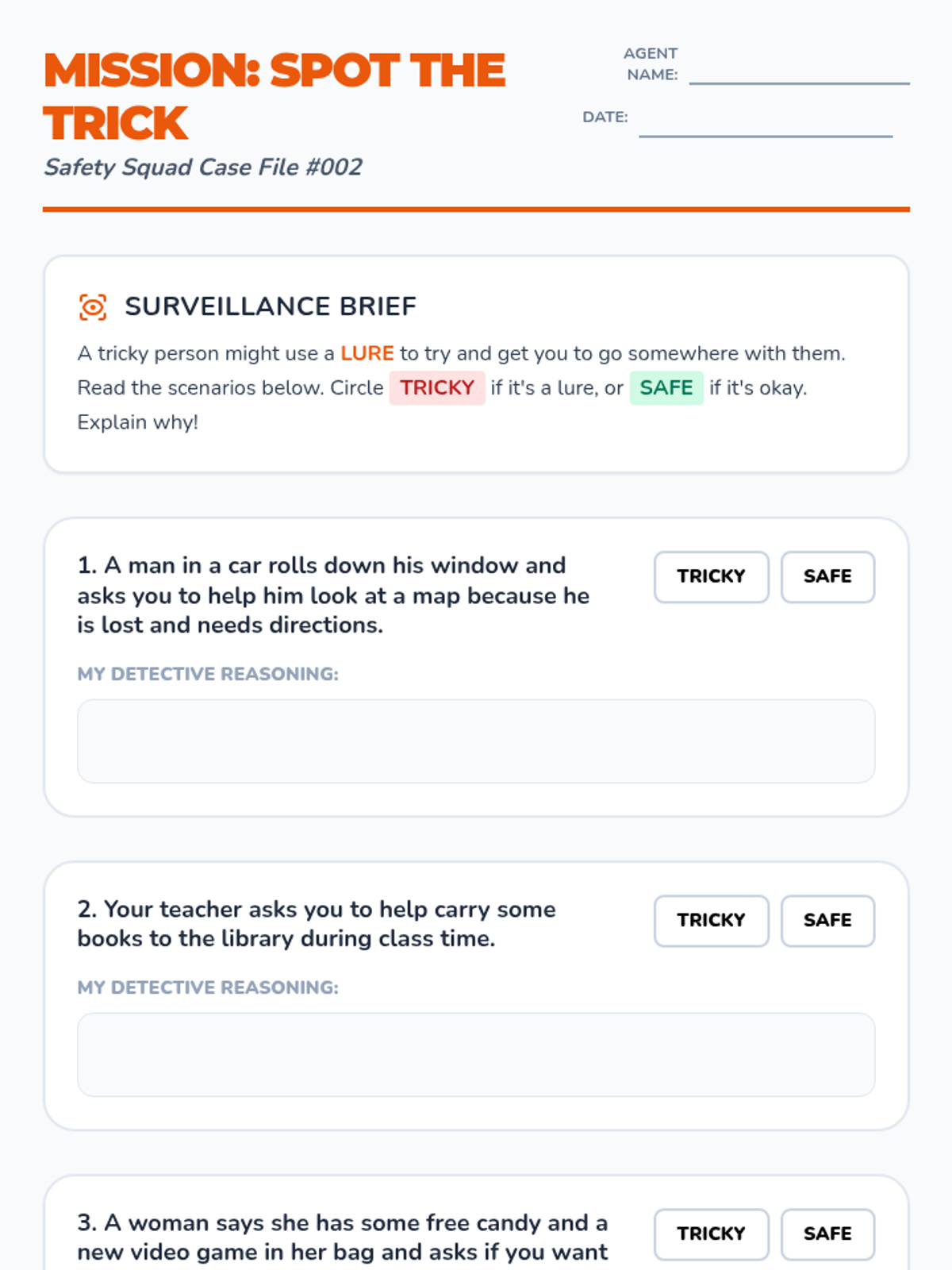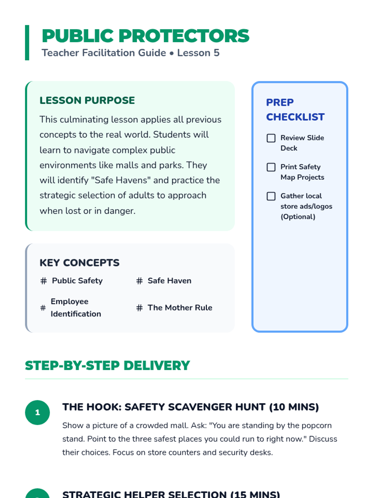 A comprehensive 5-lesson sequence for 3rd-grade students focused on identifying safe adults, recognizing luring tactics, trusting intuition, and practicing emergency response protocols like 'No, Go, Yell, Tell.' Students transition from basic categorization to active problem-solving in public spaces.