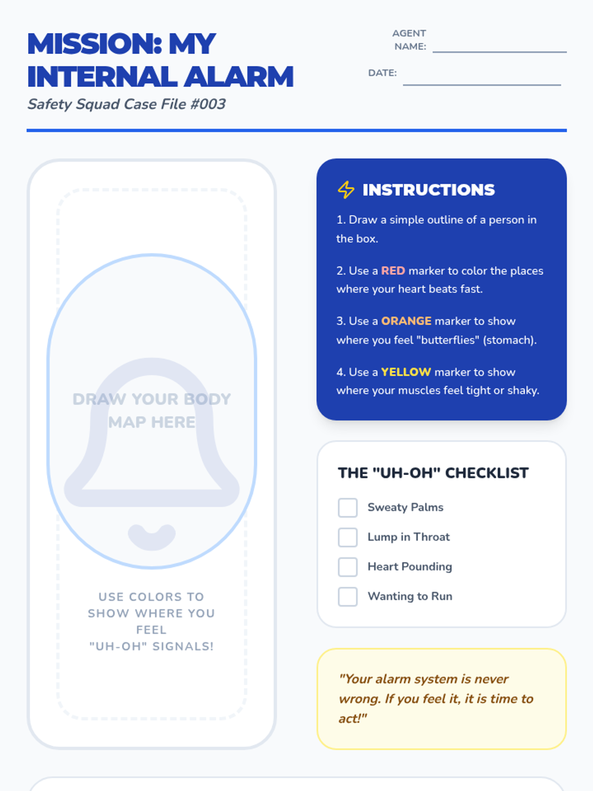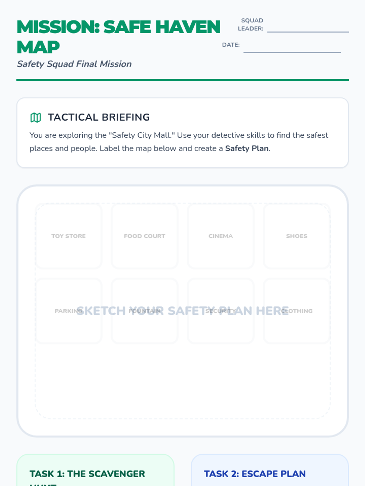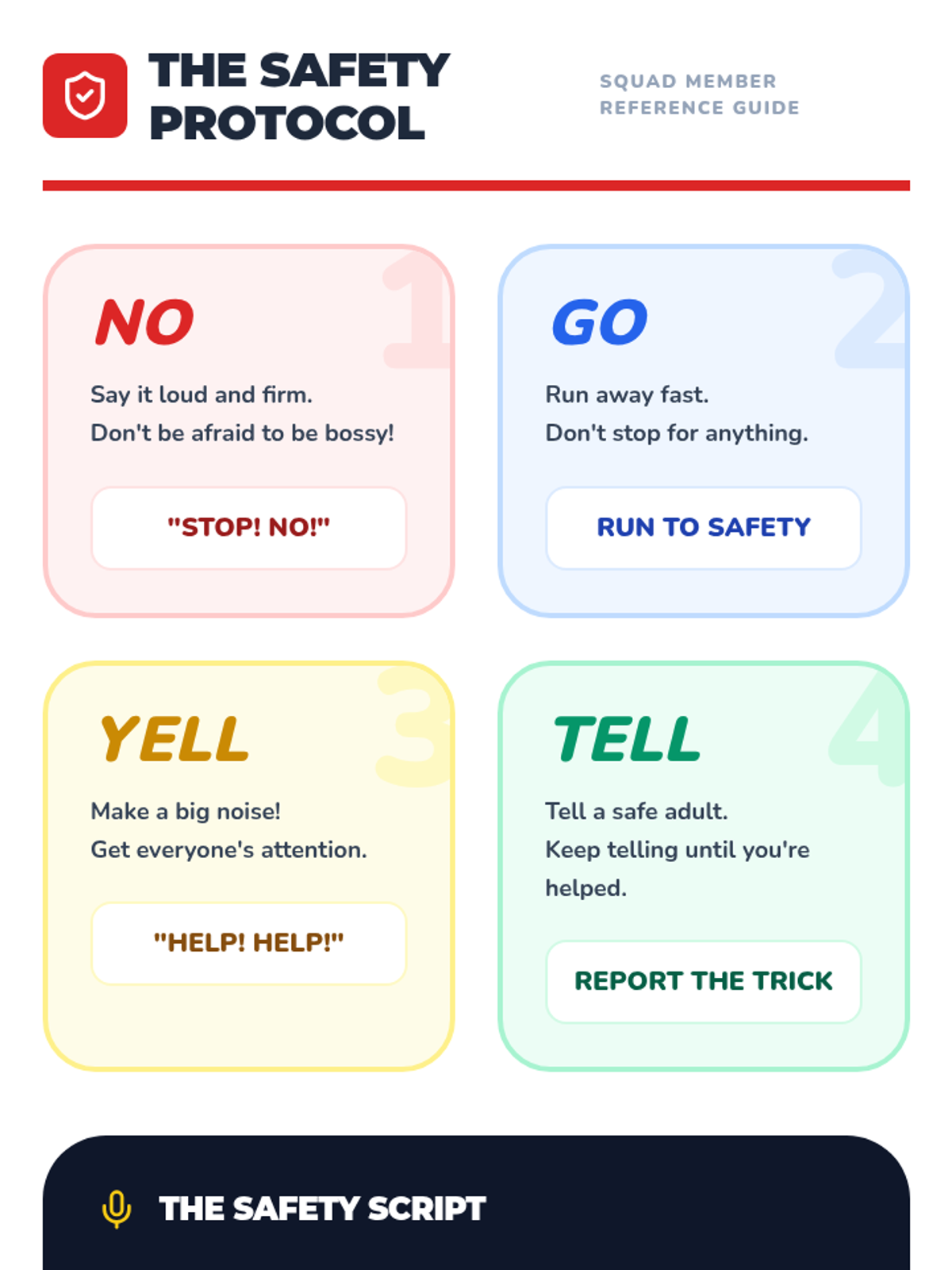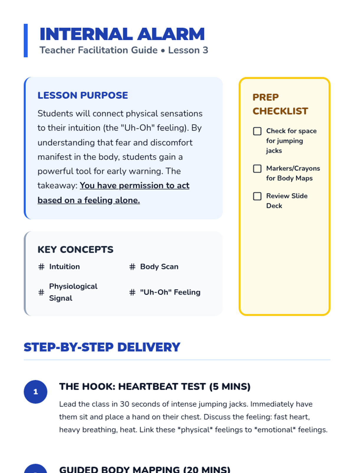 A comprehensive 5-lesson sequence for 3rd-grade students focused on identifying safe adults, recognizing luring tactics, trusting intuition, and practicing emergency response protocols like 'No, Go, Yell, Tell.' Students transition from basic categorization to active problem-solving in public spaces.