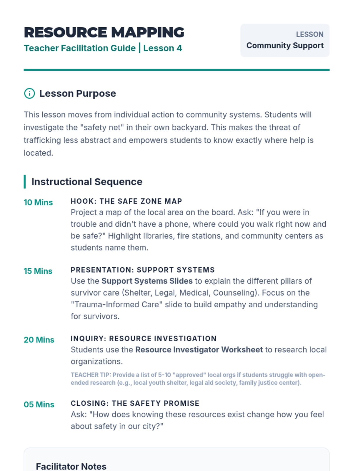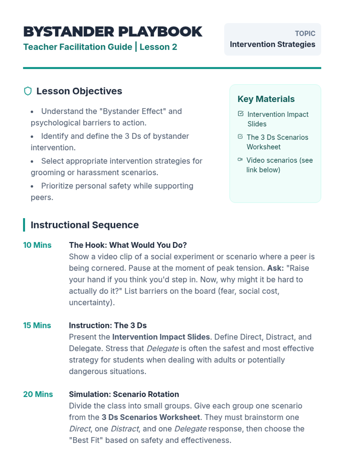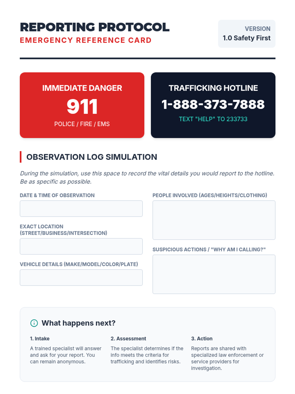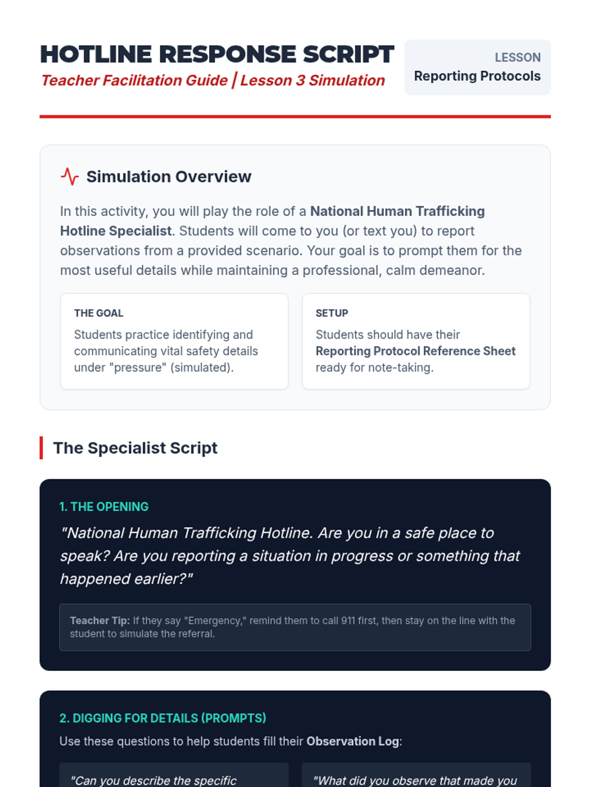 This action-oriented sequence empowers students with the knowledge and skills to act if they suspect trafficking. Moving beyond awareness, students learn the specific protocols for reporting, the importance of bystander intervention, and how to access local and national resources.
