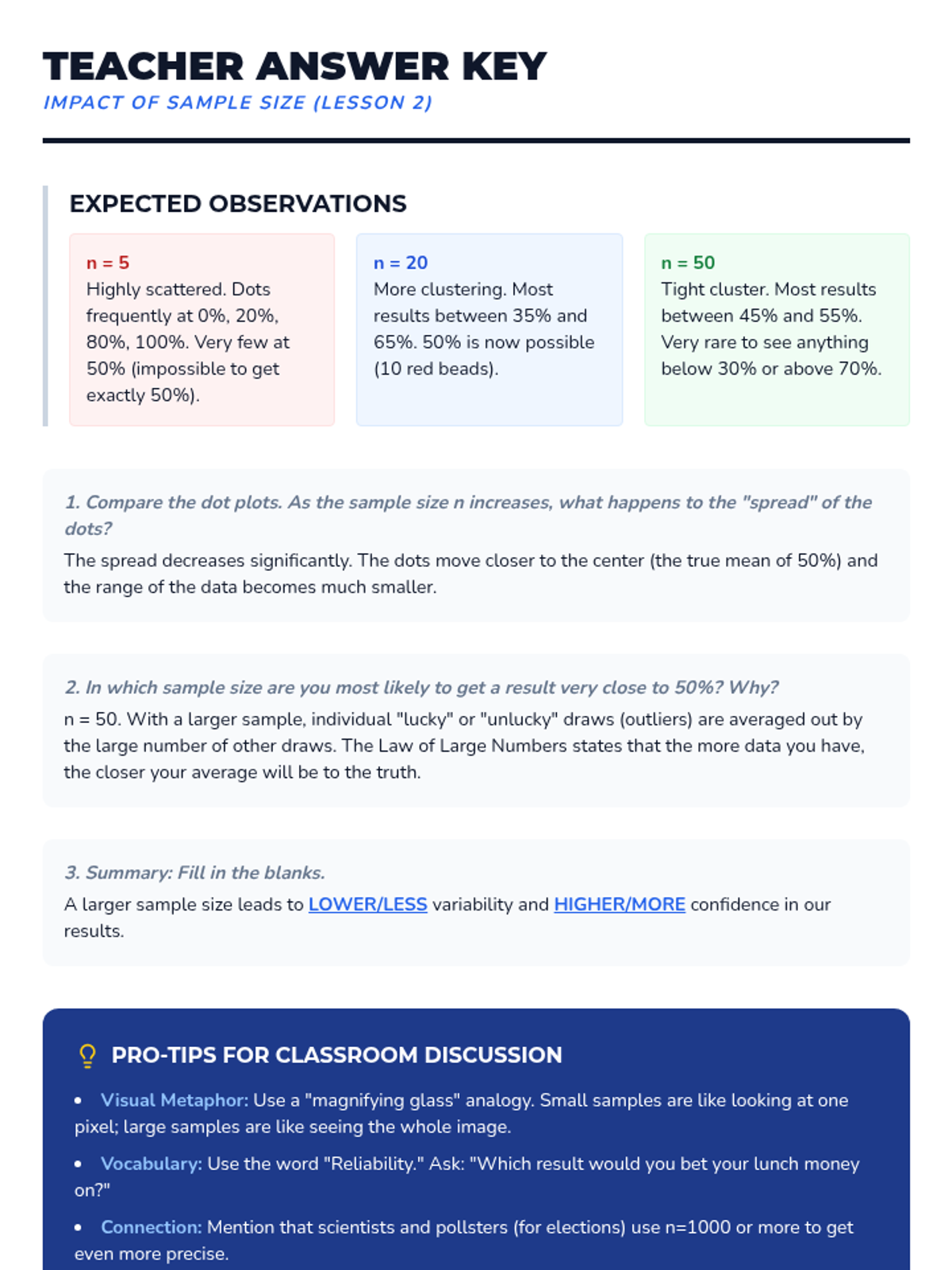 This 5-lesson sequence explores how sample size influences variability and the reliability of statistical inferences. Students participate in simulations to discover the law of large numbers, use Mean Absolute Deviation to quantify spread, and evaluate the validity of real-world sampling methods.