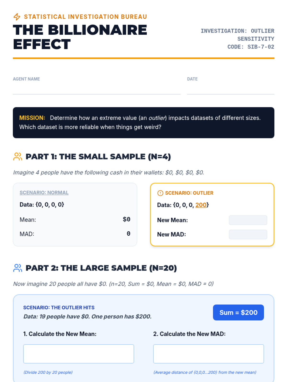 An inquiry-based exploration of sampling, outliers, and data reliability for 7th-grade students. Students investigate how sample size and variability impact the conclusions we draw about populations.