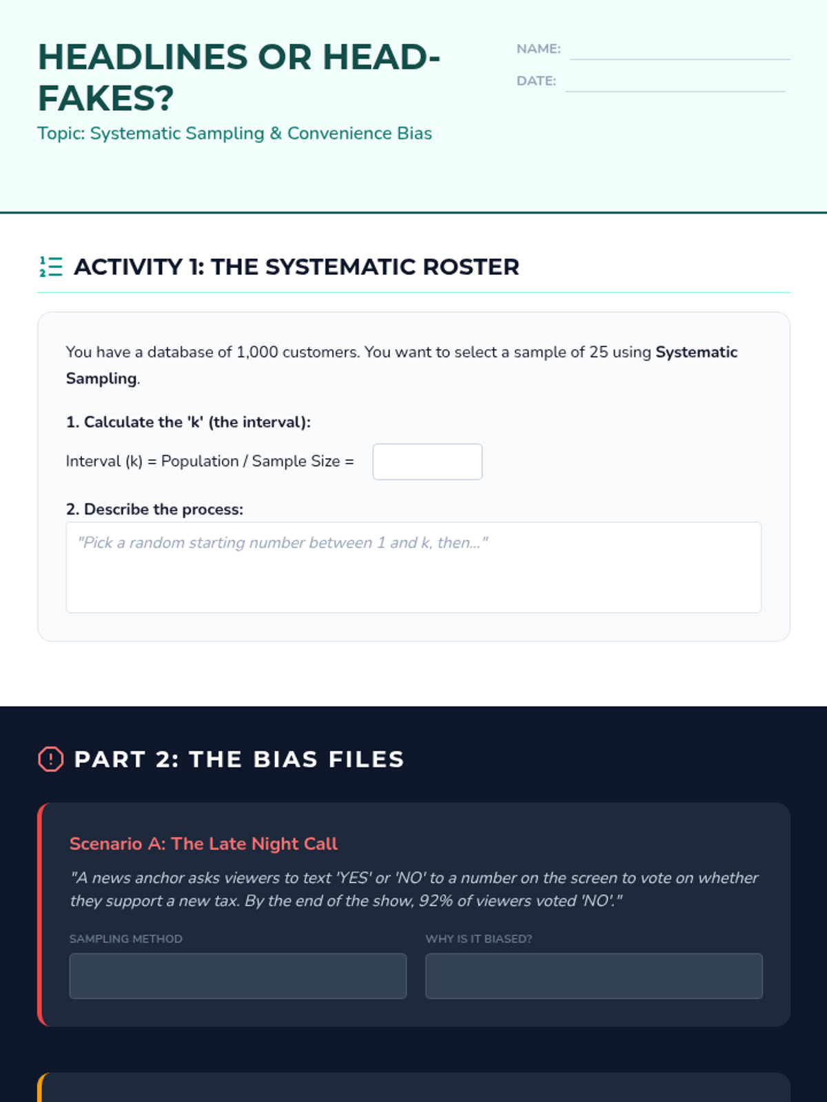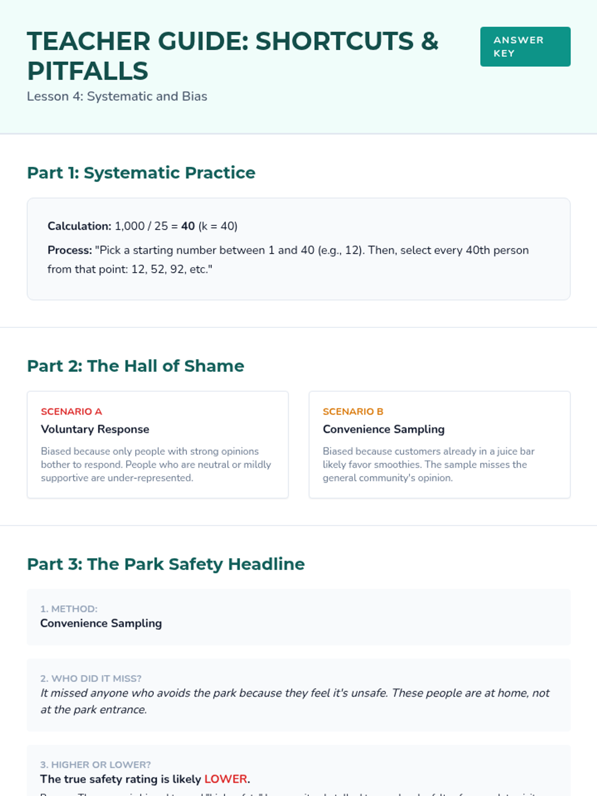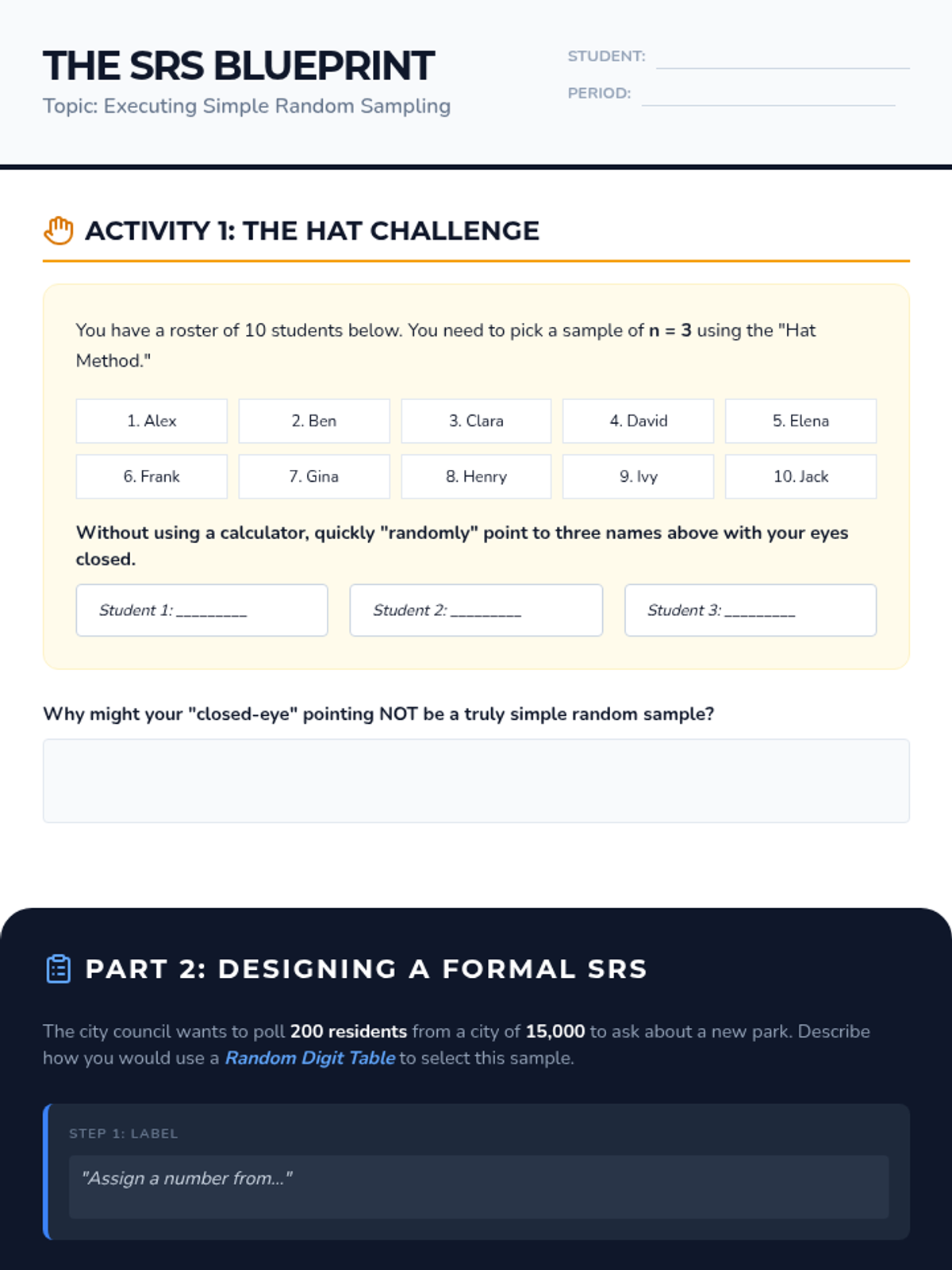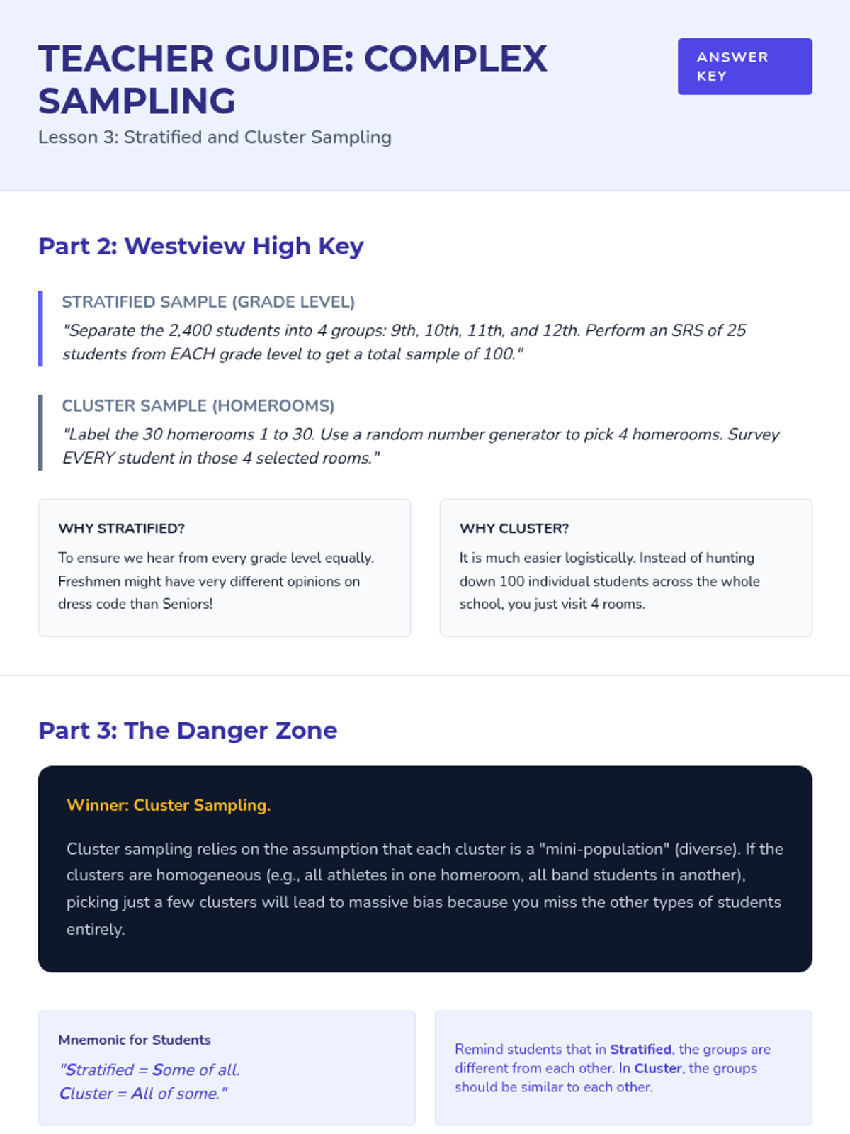A comprehensive 9th-grade statistics sequence exploring populations, sampling methods (SRS, stratified, cluster, systematic), and the identification of bias in data collection. Students progress from foundational definitions to critiquing the validity of real-world statistical claims.