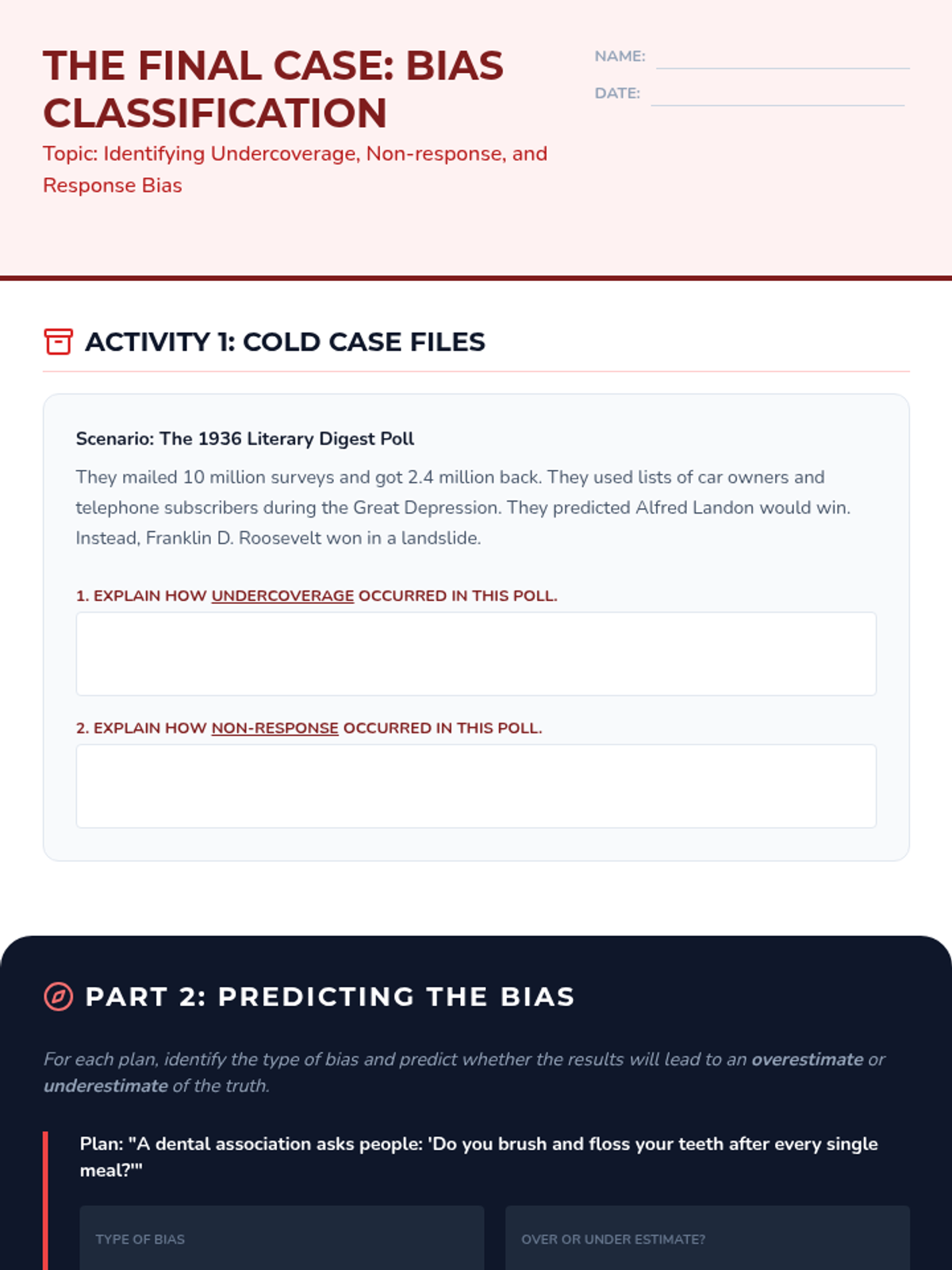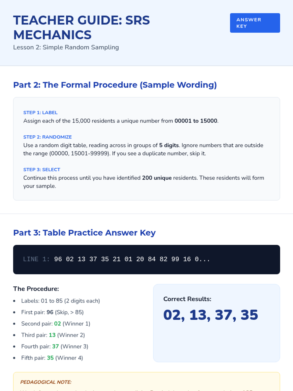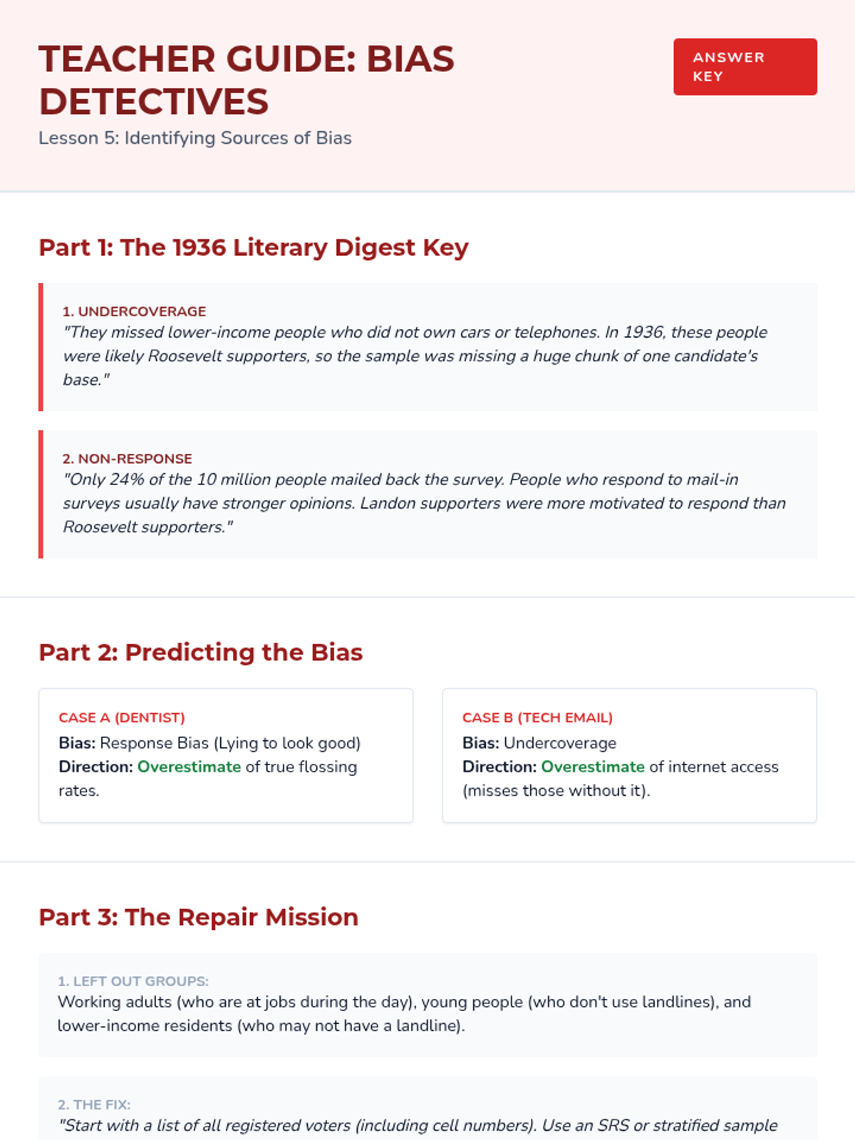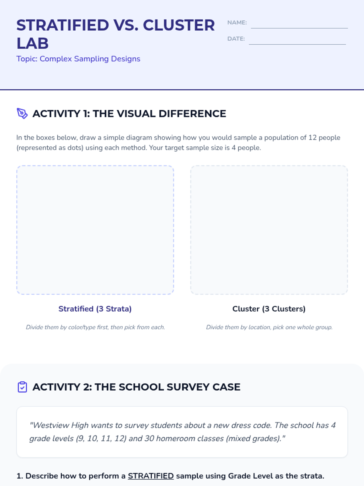 A comprehensive 9th-grade statistics sequence exploring populations, sampling methods (SRS, stratified, cluster, systematic), and the identification of bias in data collection. Students progress from foundational definitions to critiquing the validity of real-world statistical claims.