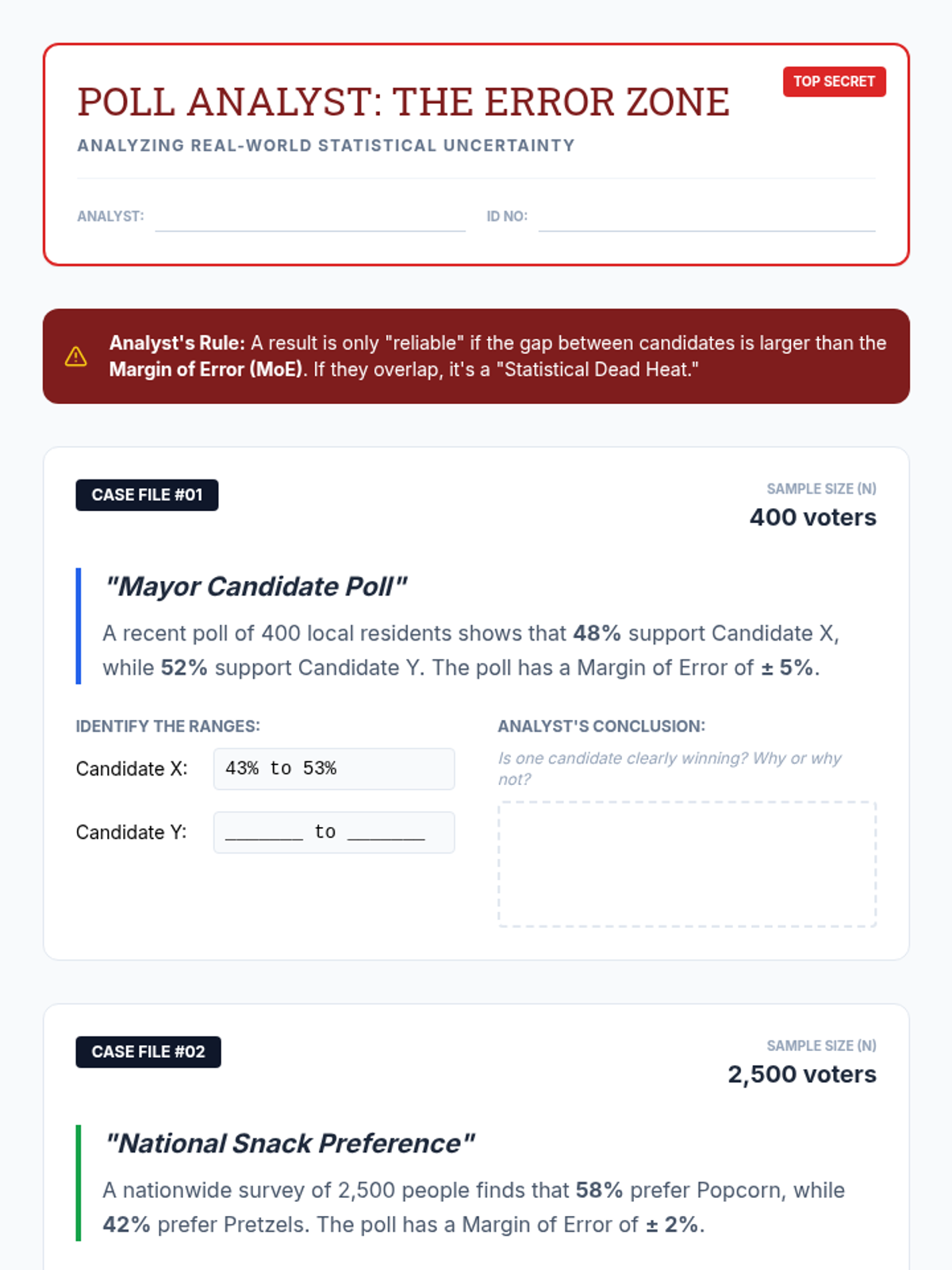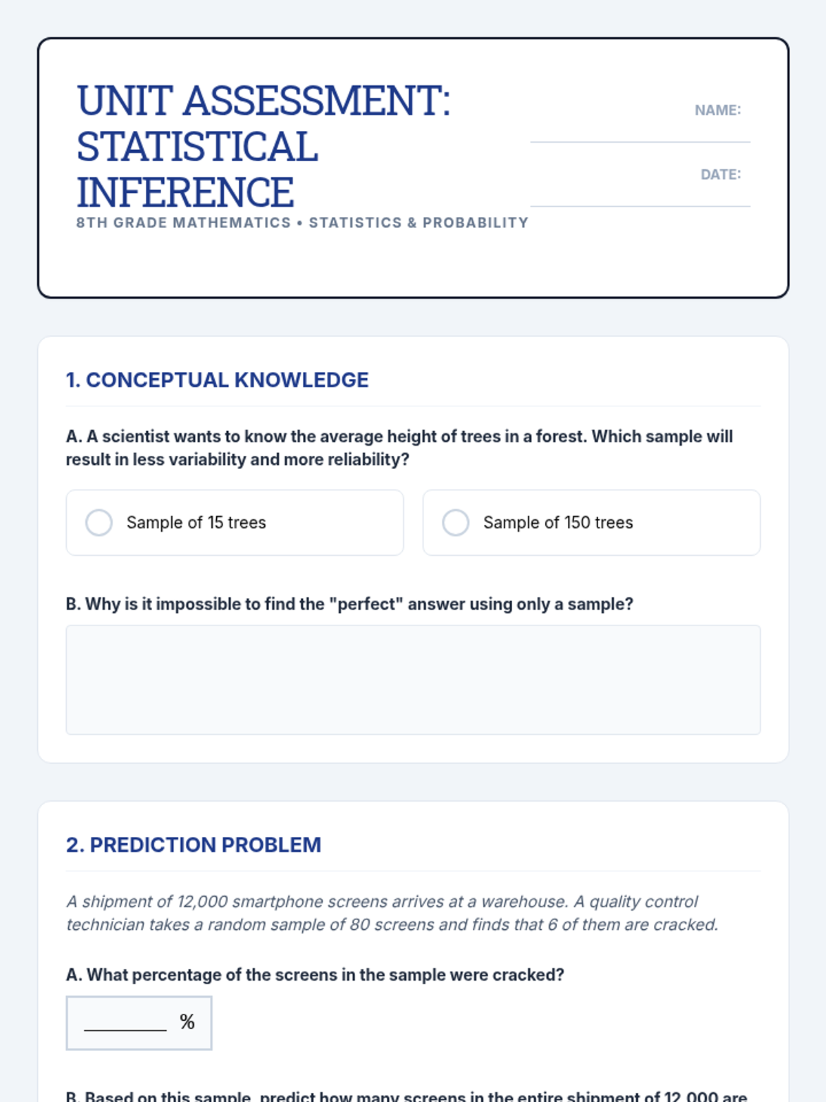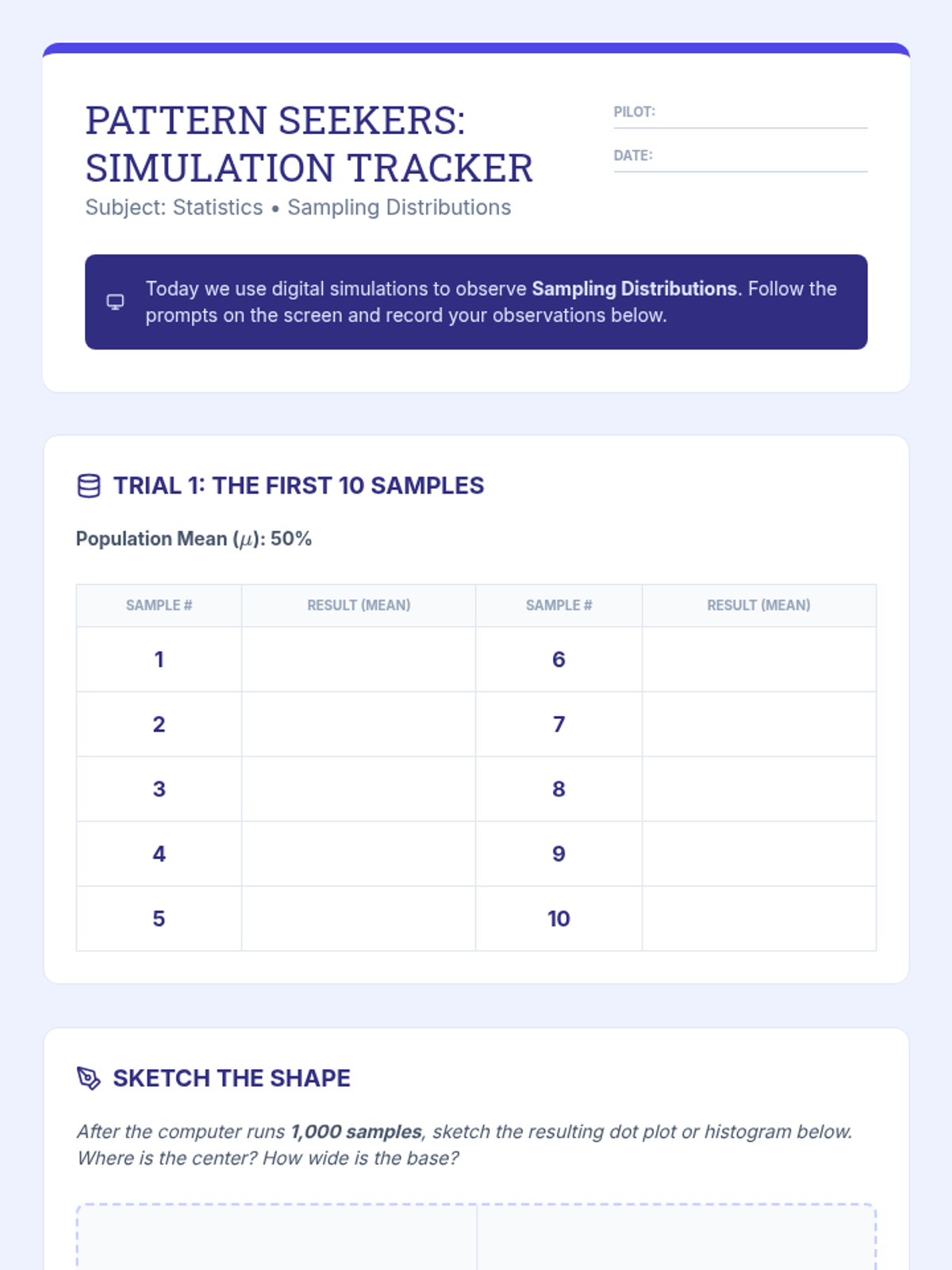 This inquiry-based sequence focuses on the relationship between sample size and the reliability of inferences. Students use technology and simulations to visualize how large samples stabilize around population parameters, introducing the Law of Large Numbers and Margin of Error concepts.