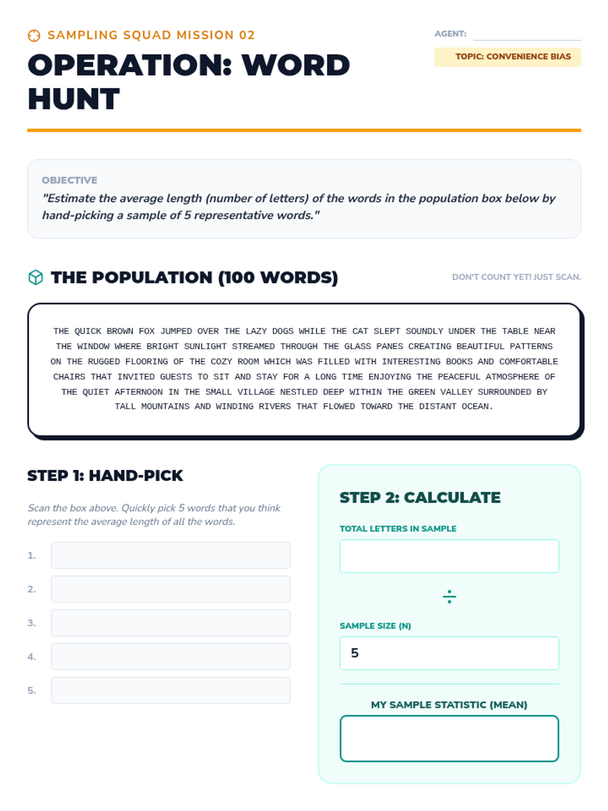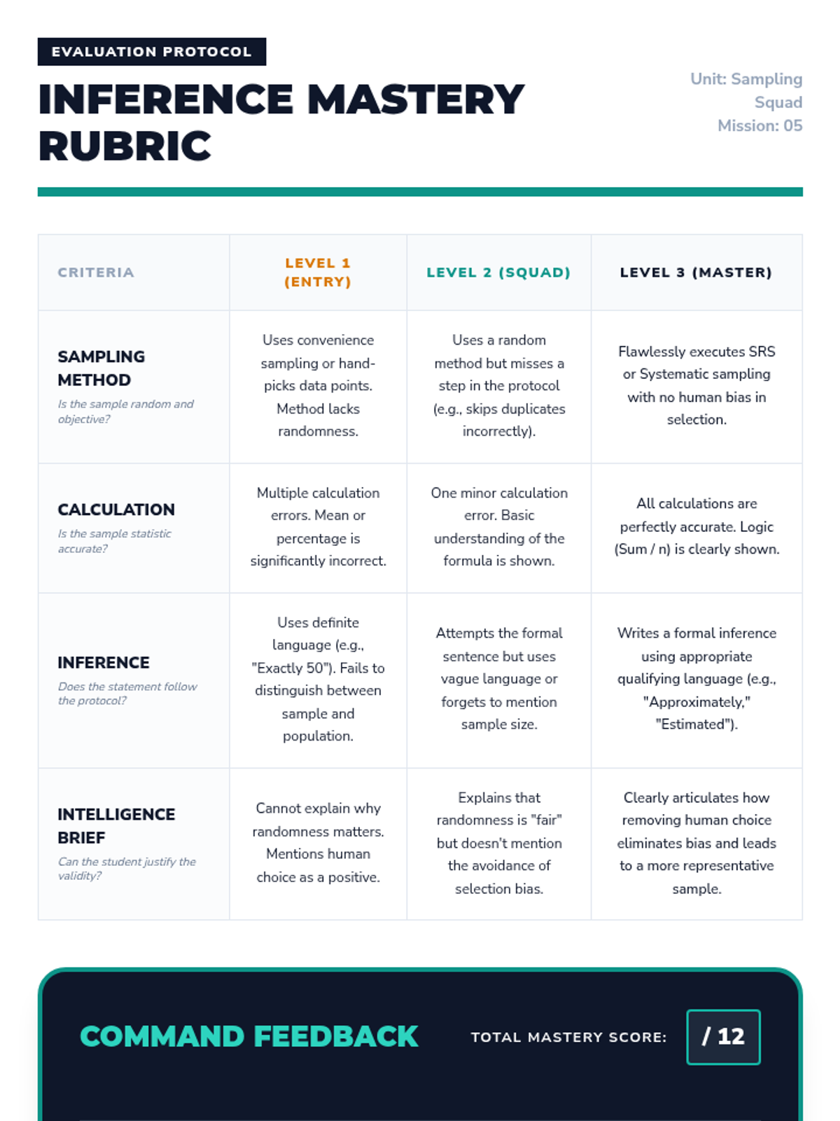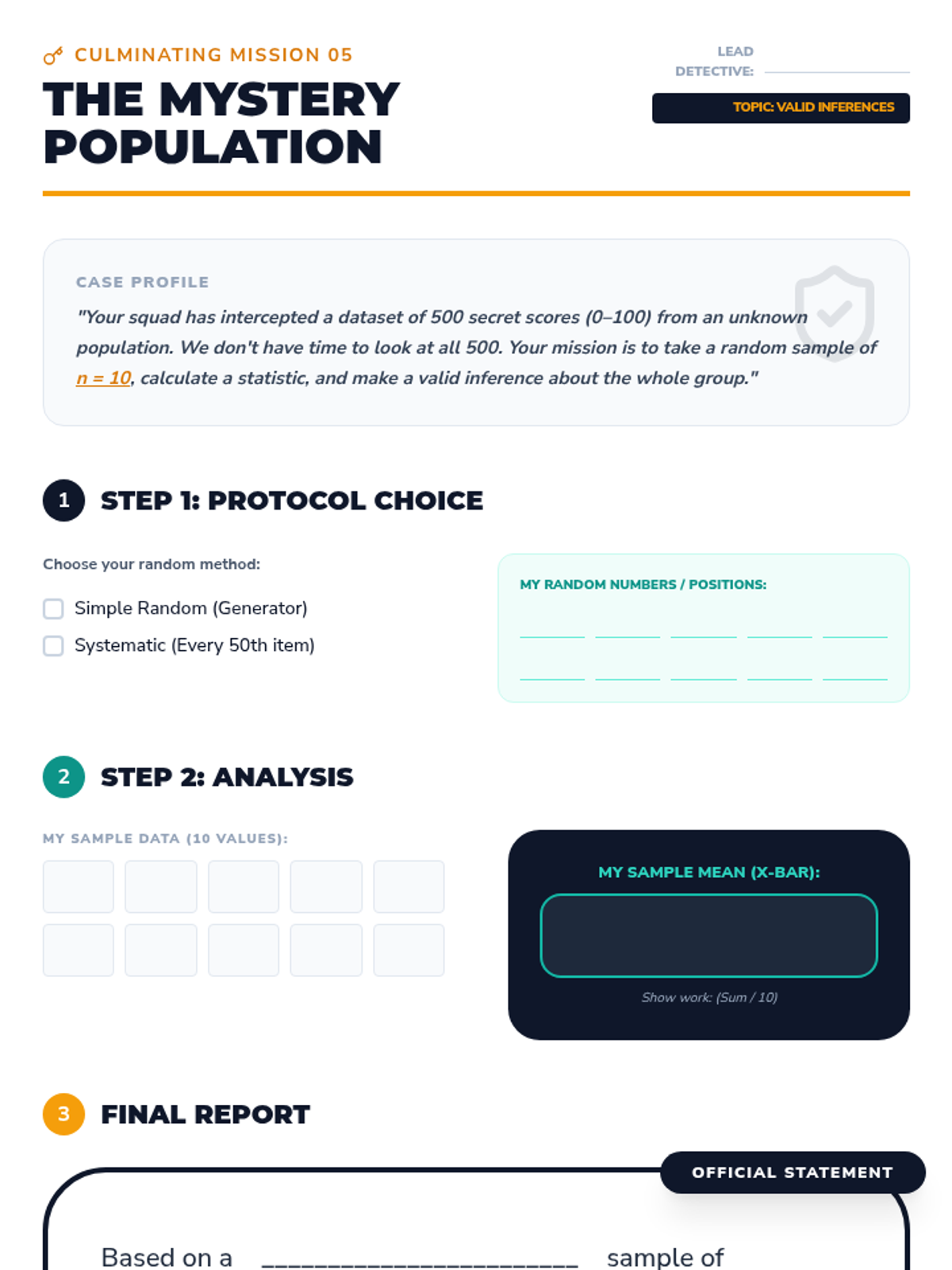 A comprehensive 7th-grade unit on statistical sampling, moving from conceptual definitions to hands-on simulations of bias, the mechanics of random selection, and making valid inferences about populations.