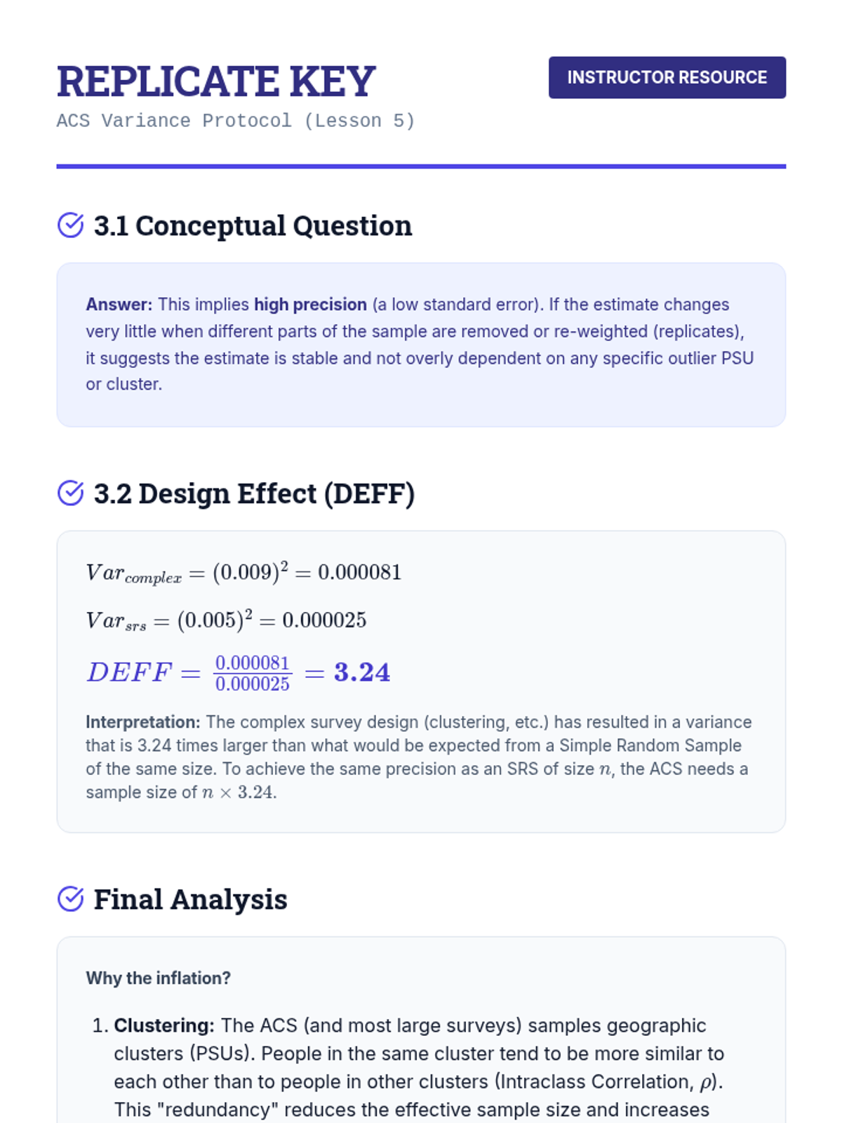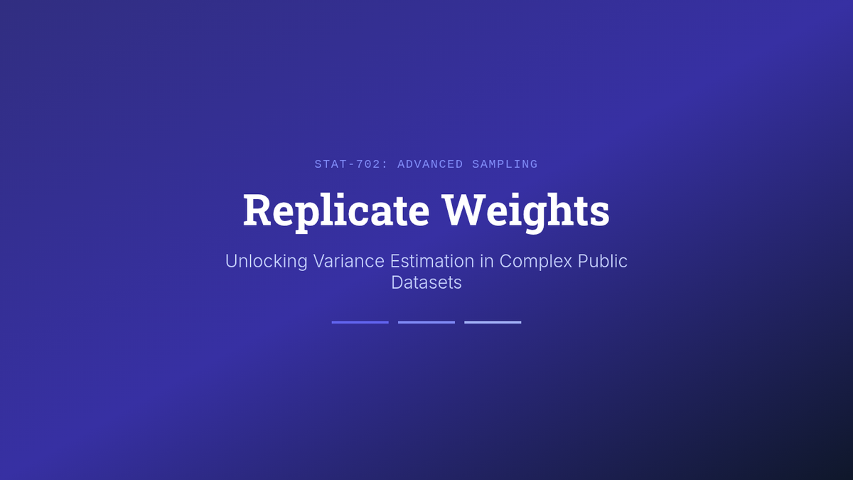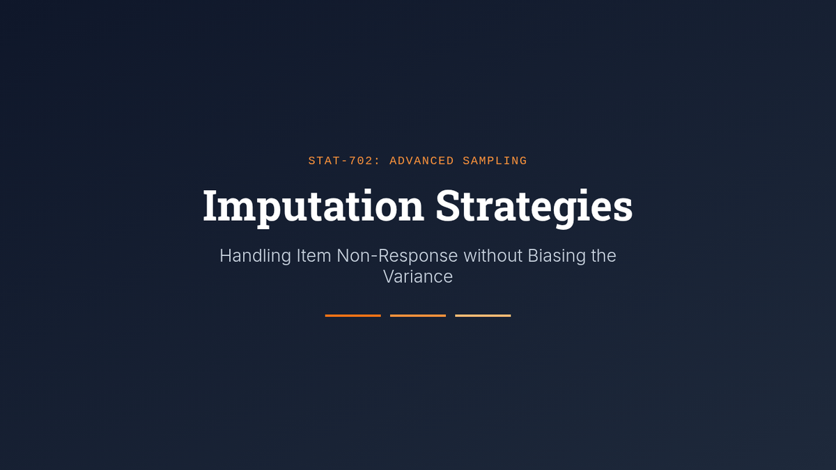 An advanced graduate-level module on statistical sampling techniques focusing on the mathematical correction of data after collection. Topics include probability weights, non-response adjustment through raking, imputation of missing values, and computational variance estimation via Bootstrap and Jackknife methods.