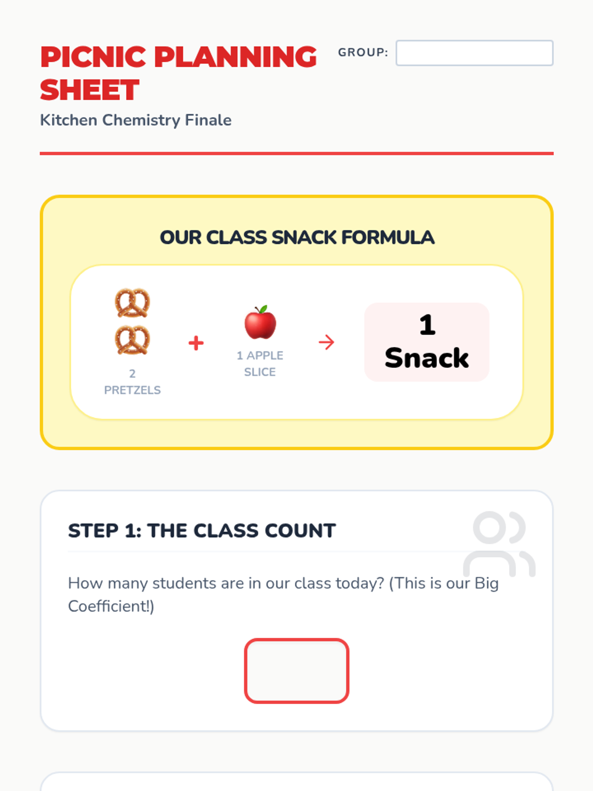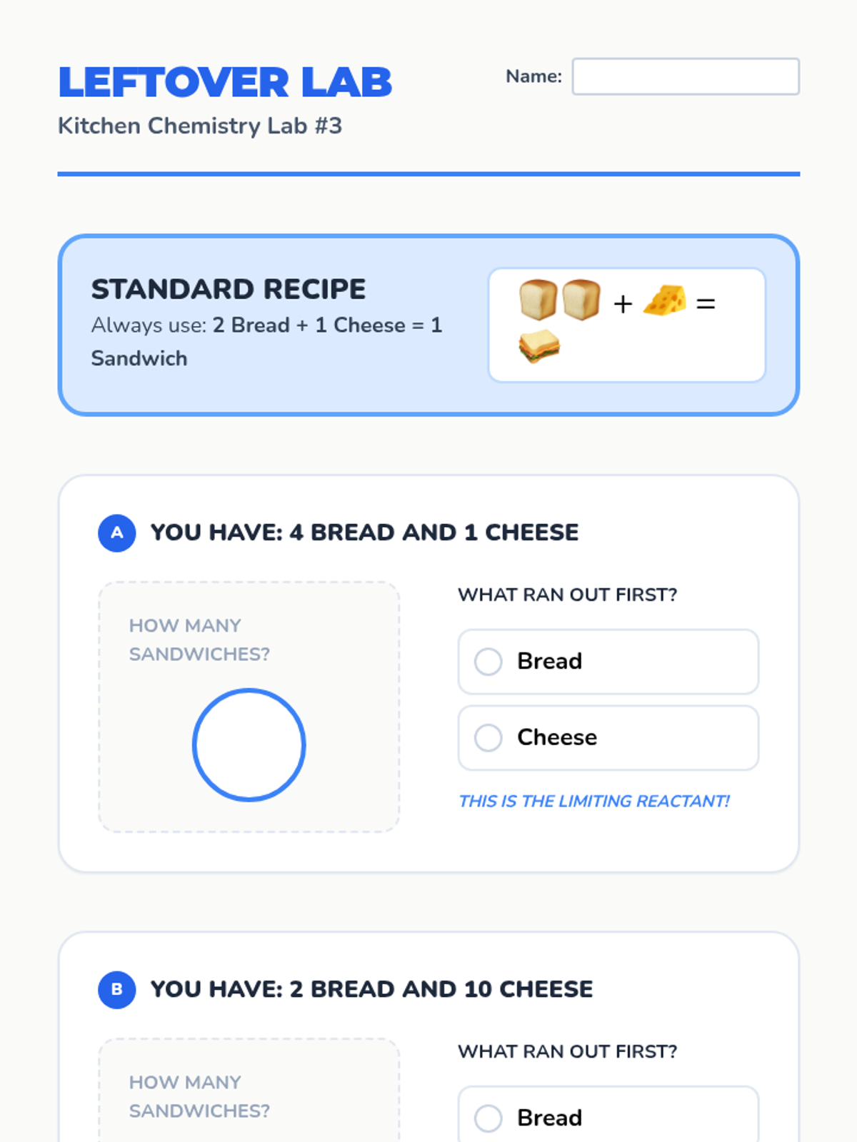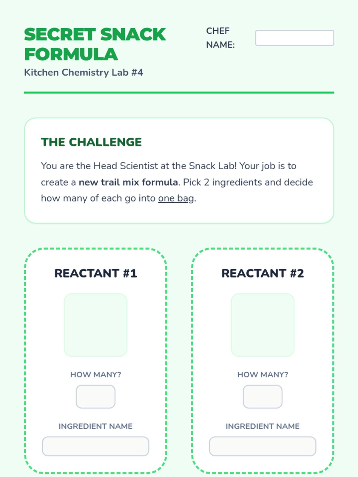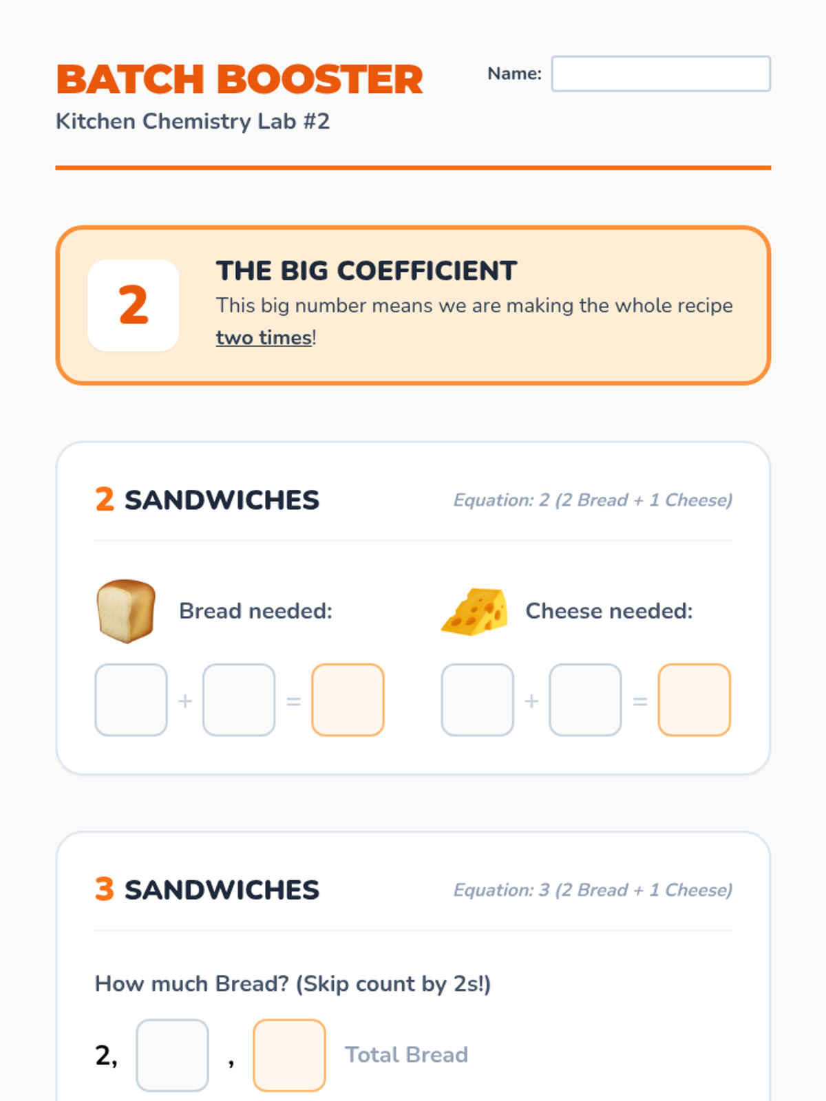 A 1st-grade chemistry unit that uses the metaphor of sandwich-making and snack recipes to introduce chemical formulas, coefficients, and limiting reactants through simple math and visual patterns.