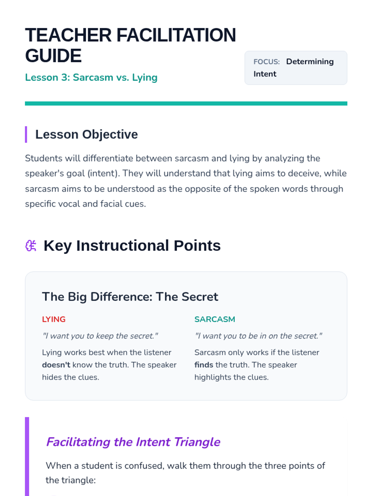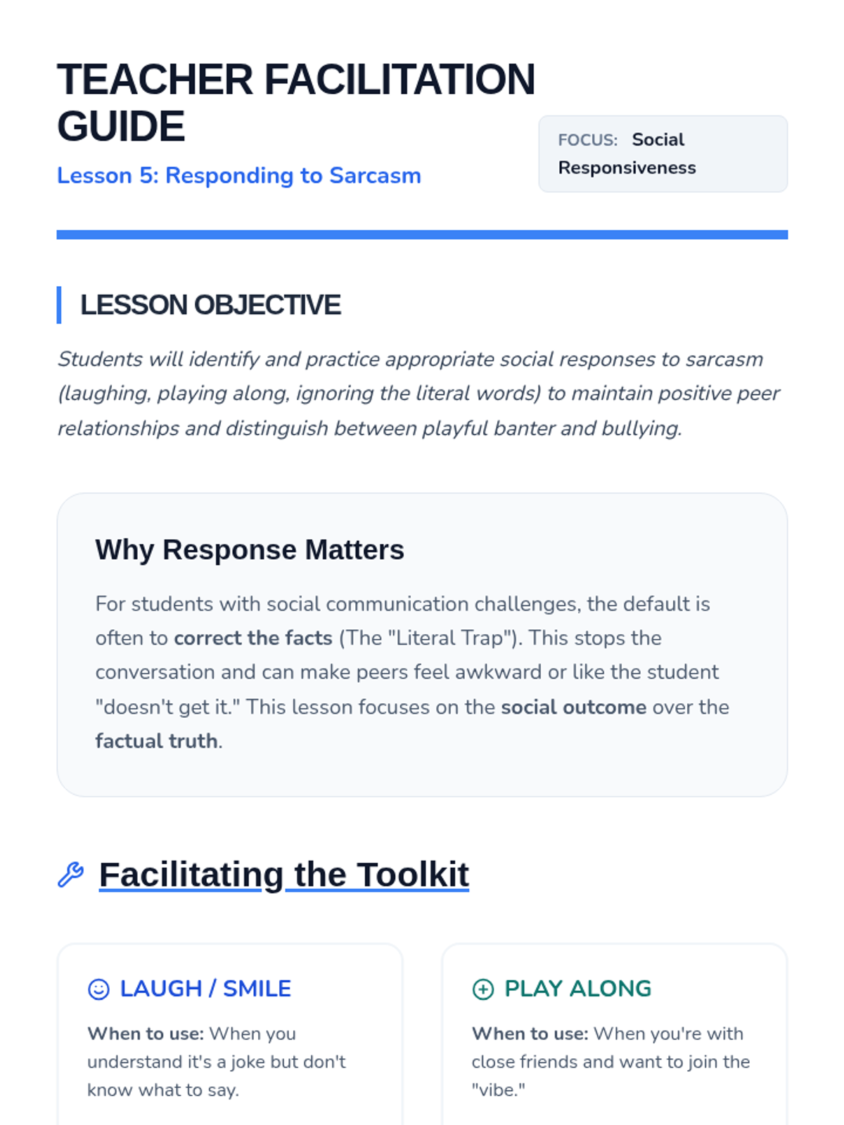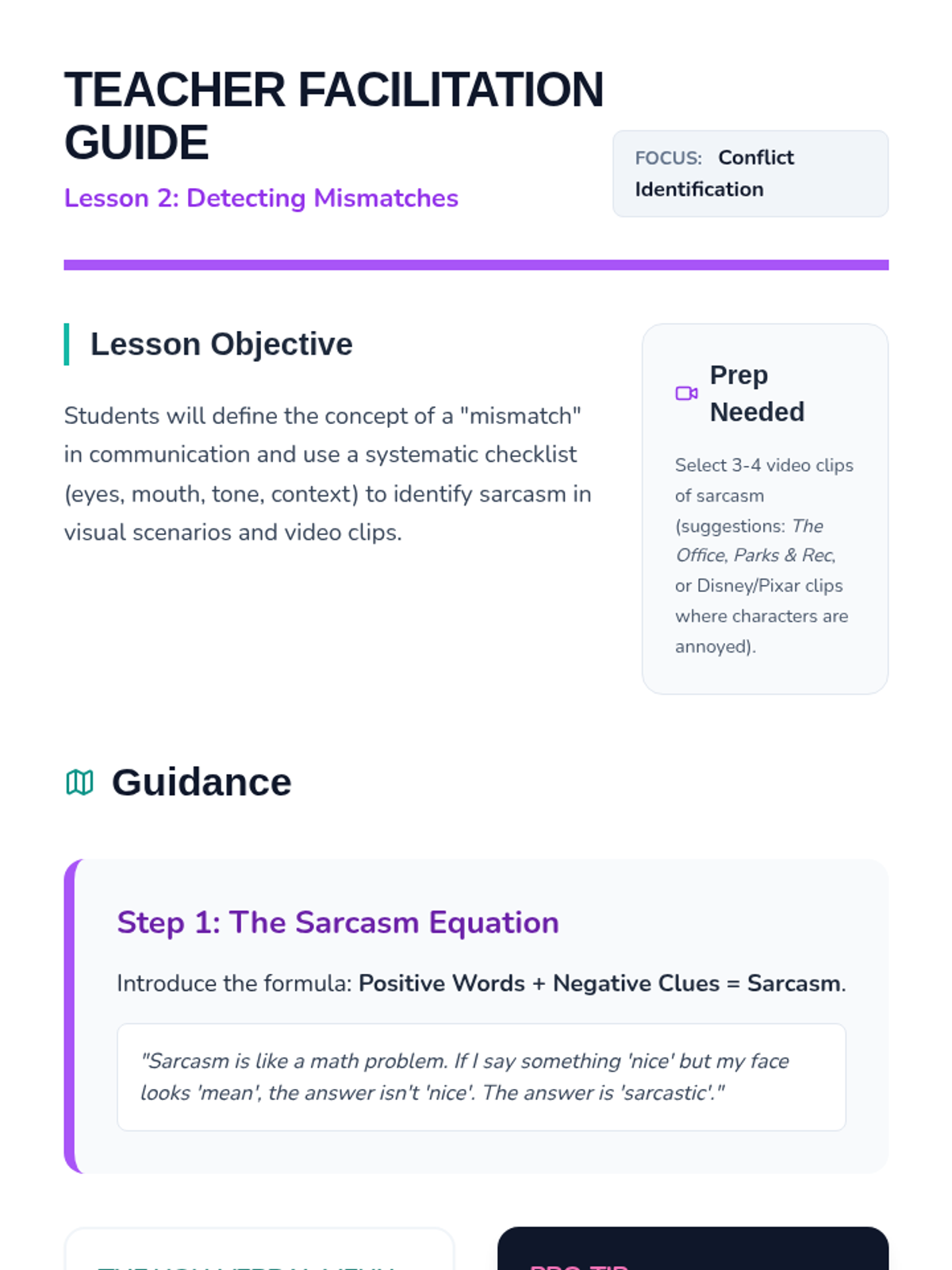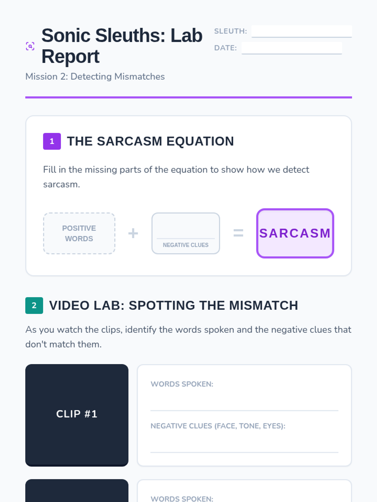 A social communication sequence for 7th-grade students focused on interpreting sarcasm and vocal tone. Students learn to identify 'mismatches' between verbal and non-verbal cues to understand the underlying meaning of social interactions.