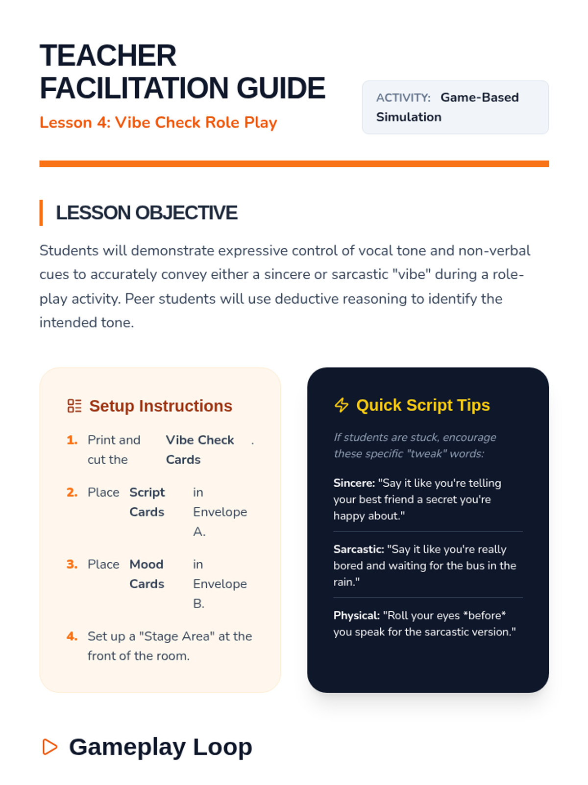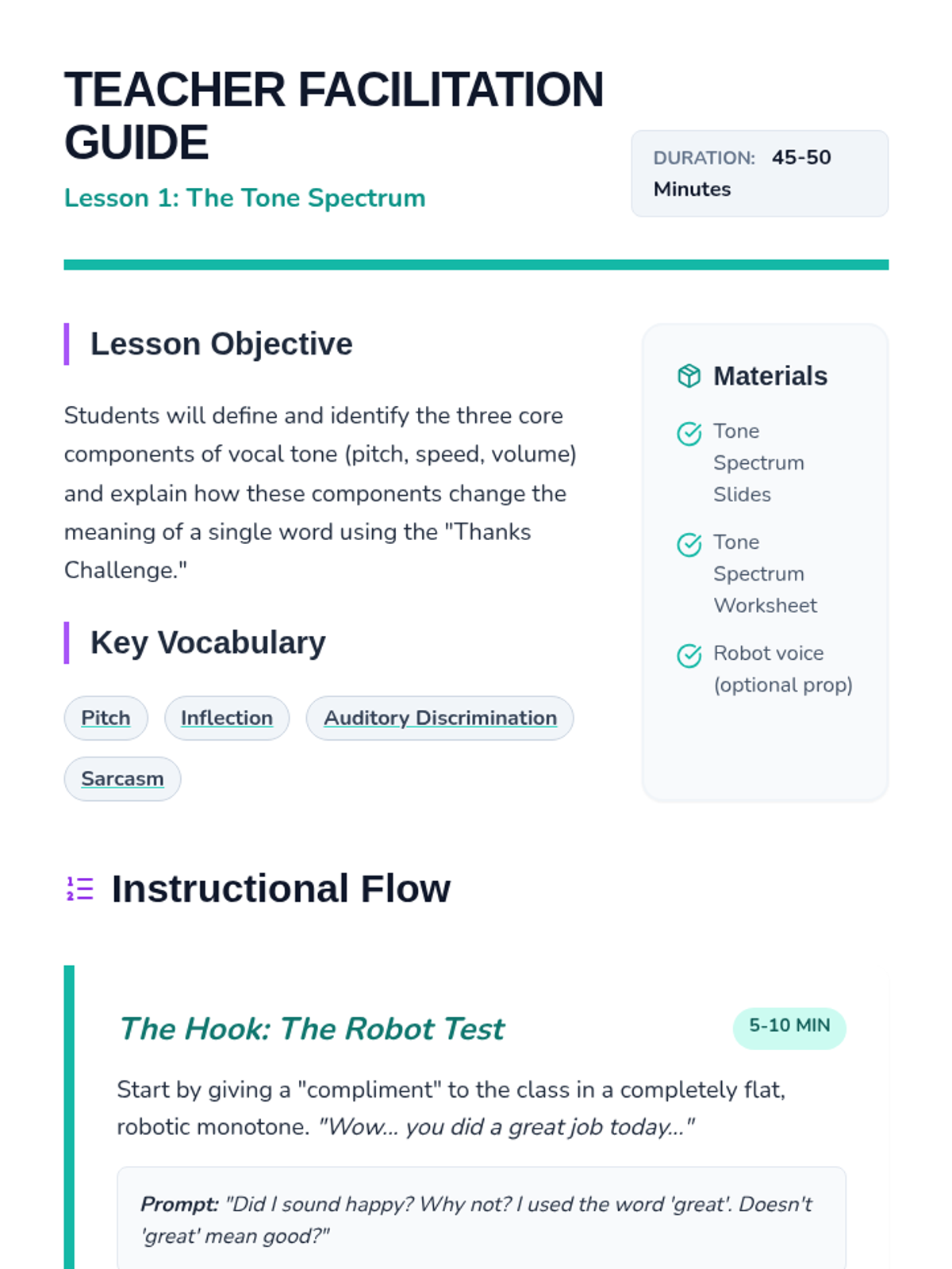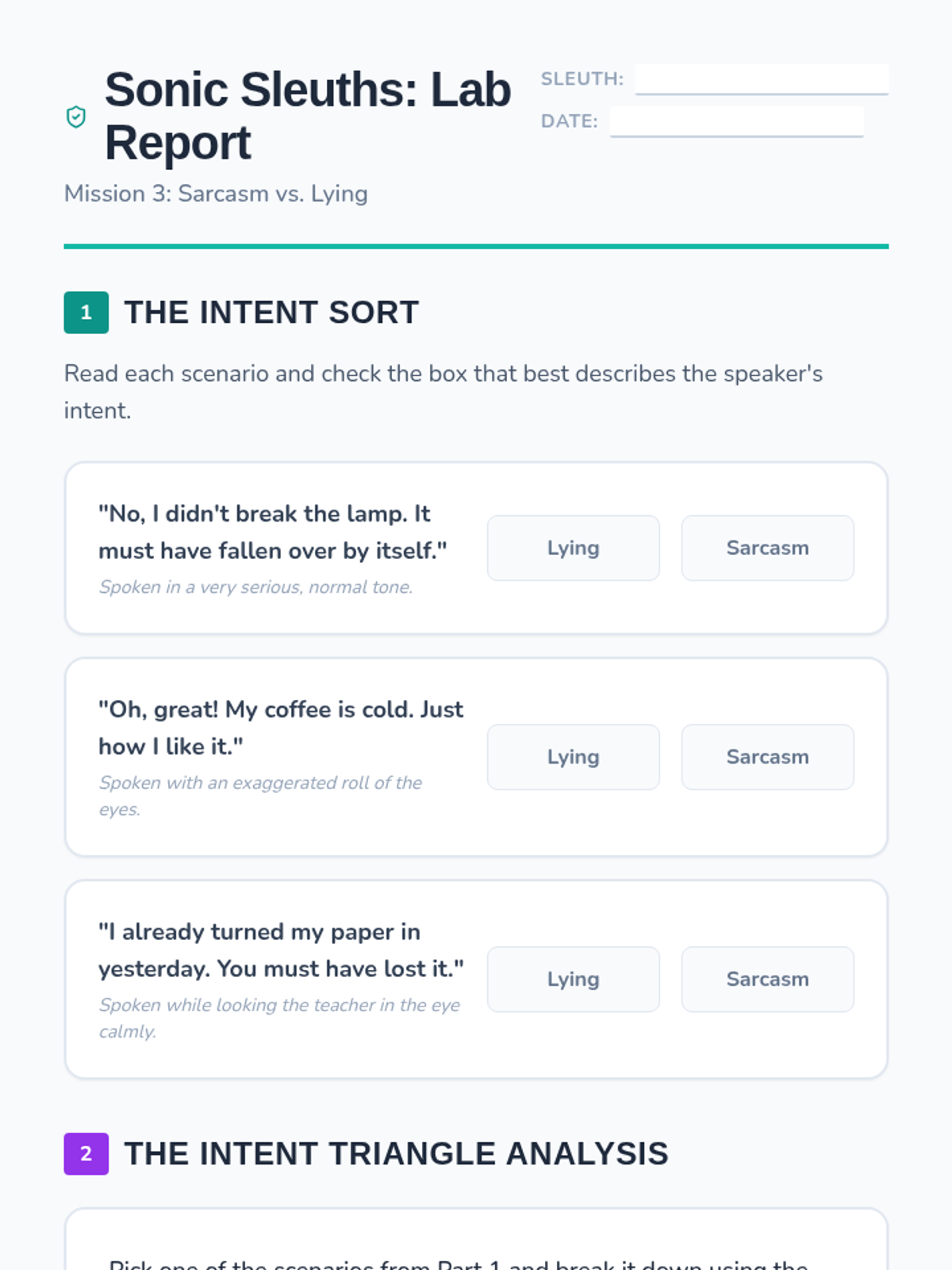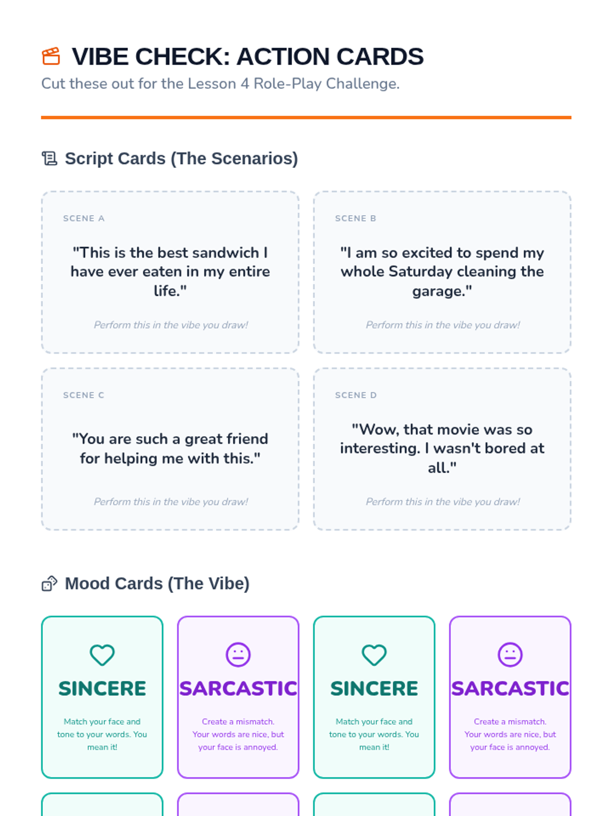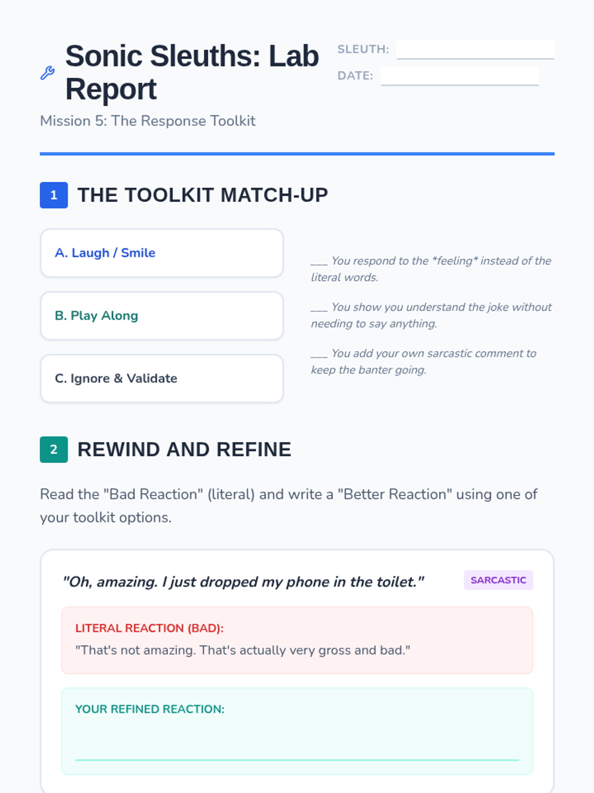A social communication sequence for 7th-grade students focused on interpreting sarcasm and vocal tone. Students learn to identify 'mismatches' between verbal and non-verbal cues to understand the underlying meaning of social interactions.
