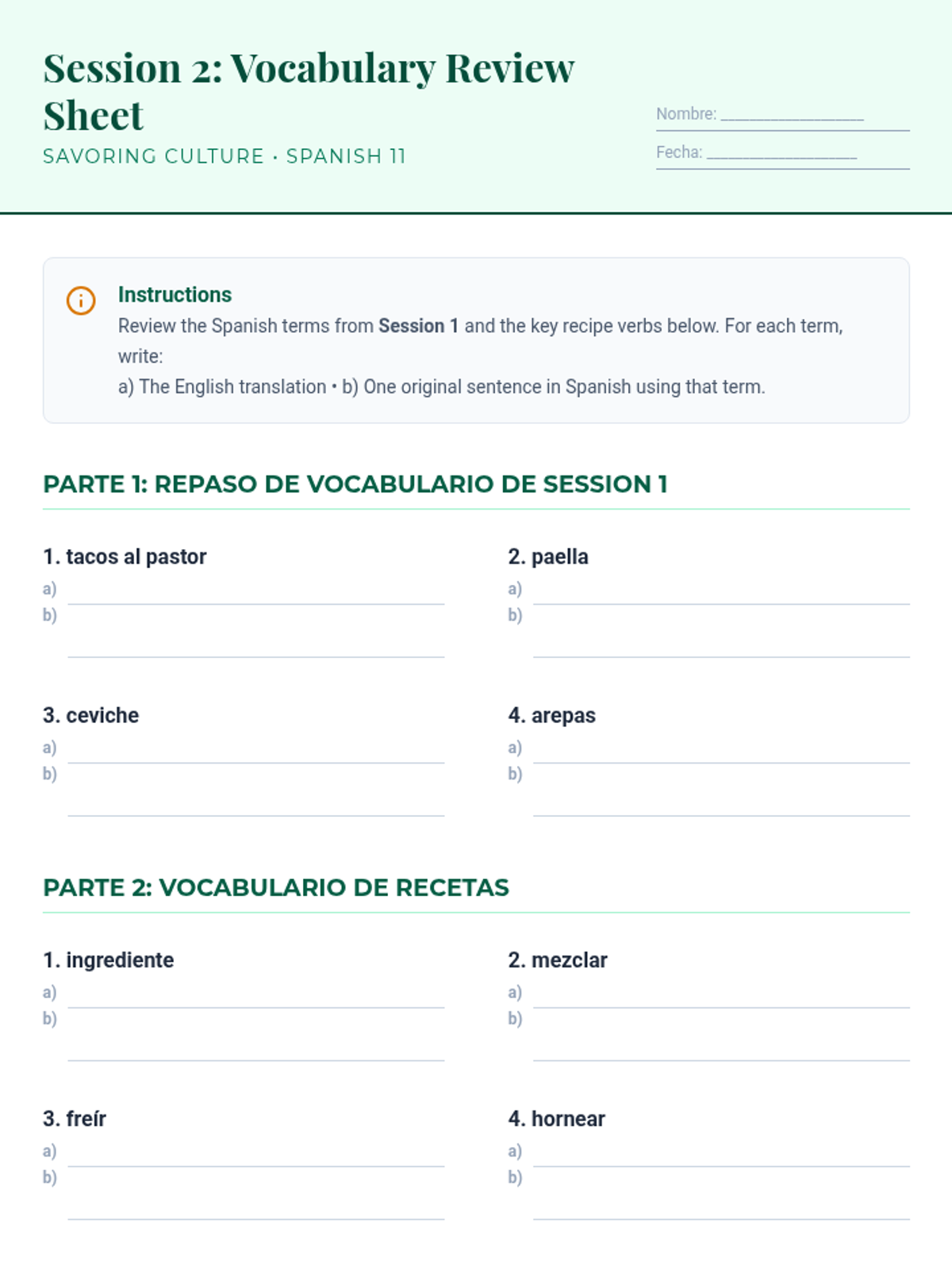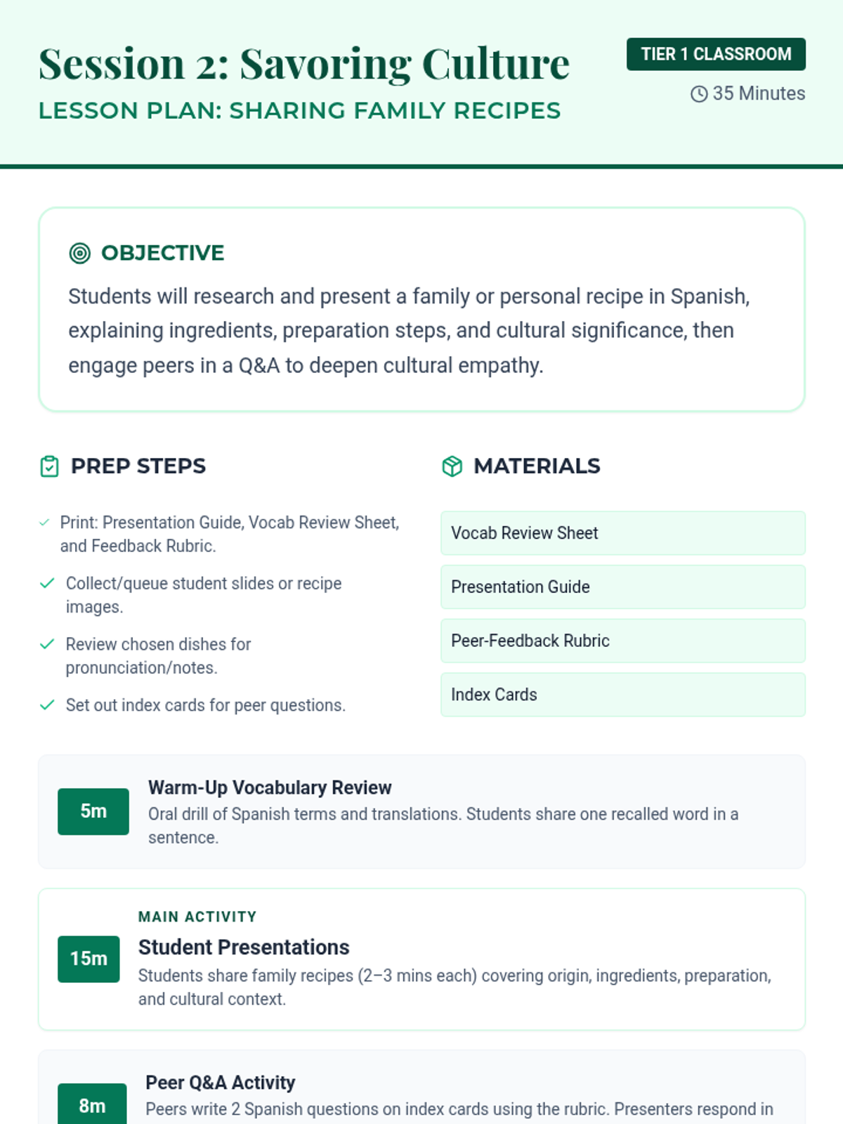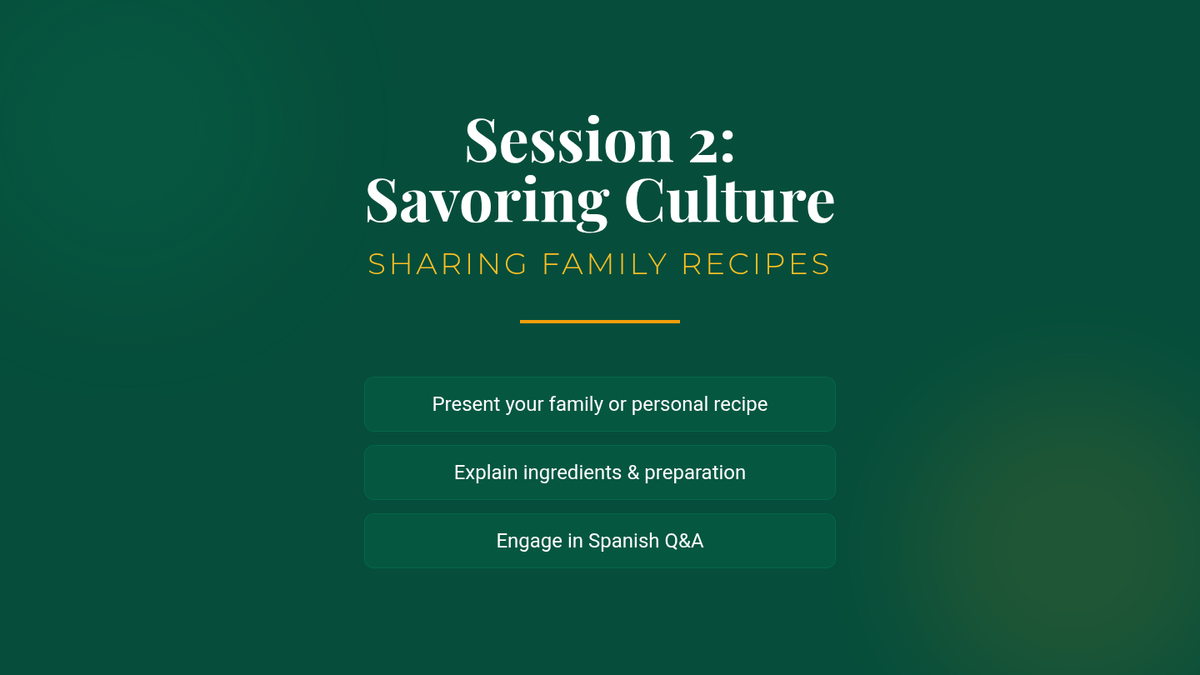 A two-part Spanish immersion sequence for 11th graders exploring the intersection of culinary traditions, identity, and empathy. Students develop vocabulary for diverse cultural dishes and share personal family recipes.