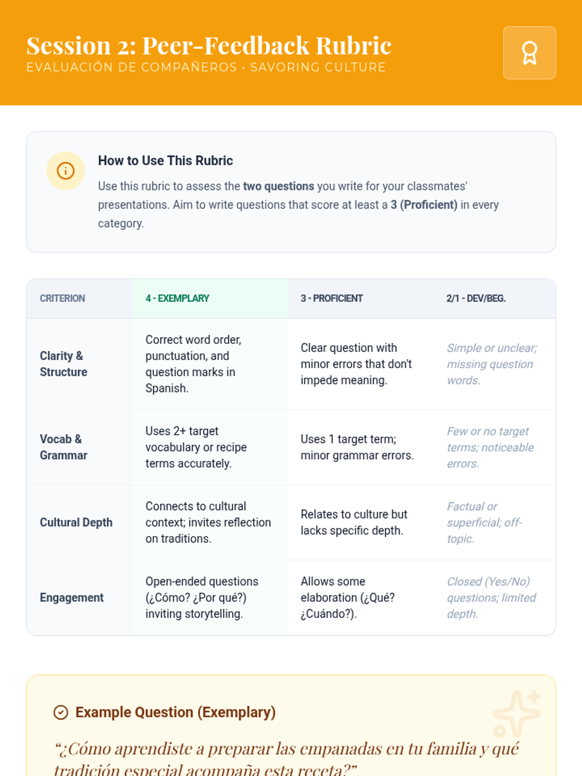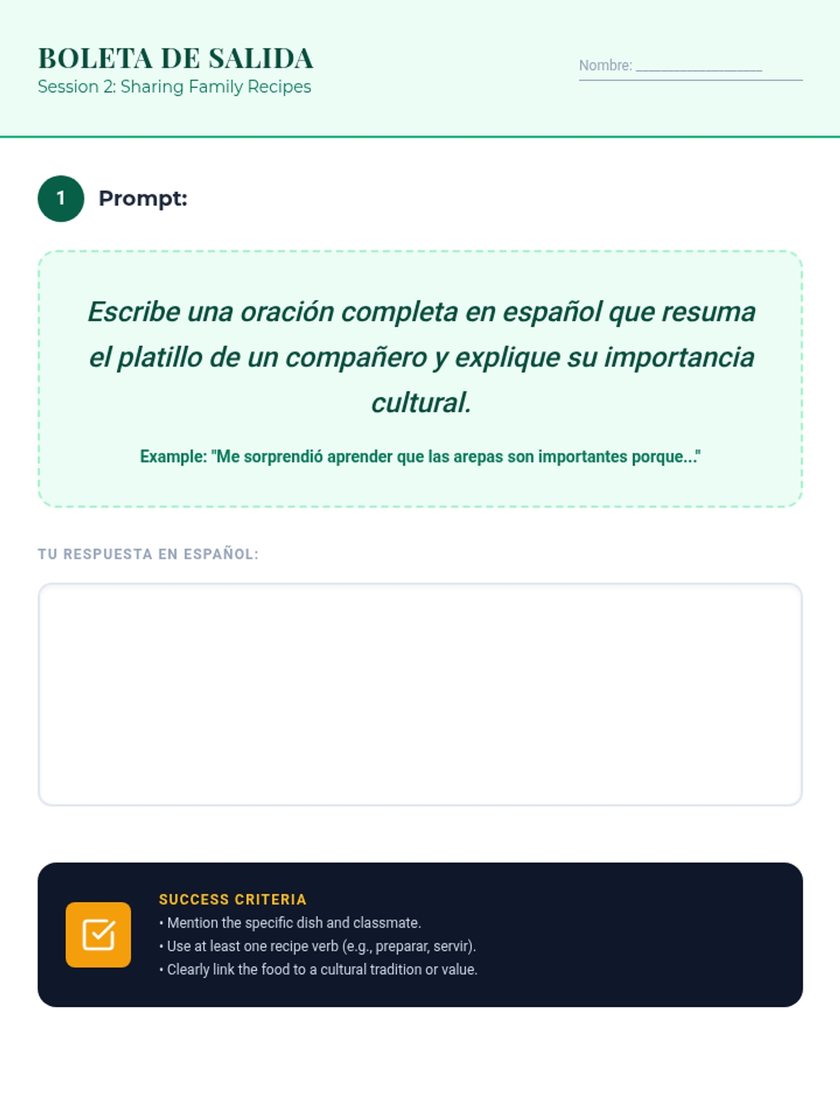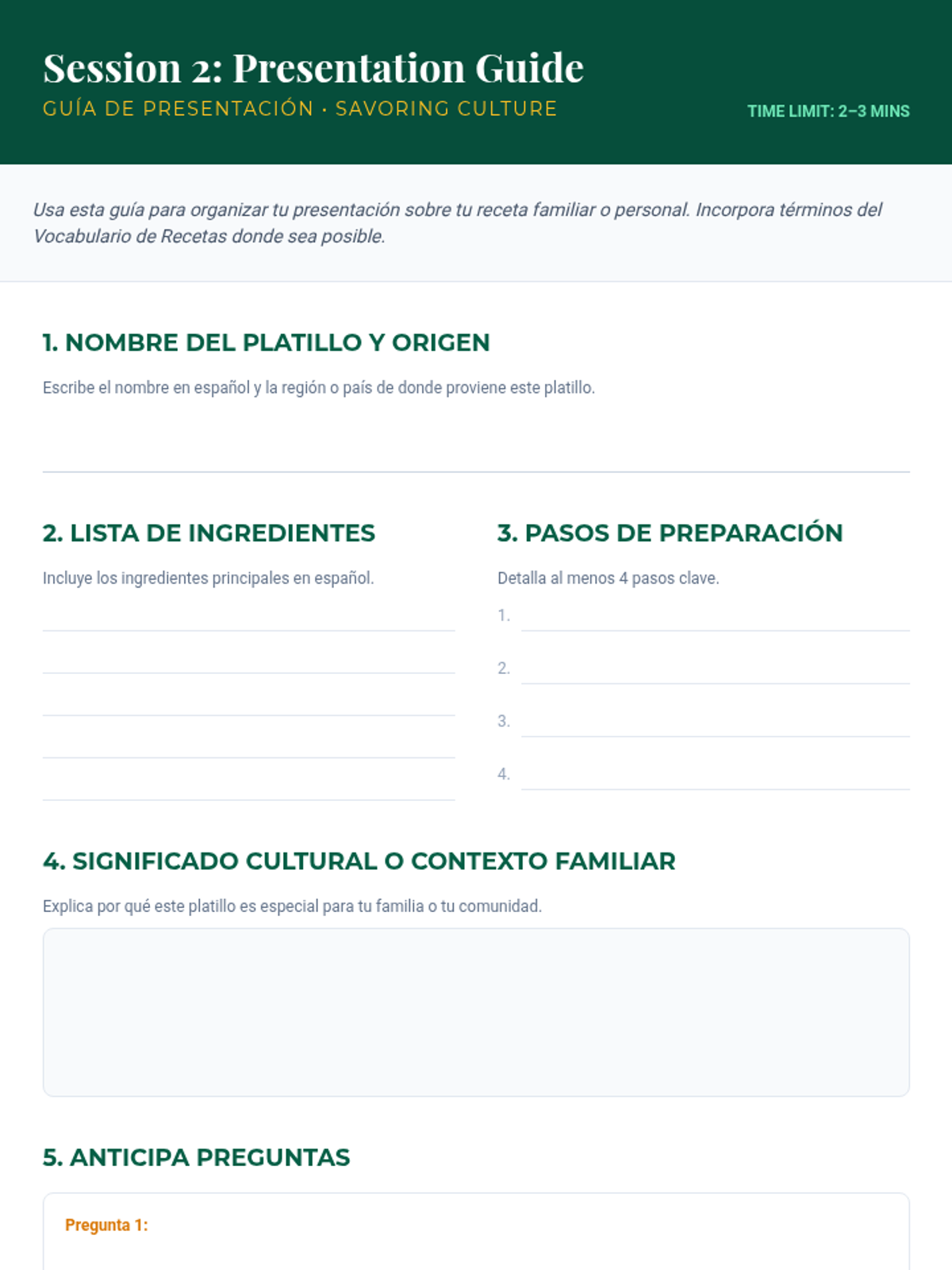 A two-part Spanish immersion sequence for 11th graders exploring the intersection of culinary traditions, identity, and empathy. Students develop vocabulary for diverse cultural dishes and share personal family recipes.