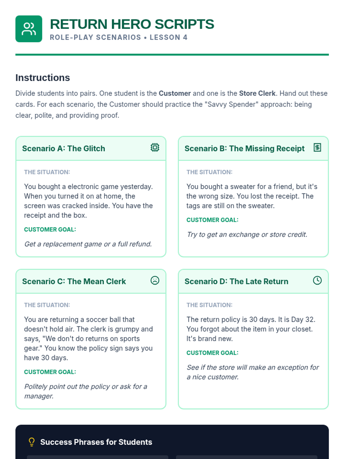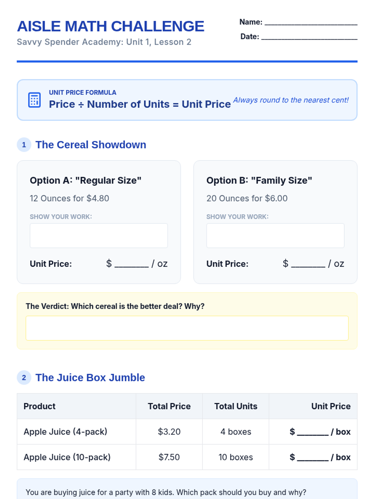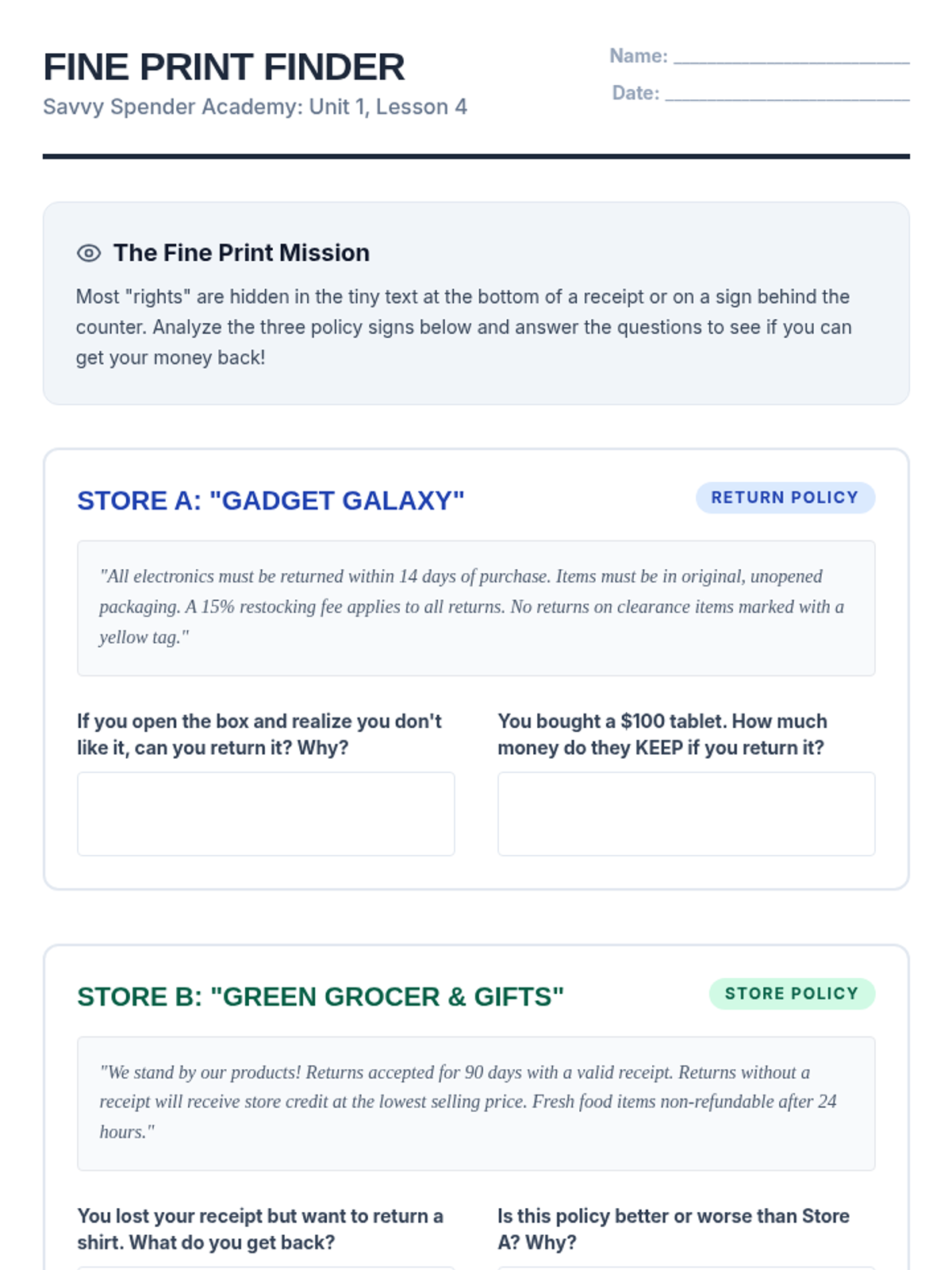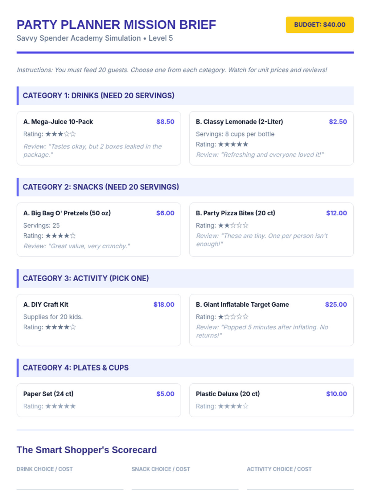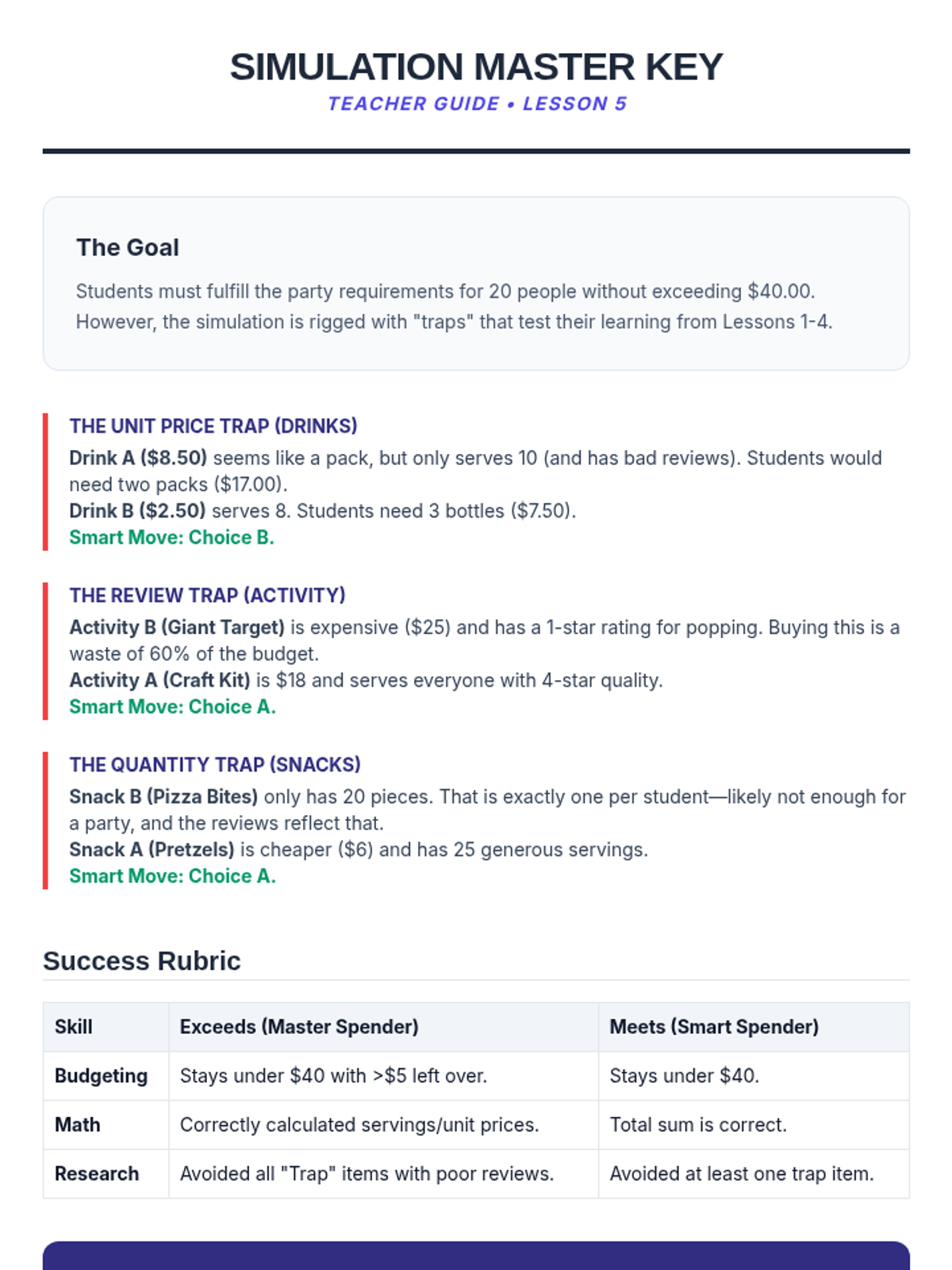 This financial literacy sequence for 5th graders focuses on essential consumer skills, including differentiating needs from wants, calculating unit prices, analyzing product reviews, and understanding consumer rights. Through simulations and mathematical application, students develop the critical thinking needed to make smart, value-driven purchasing decisions.