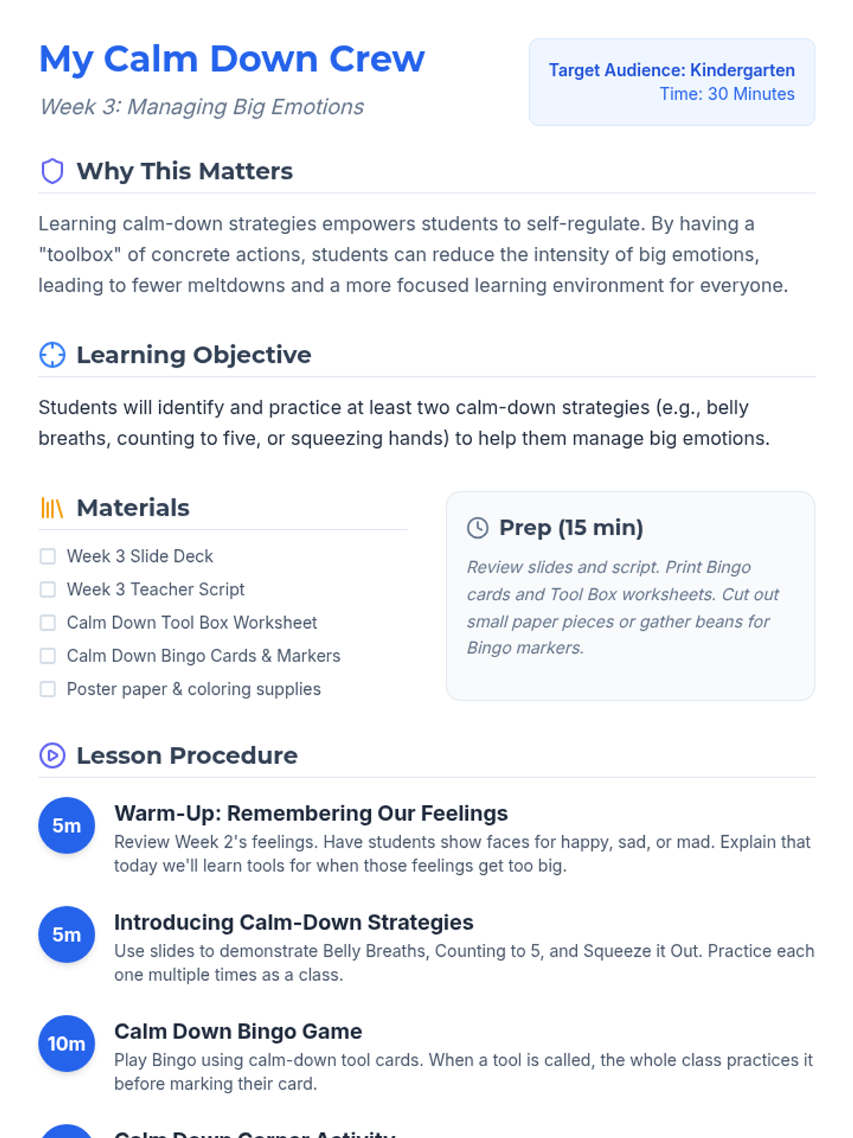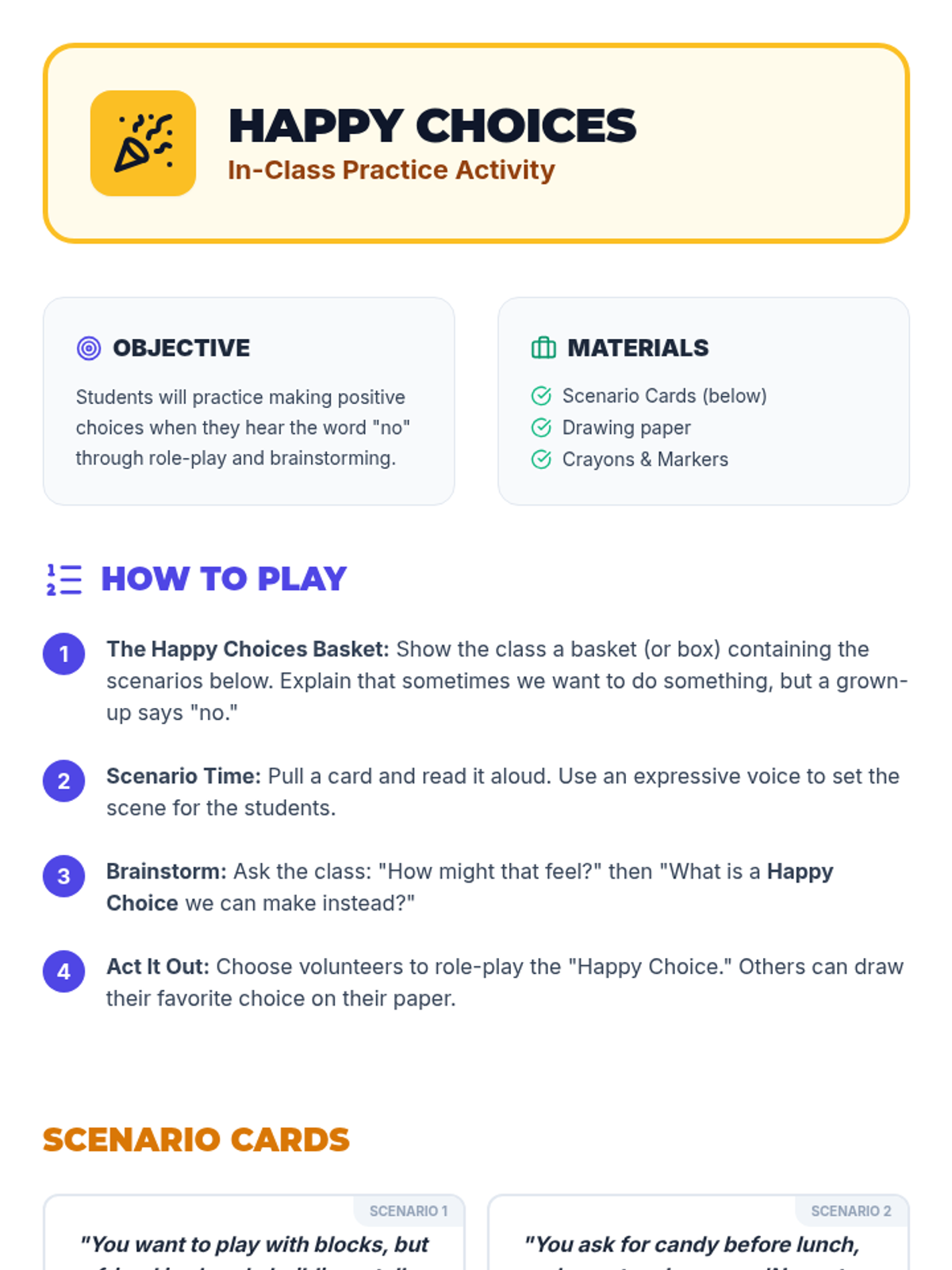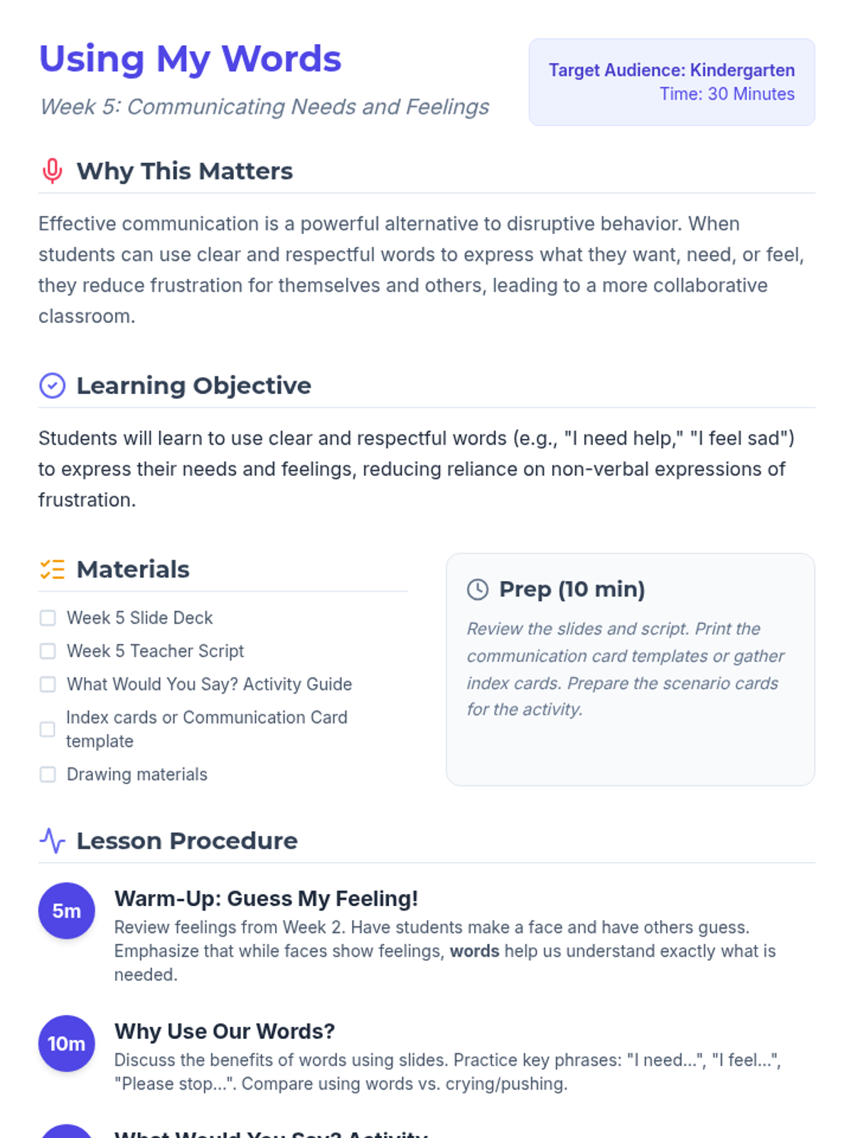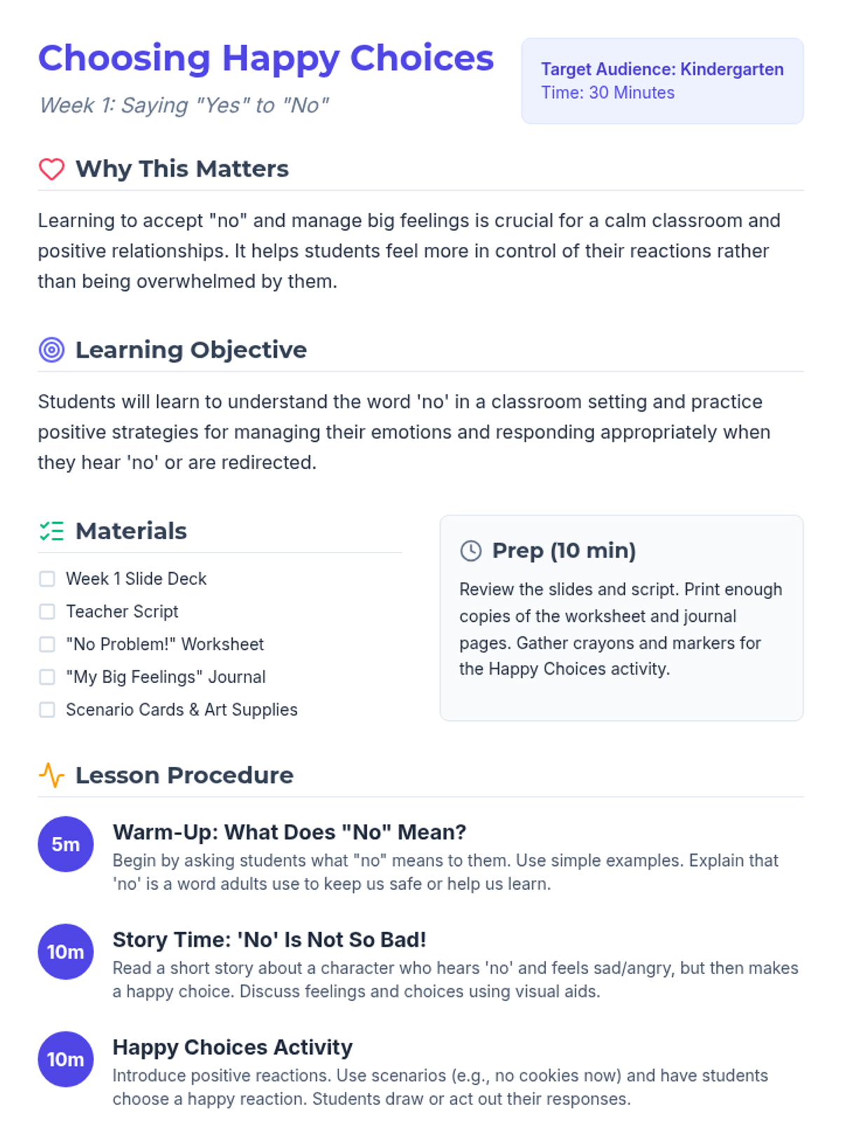 A five-week social-emotional learning sequence for Kindergarten students to develop self-regulation, communication, and cooperation skills. Students learn to respond positively to 'no', identify emotions, use calm-down strategies, share with peers, and use their words to express needs.