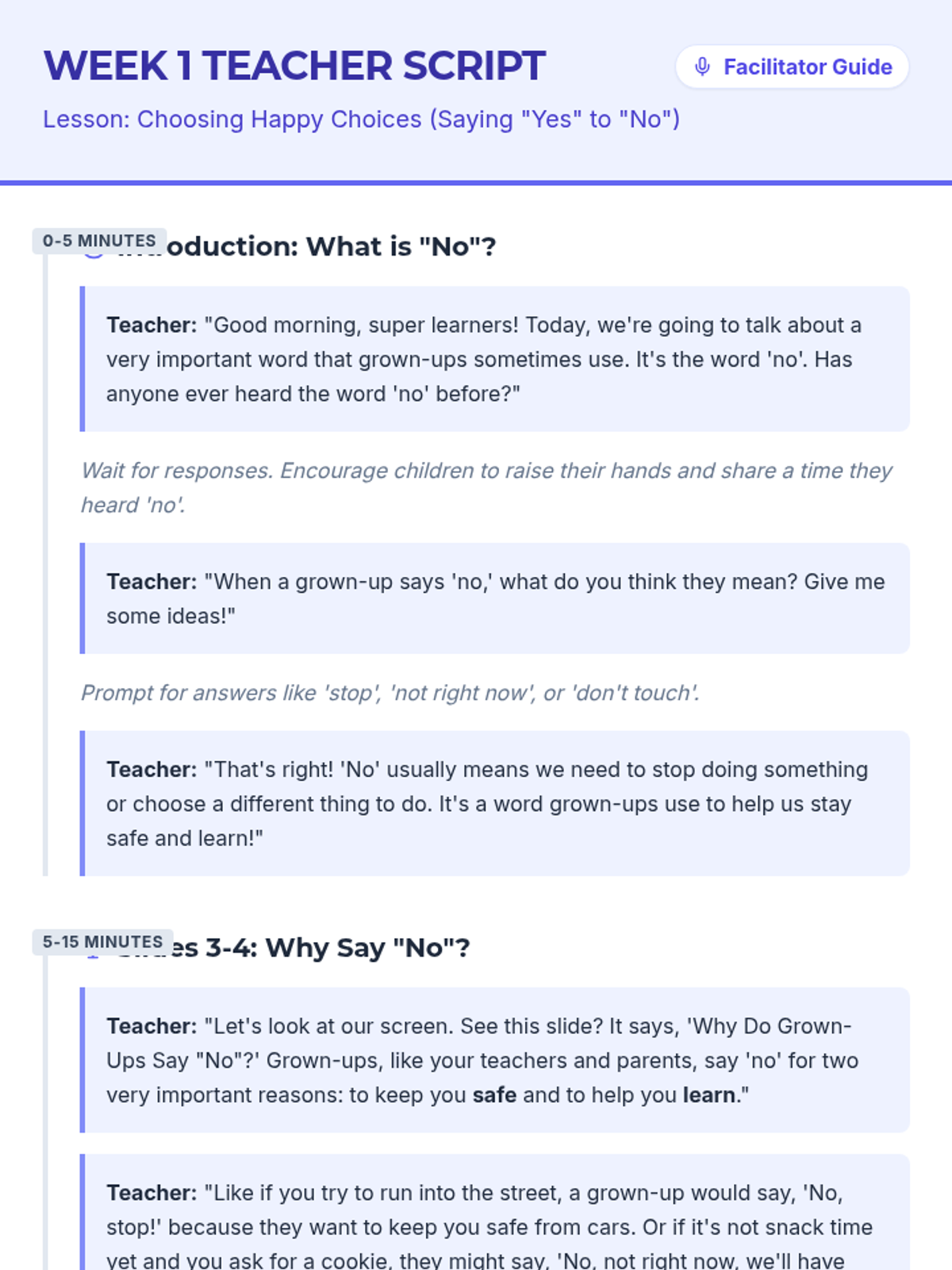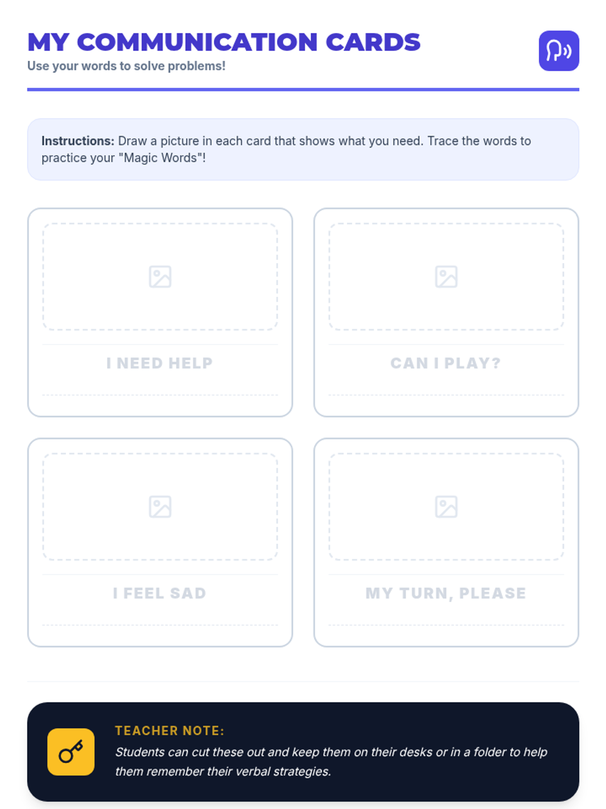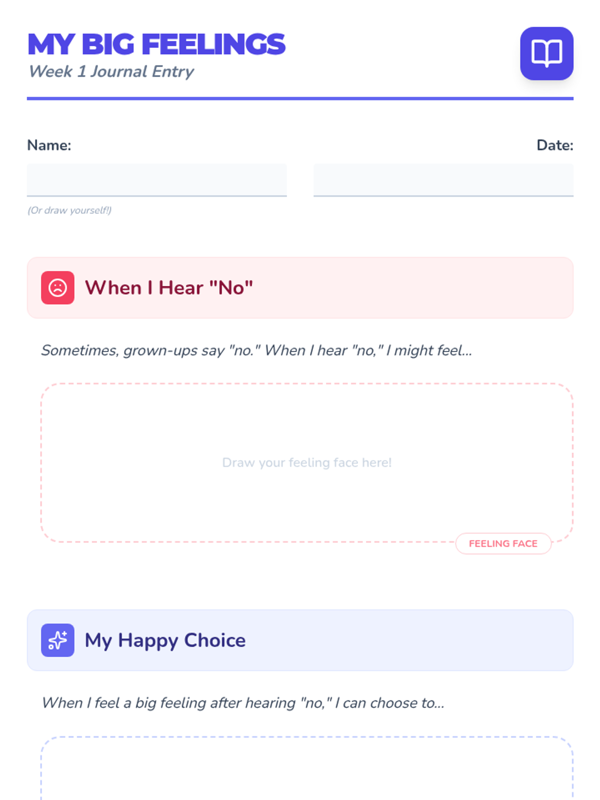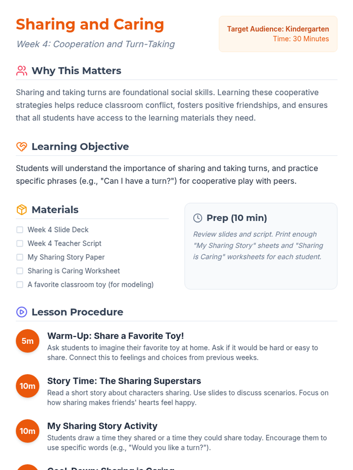 A five-week social-emotional learning sequence for Kindergarten students to develop self-regulation, communication, and cooperation skills. Students learn to respond positively to 'no', identify emotions, use calm-down strategies, share with peers, and use their words to express needs.