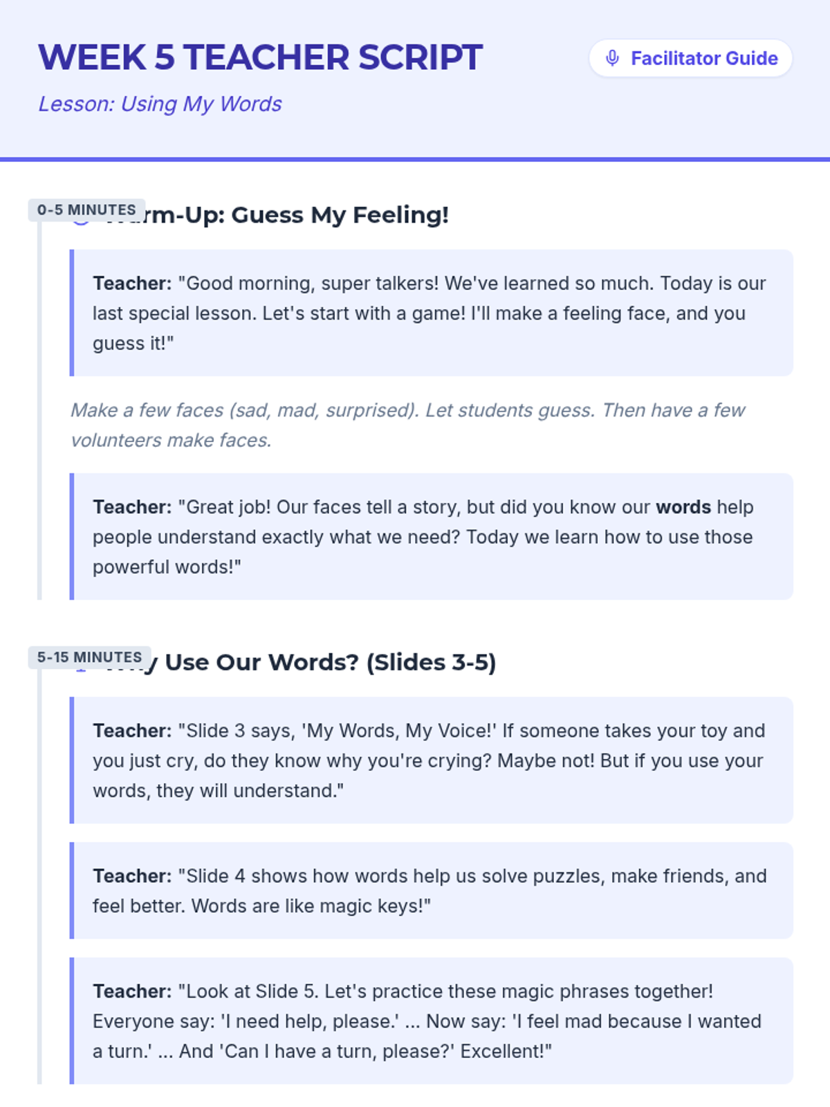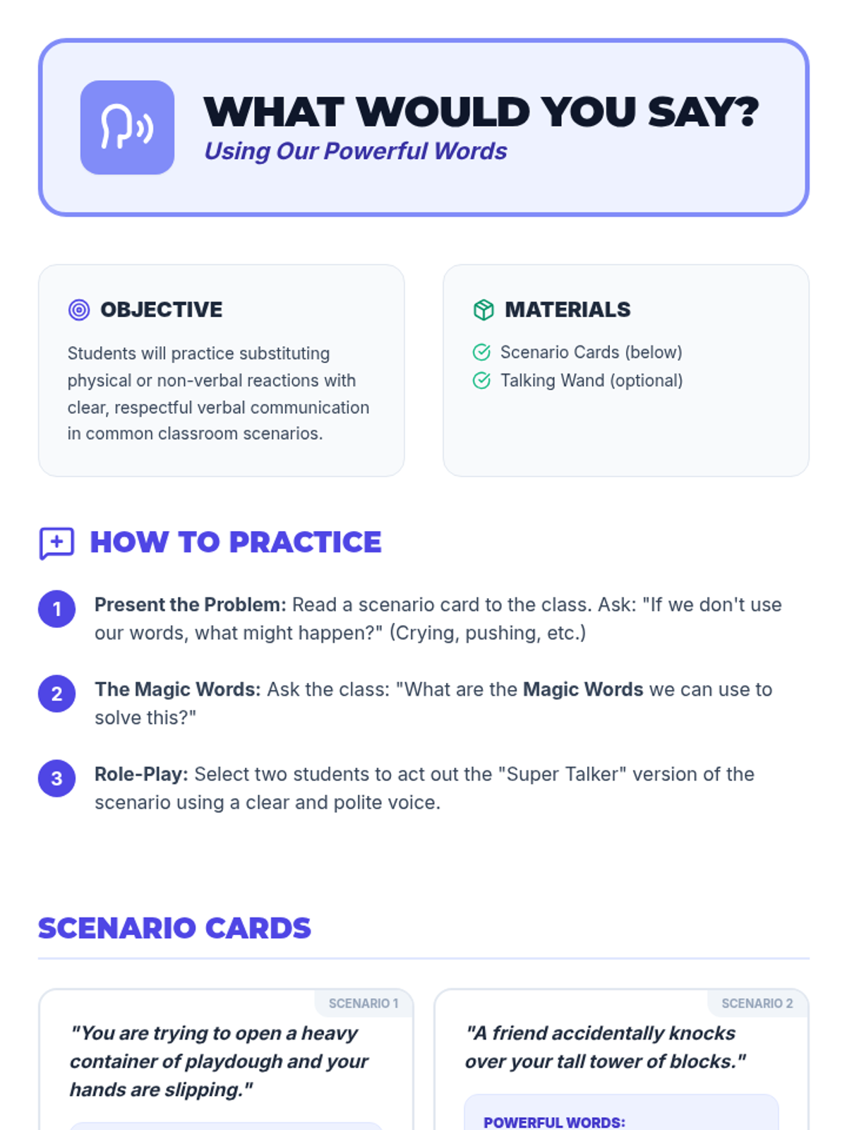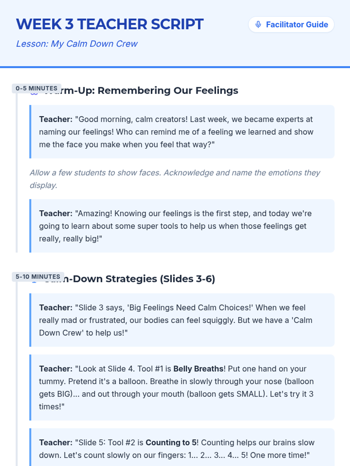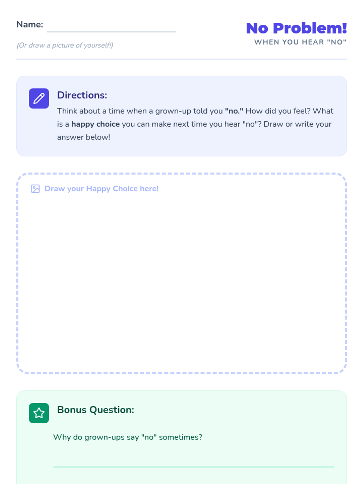 A five-week social-emotional learning sequence for Kindergarten students to develop self-regulation, communication, and cooperation skills. Students learn to respond positively to 'no', identify emotions, use calm-down strategies, share with peers, and use their words to express needs.