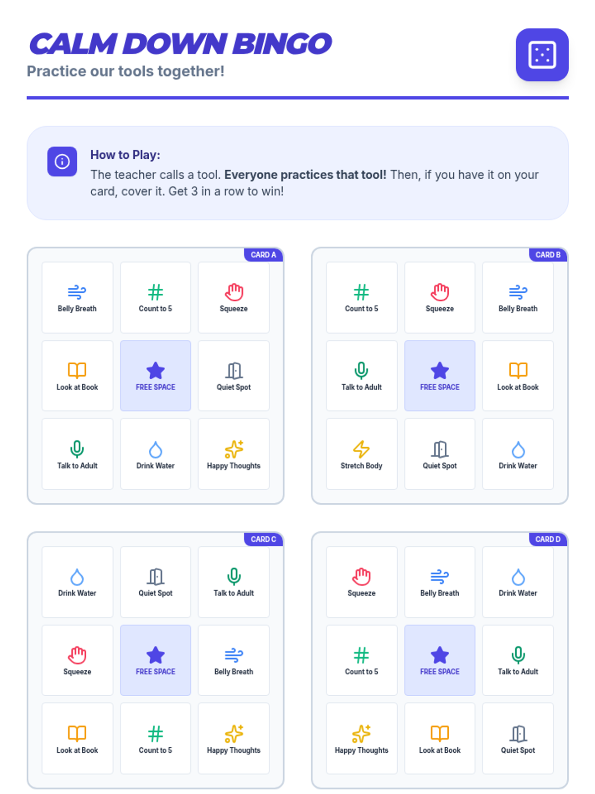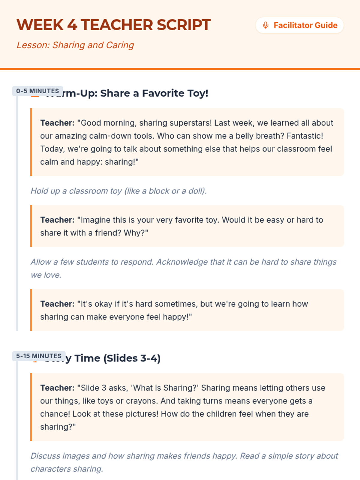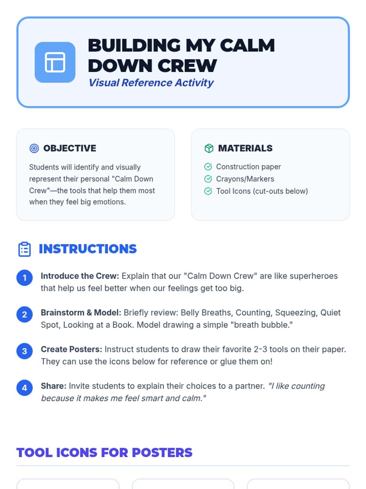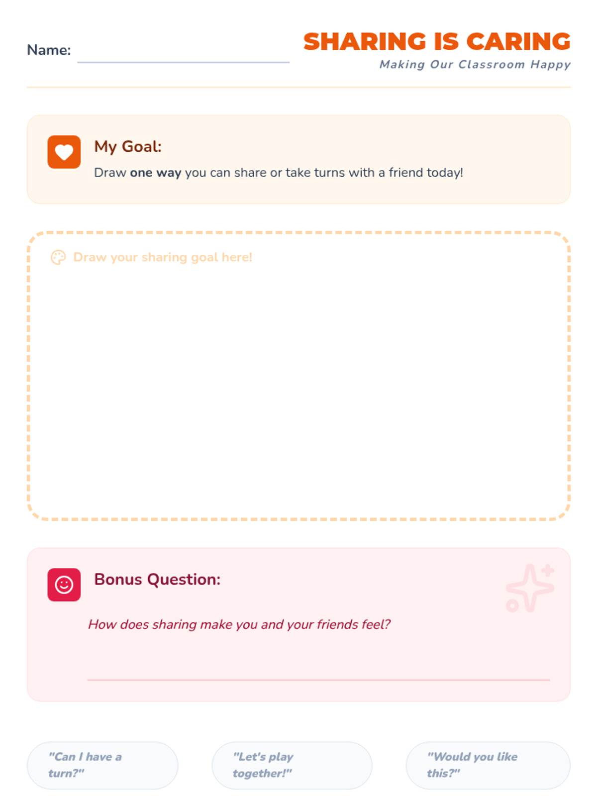 A five-week social-emotional learning sequence for Kindergarten students to develop self-regulation, communication, and cooperation skills. Students learn to respond positively to 'no', identify emotions, use calm-down strategies, share with peers, and use their words to express needs.