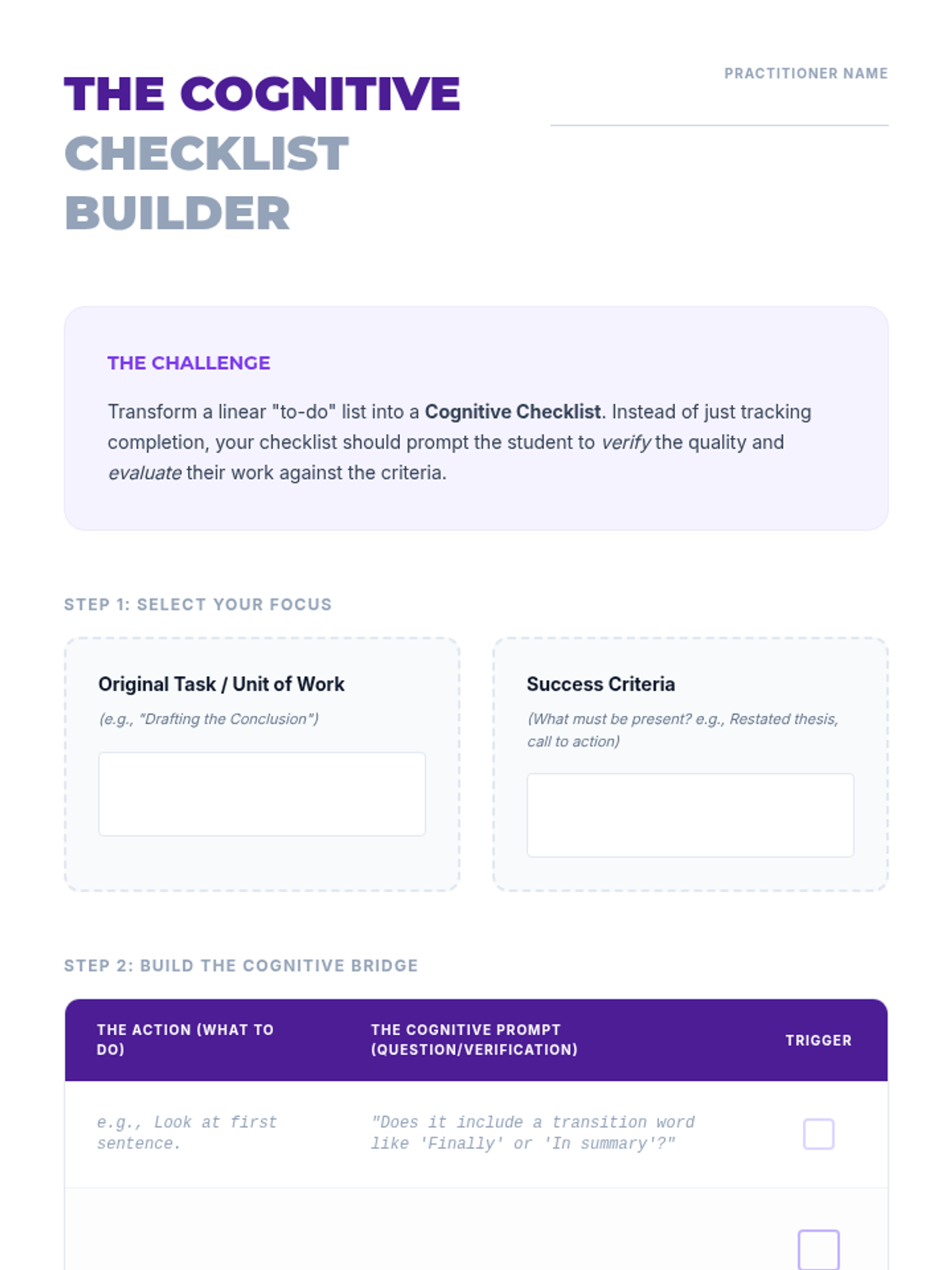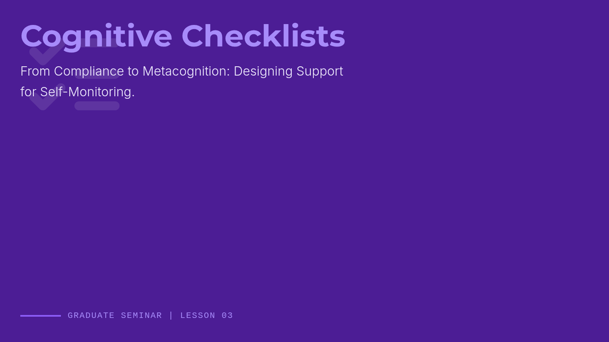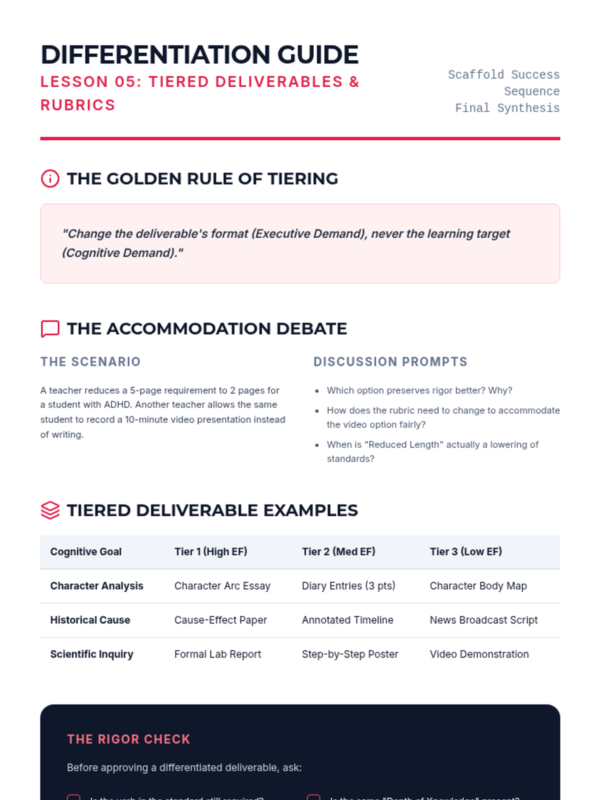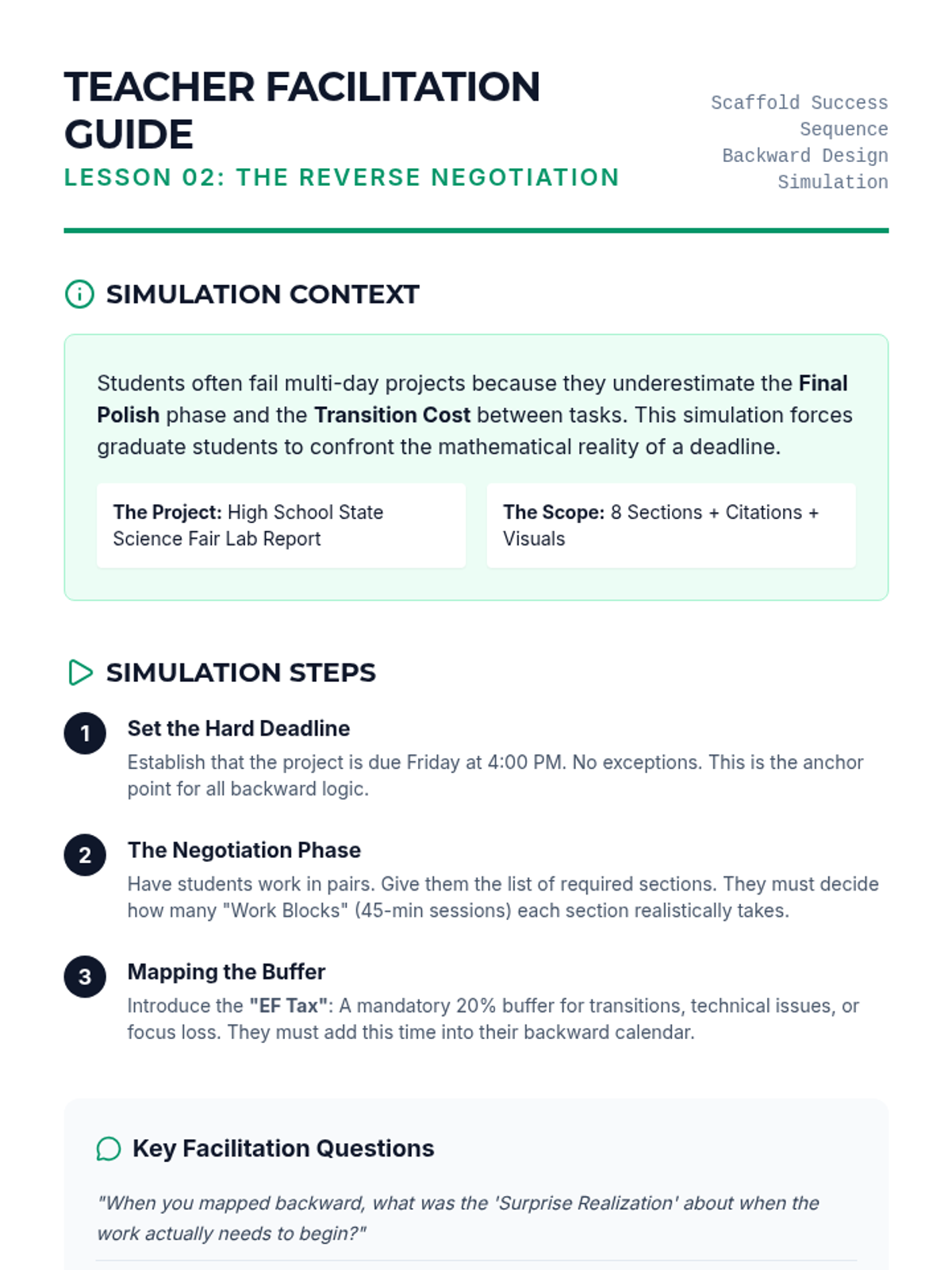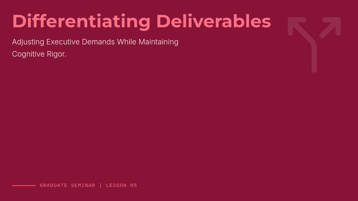 A graduate-level course on scaffolding complex, multi-day projects for students with executive functioning deficits. Participants learn to apply task analysis, backward design, and metacognitive prompting to reduce executive load while maintaining academic rigor.
