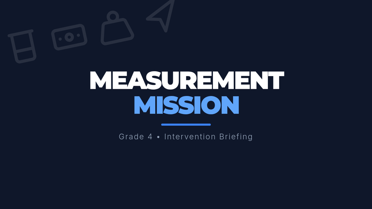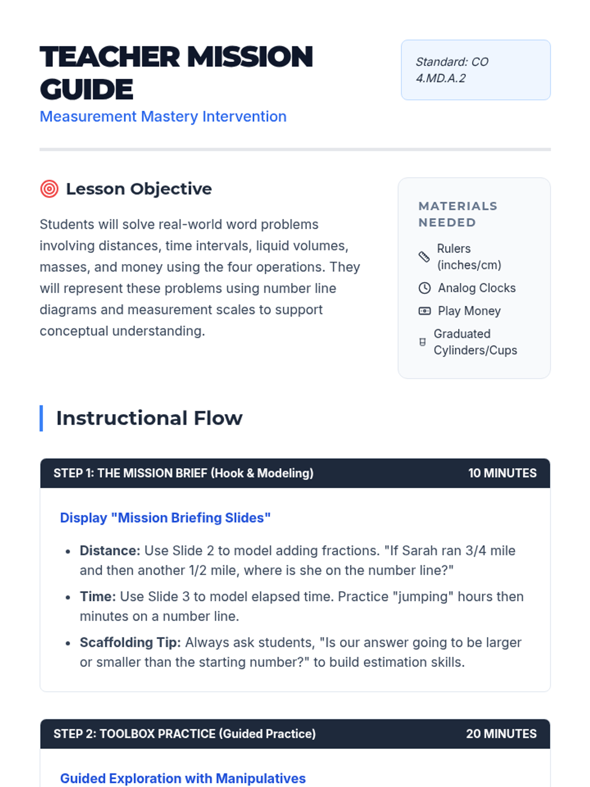 A Tier 2 intervention sequence focused on solving measurement word problems involving distance, time, volume, mass, and money. Students use number lines and manipulatives to master complex multi-step problems with fractions and decimals.