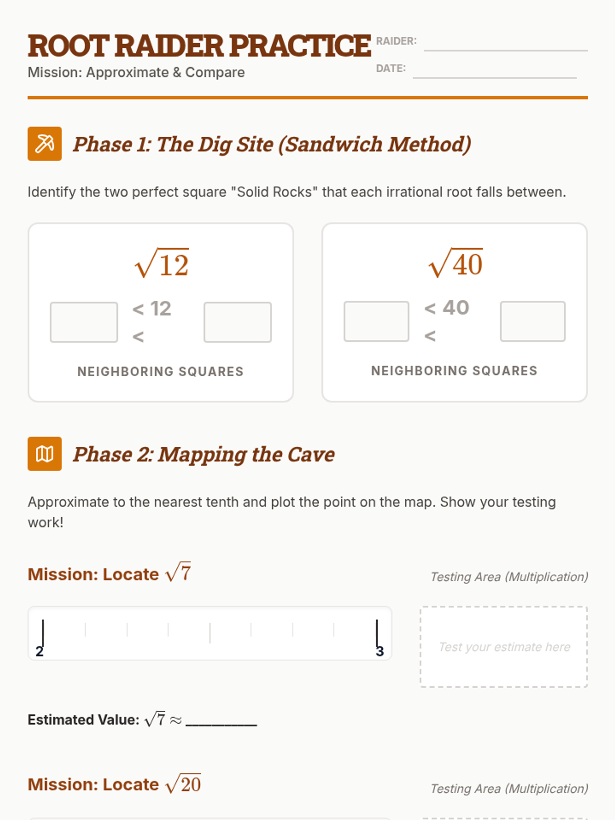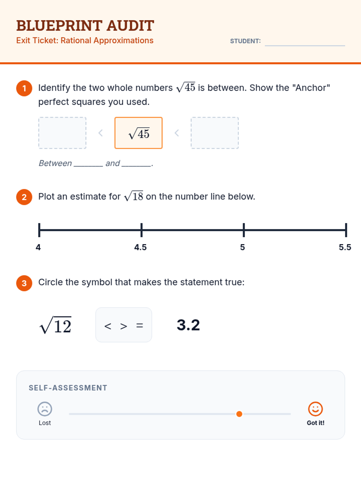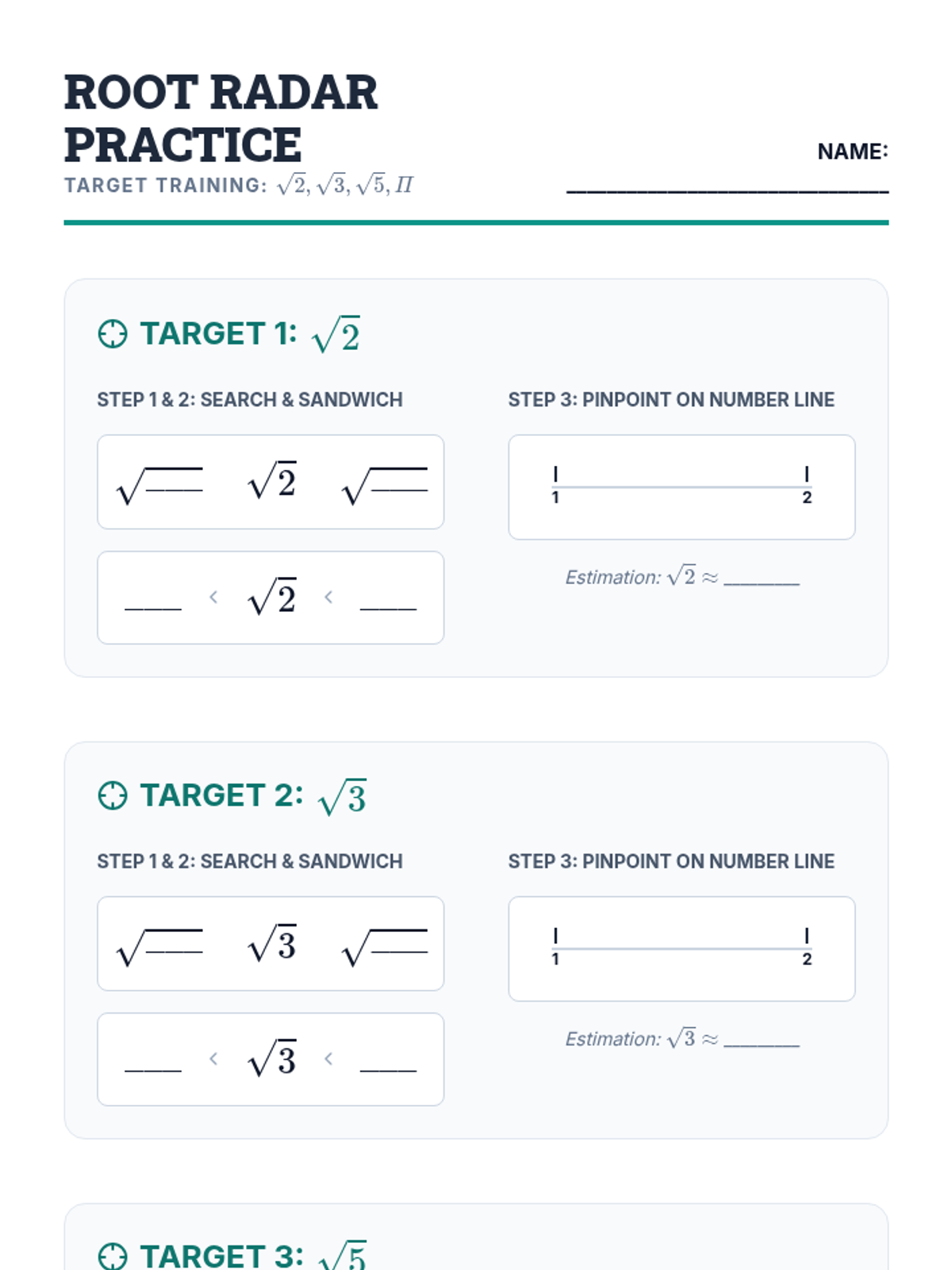 A targeted intervention sequence for Grade 8 students to master estimating irrational numbers like square roots and pi, placing them accurately on number lines between rational benchmarks.
