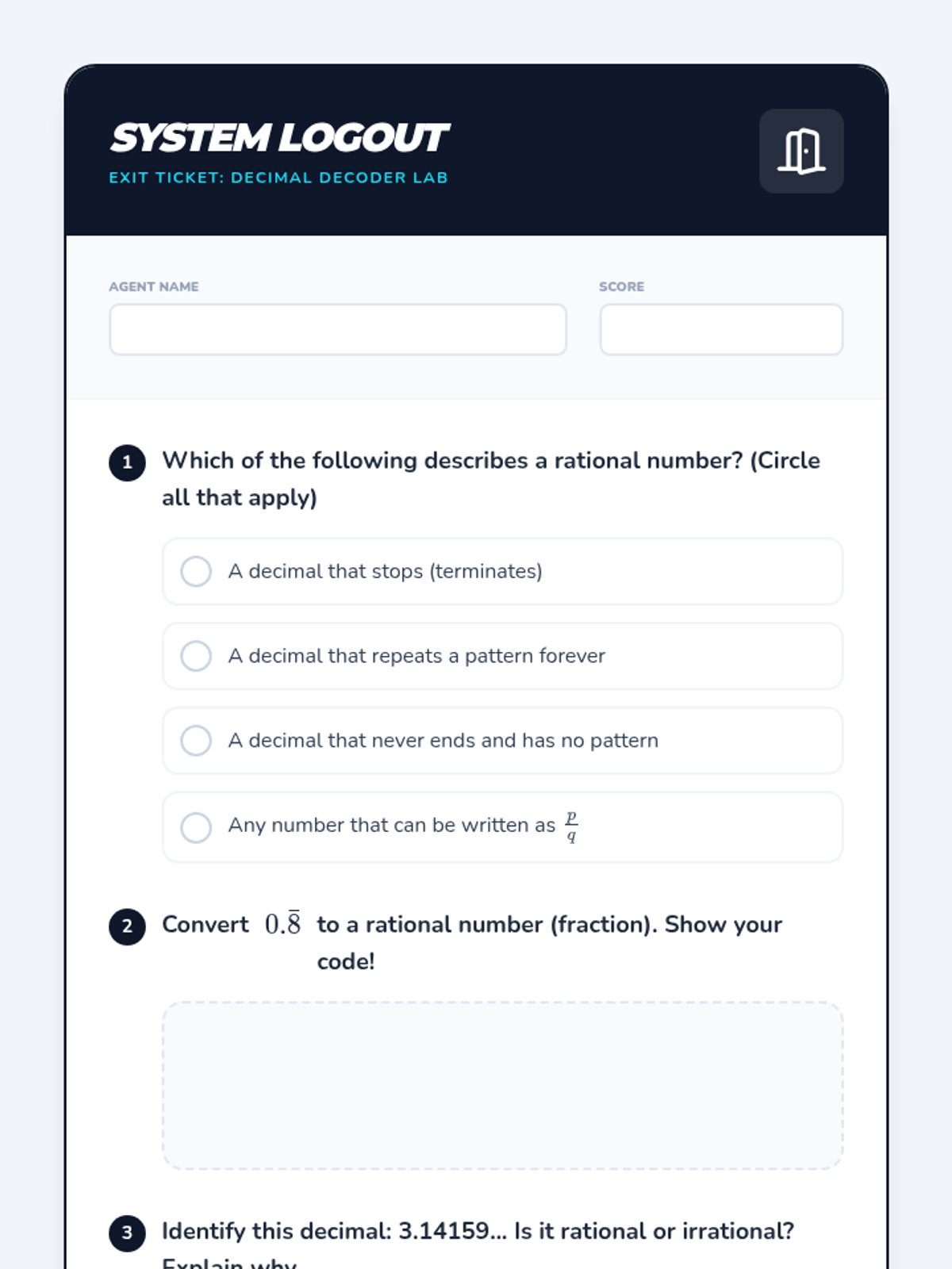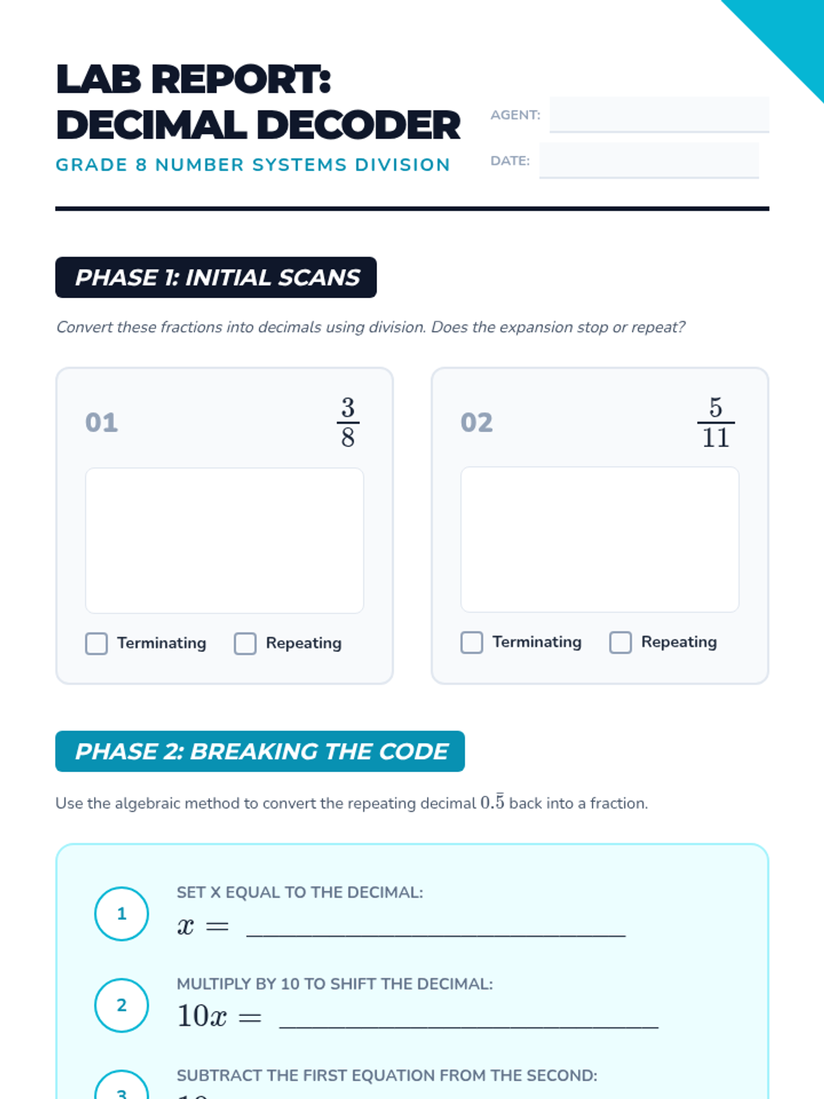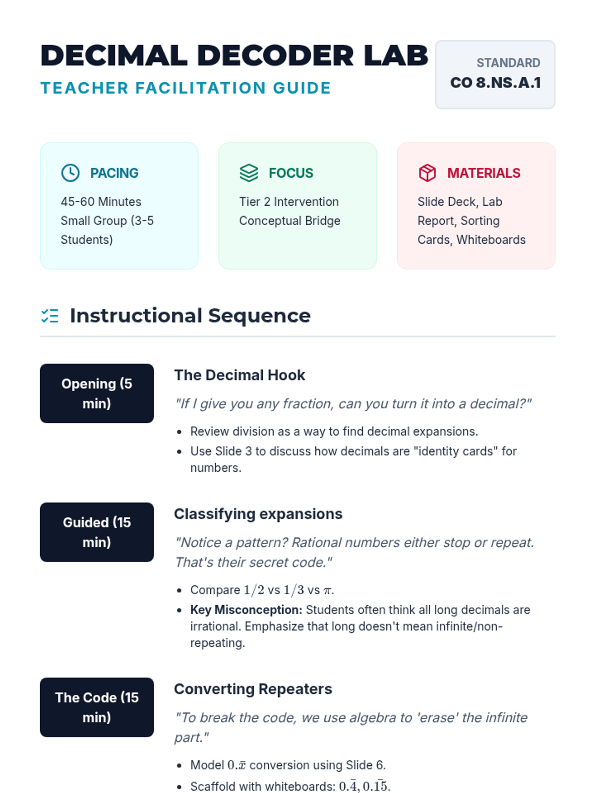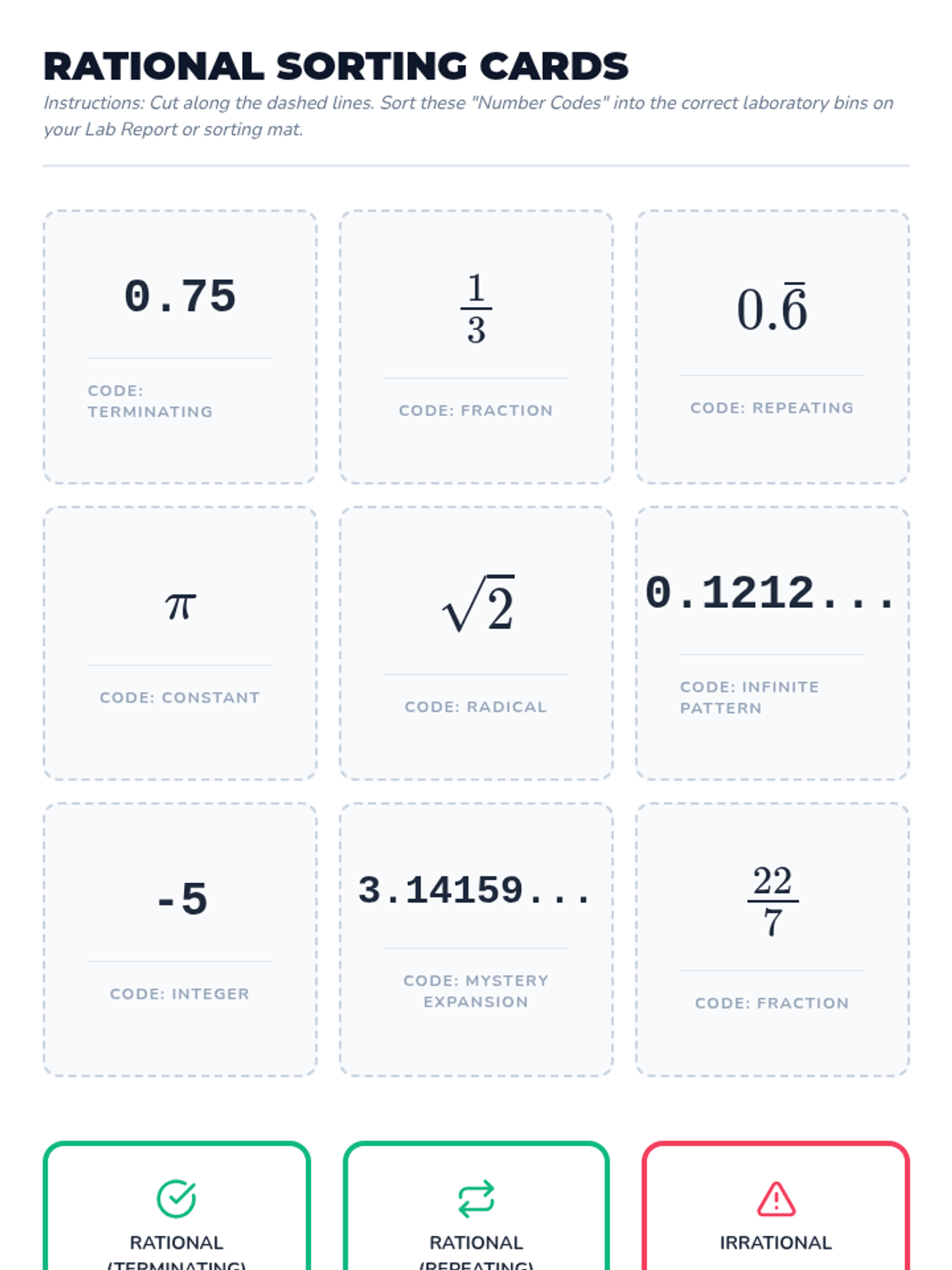 A specialized intervention sequence designed for Grade 8 students to build a conceptual foundation in the real number system, focusing on the distinction between rational (repeating/terminating) and irrational numbers using CRA methods.