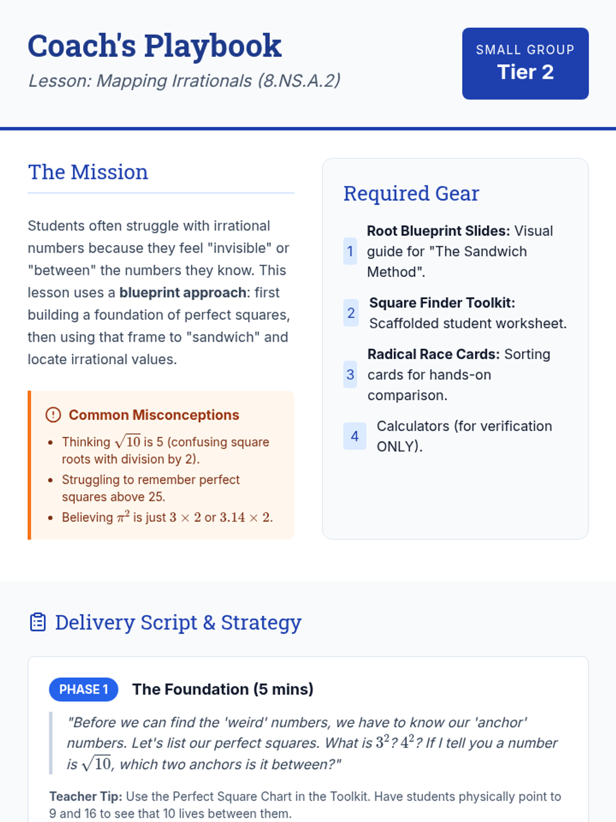 A specialized intervention sequence focused on helping 8th-grade students master the approximation and comparison of irrational numbers using visual models and estimation strategies.