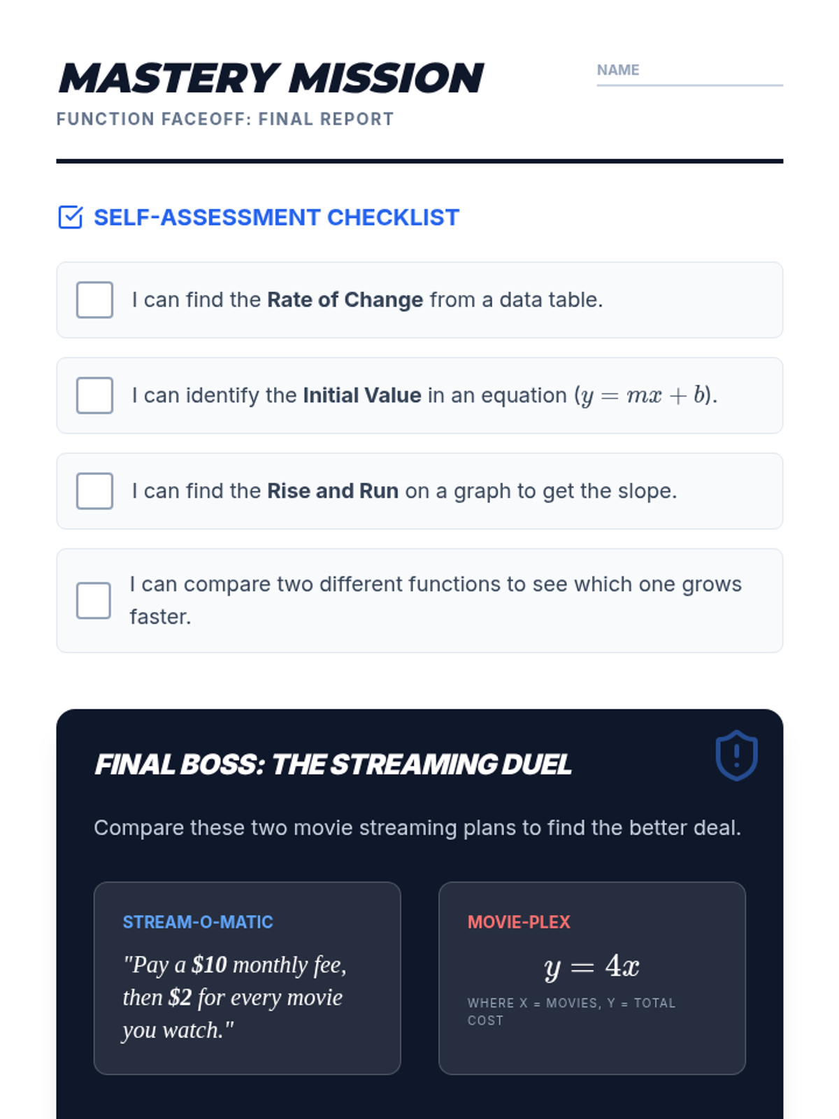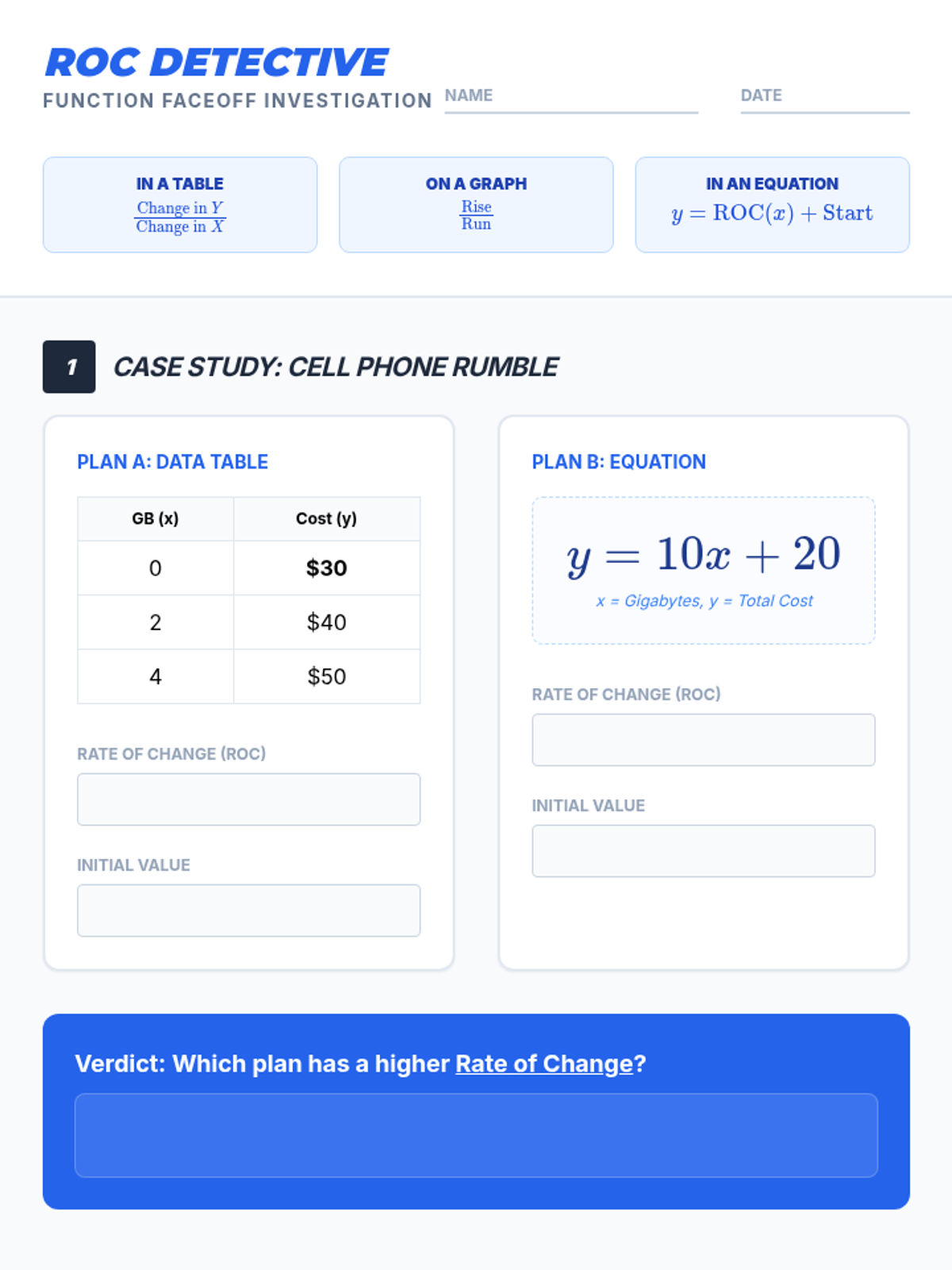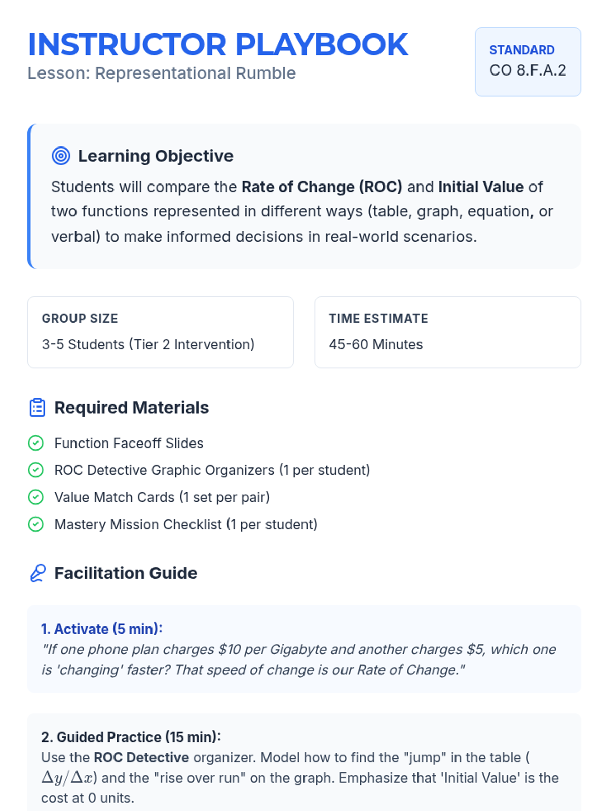A Tier 2 intervention unit focused on comparing linear functions across different representations (tables, graphs, equations, and verbal descriptions) using real-world contexts.